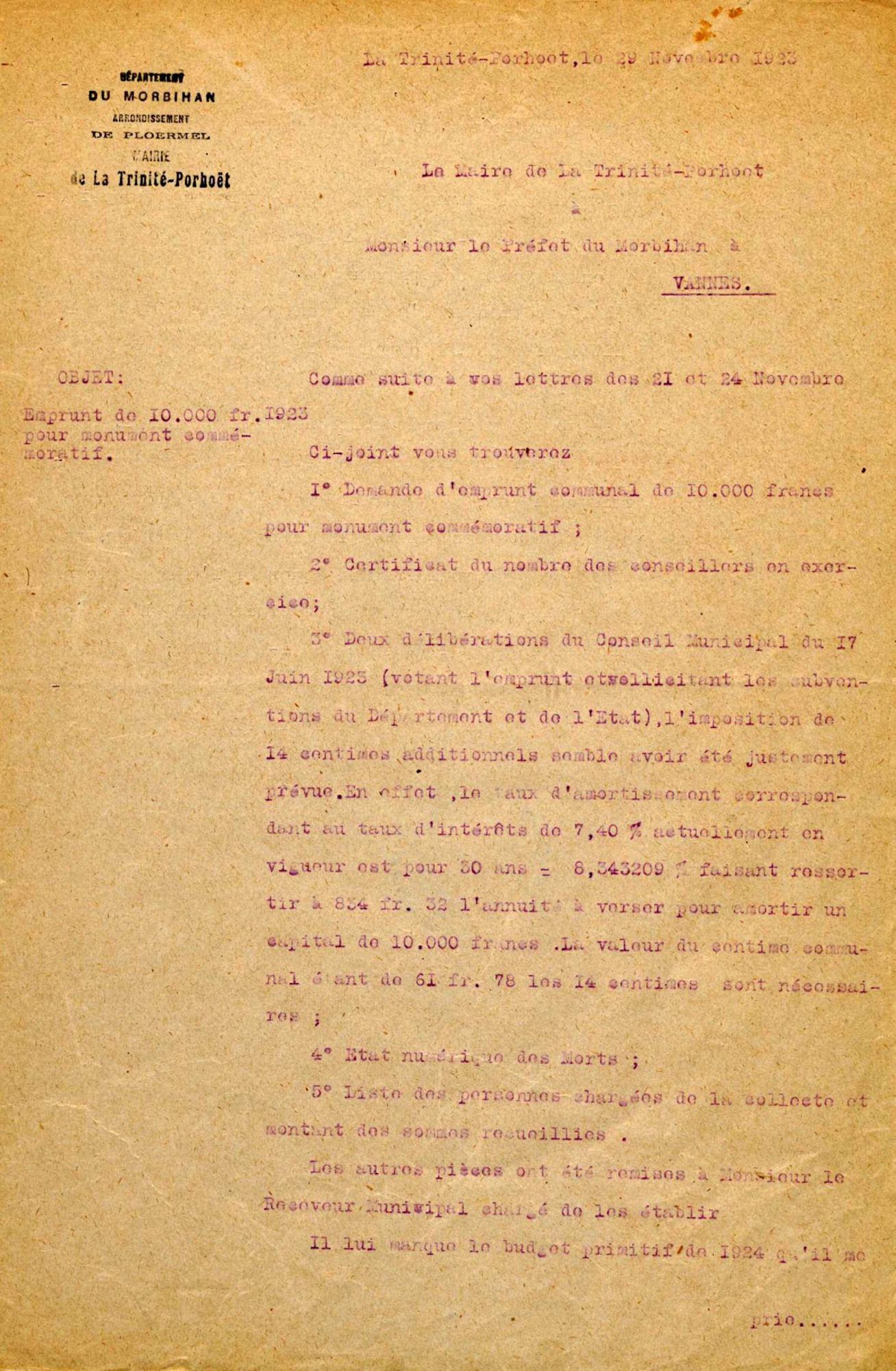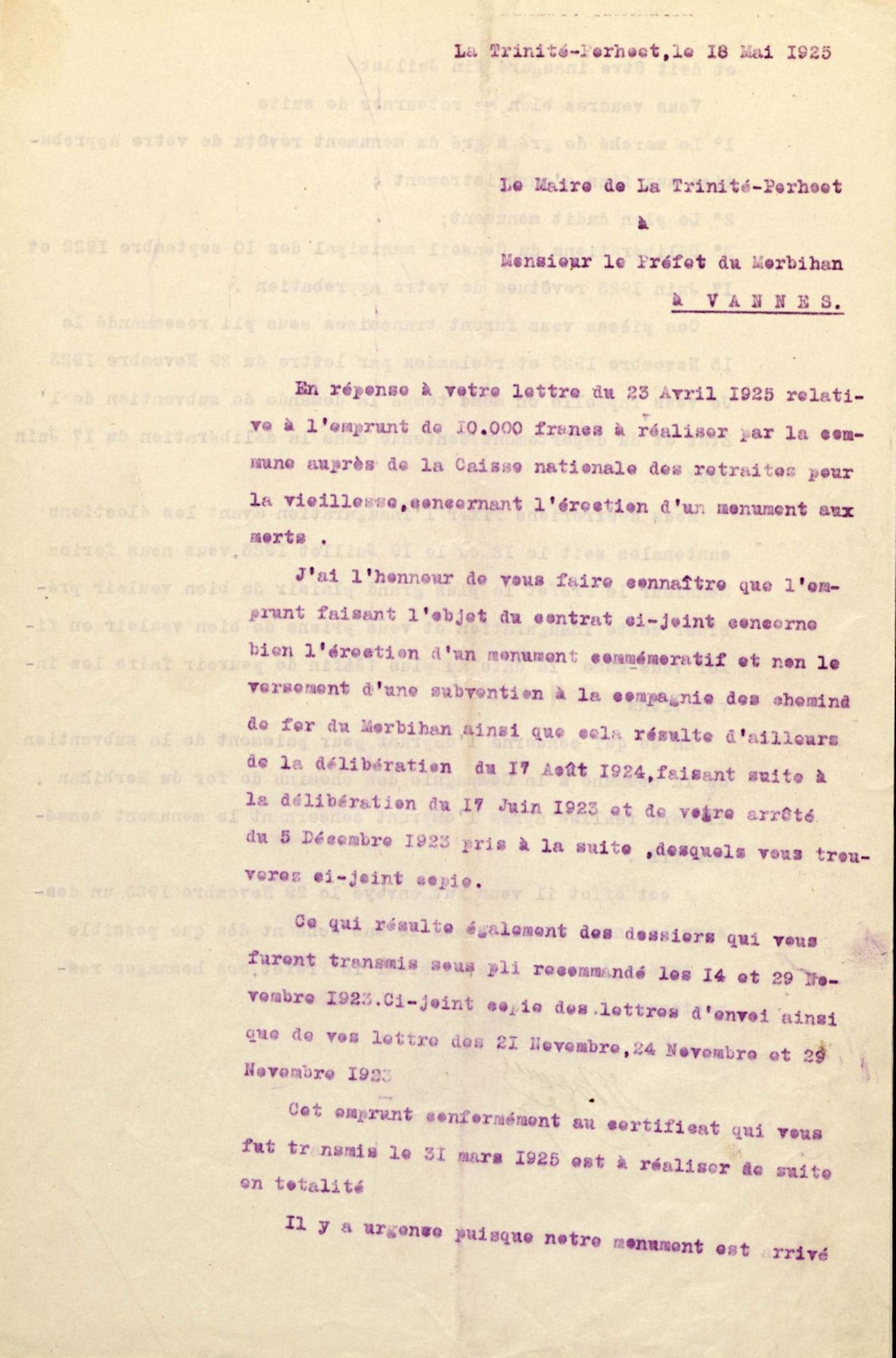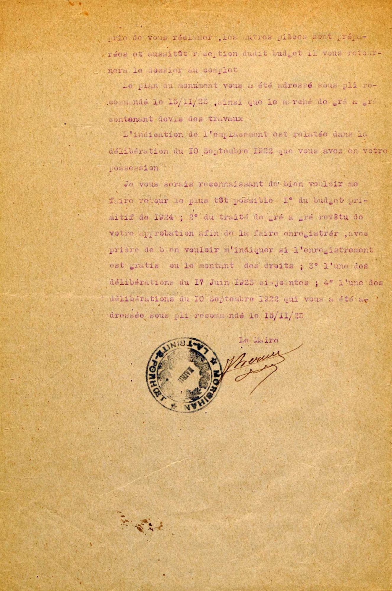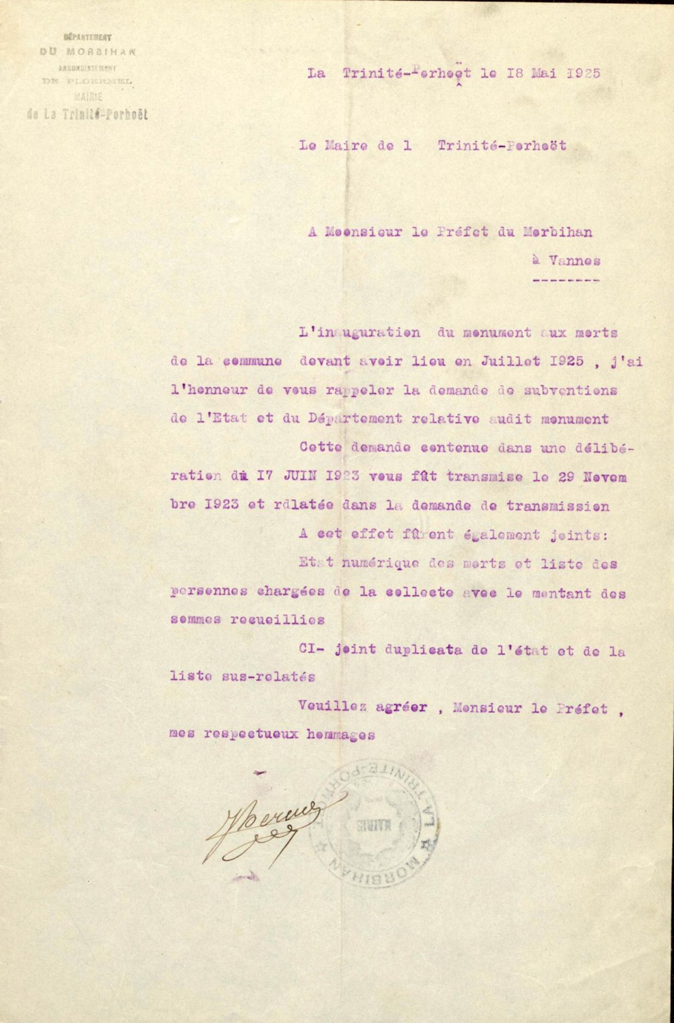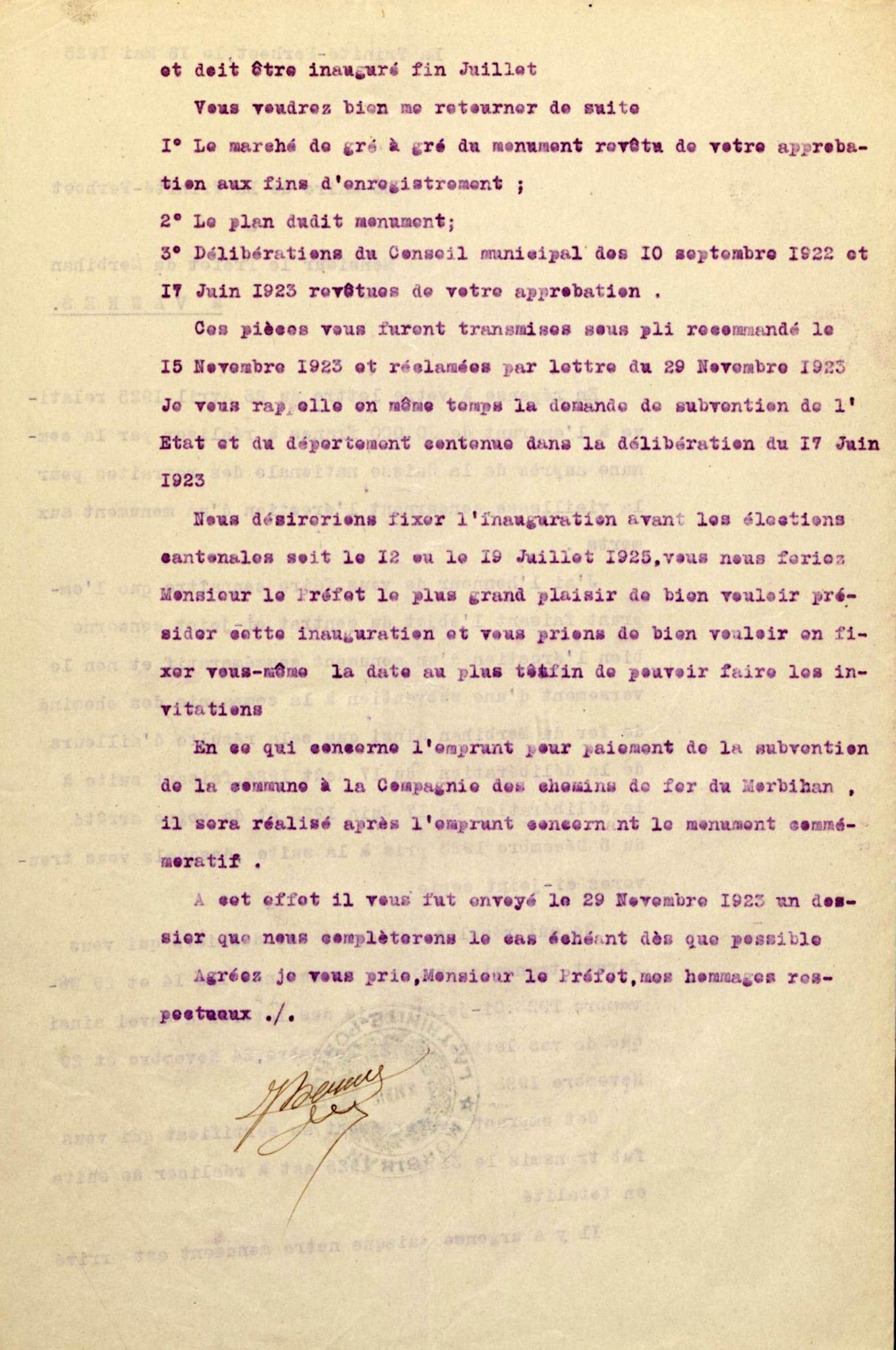 L'inauguration du monument devant avoir lieu en juillet 1925, j'ai l'honneur de vous rappeler la demande de subventions de l'État et du Département