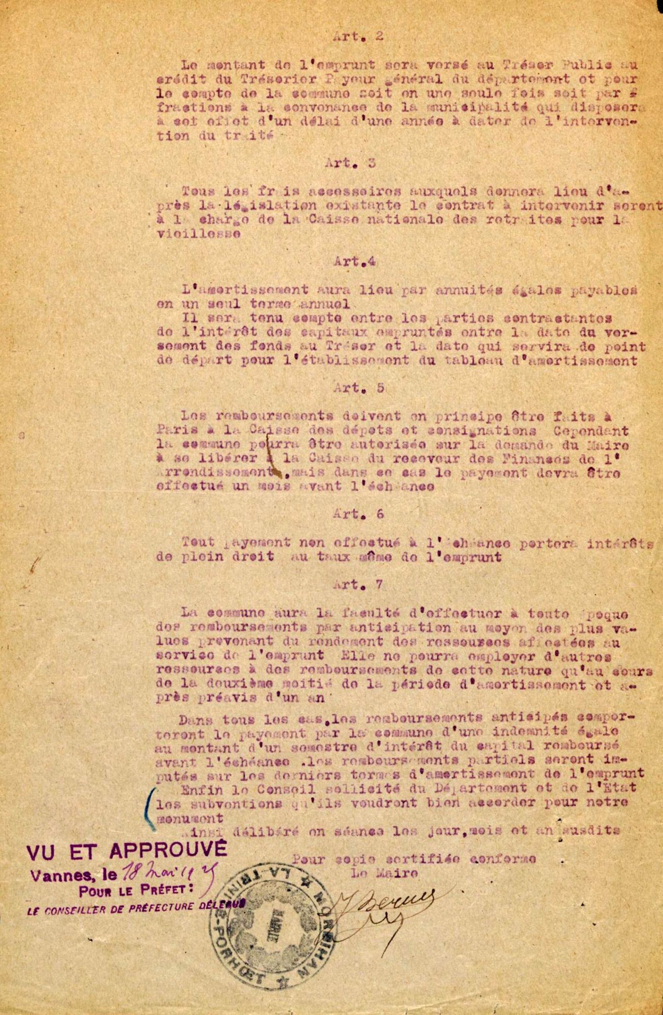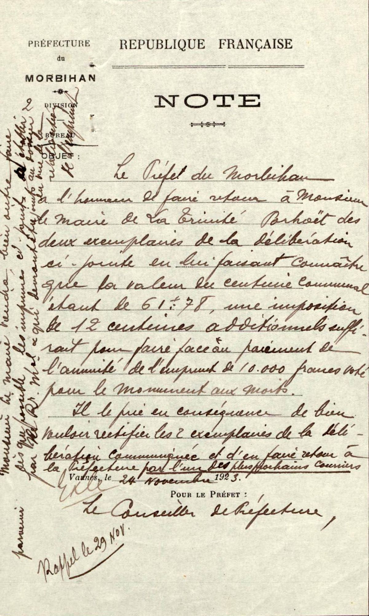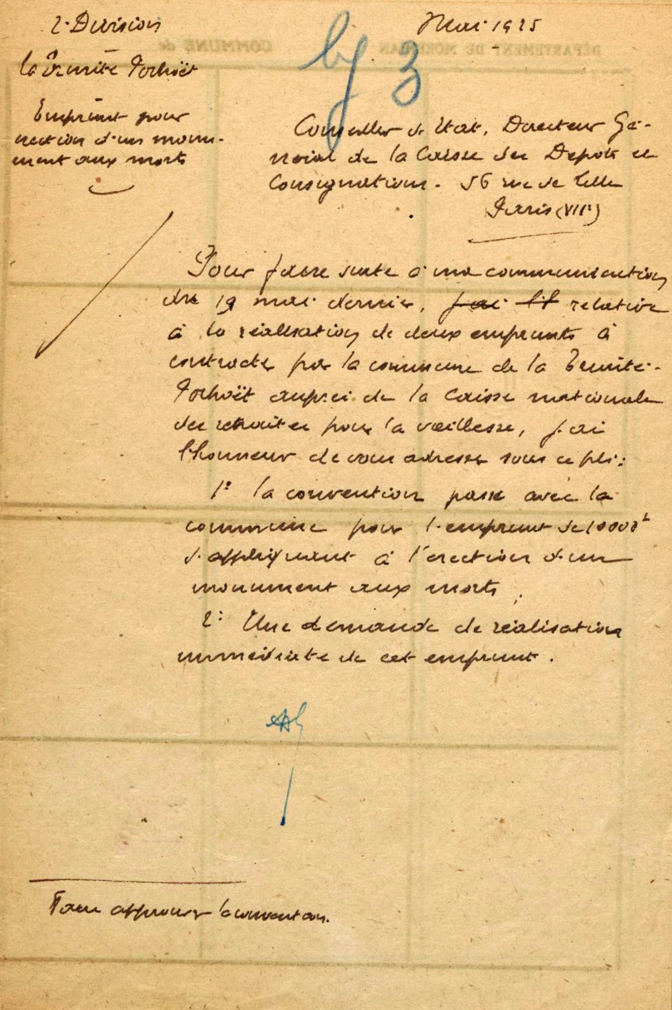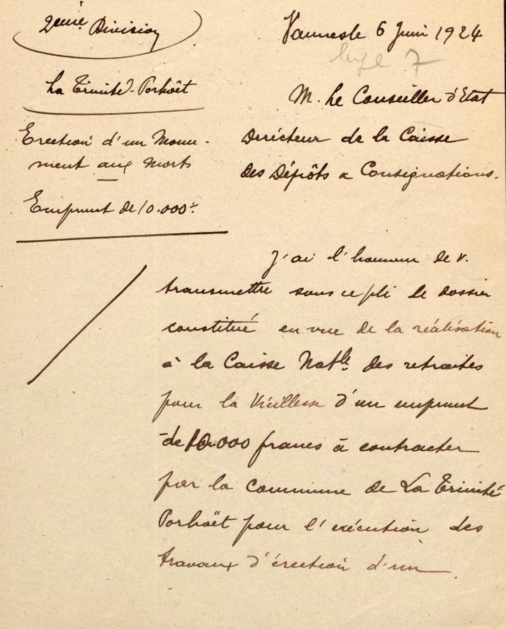 L'inauguration du monument devant avoir lieu en juillet 1925, j'ai l'honneur de vous rappeler la demande de subventions de l'État et du Département