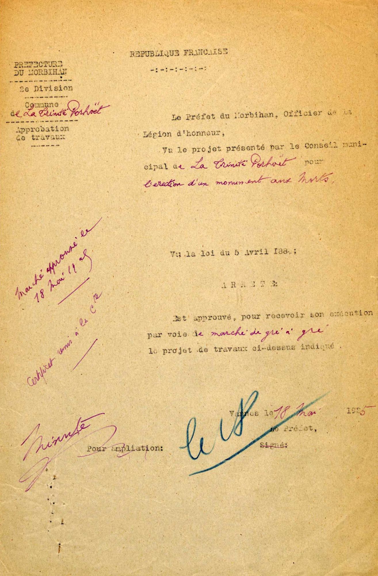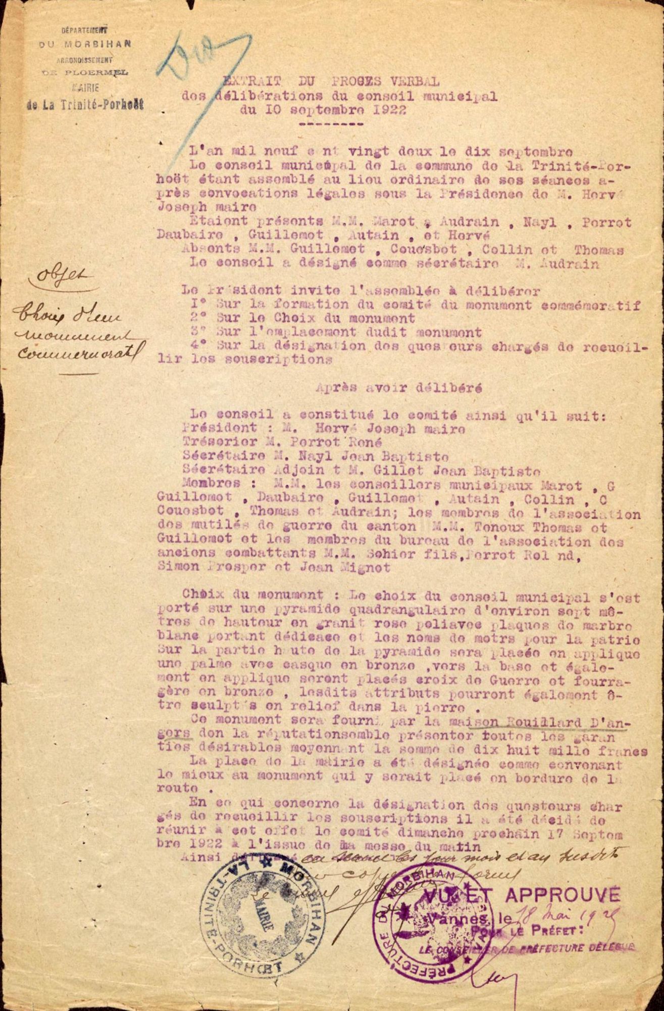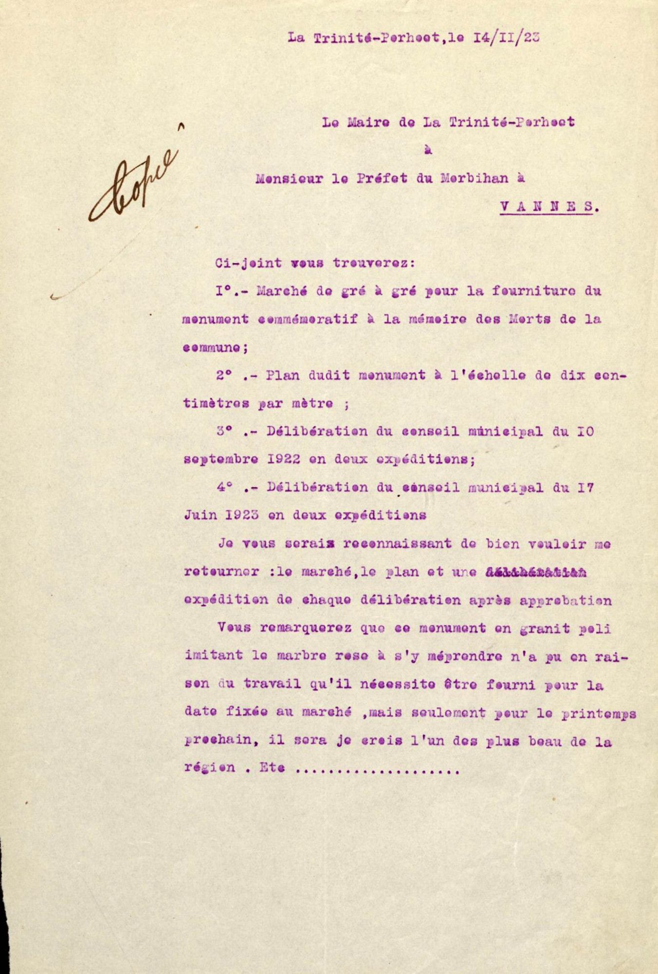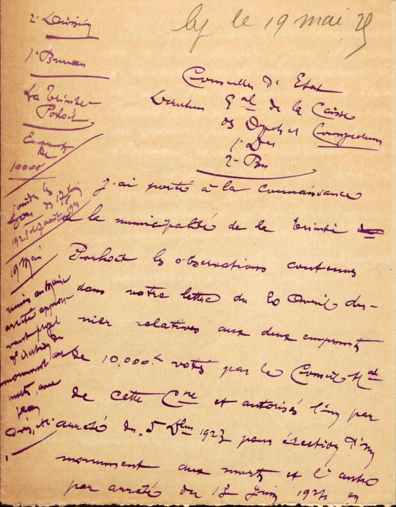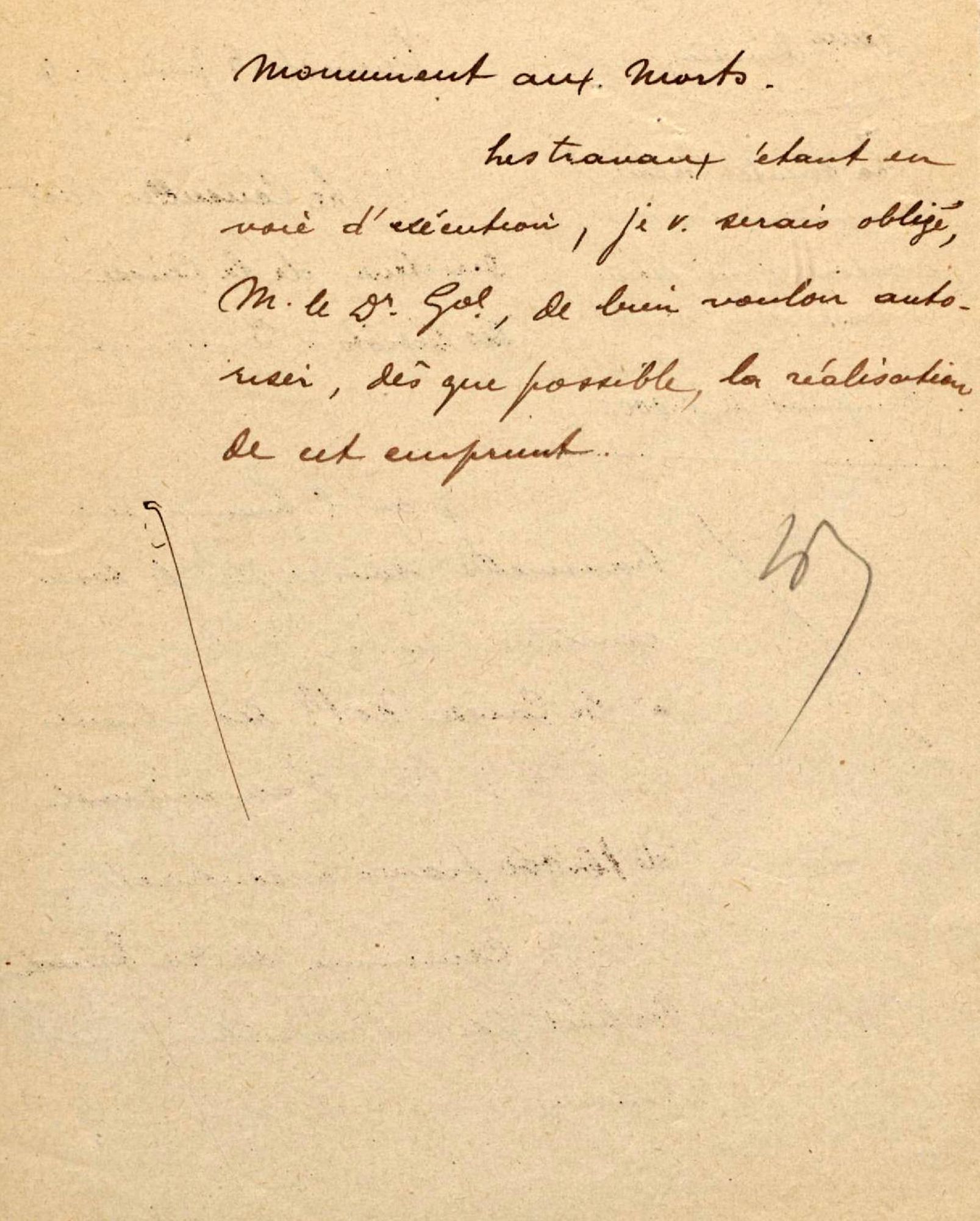 L'inauguration du monument devant avoir lieu en juillet 1925, j'ai l'honneur de vous rappeler la demande de subventions de l'État et du Département