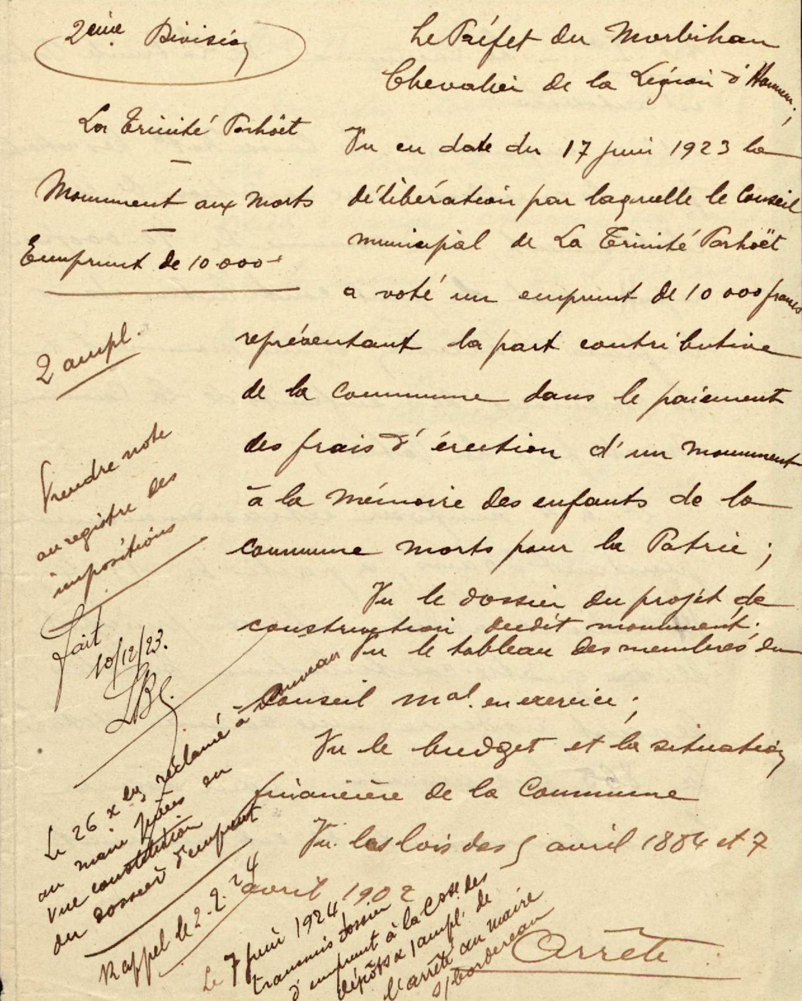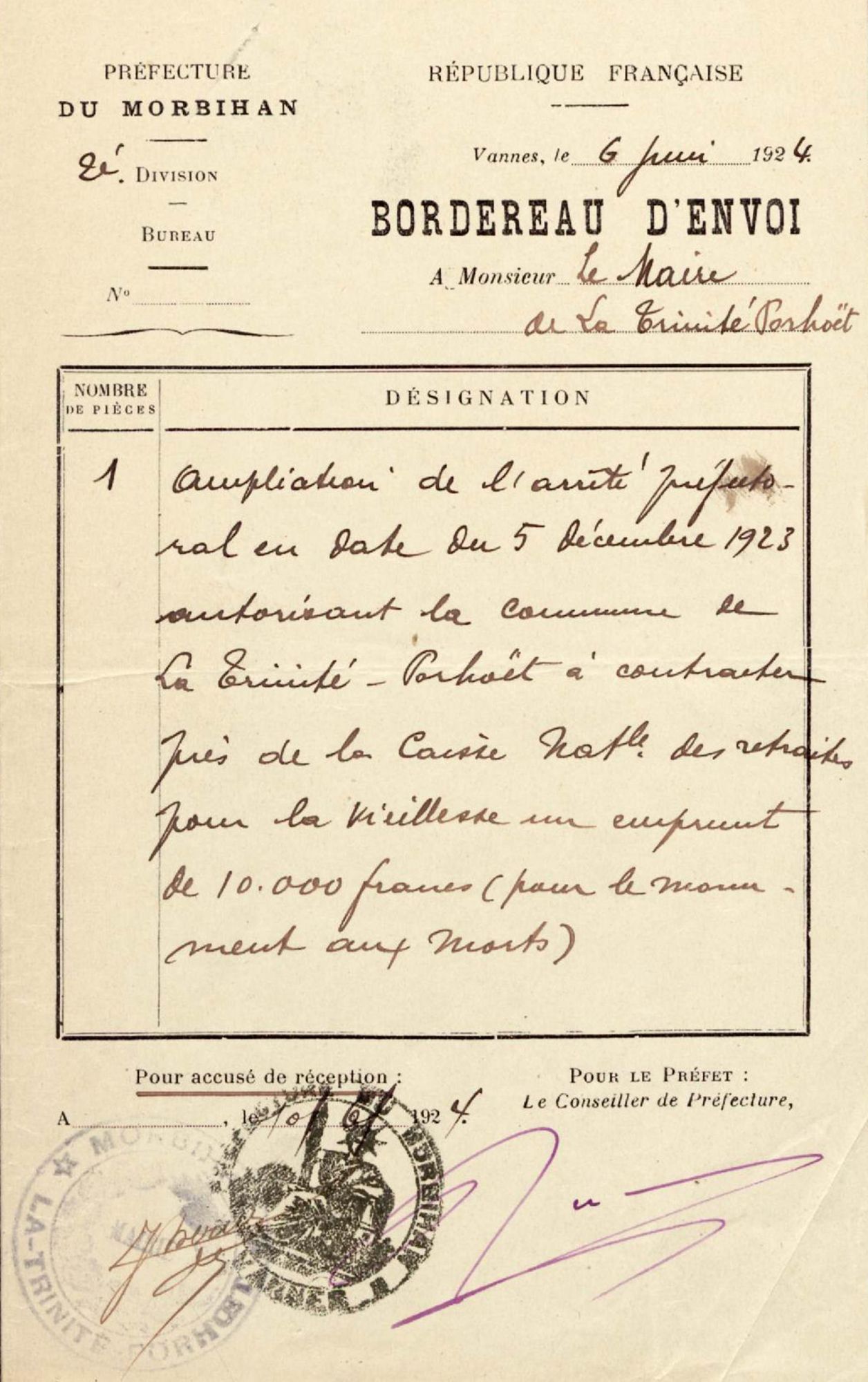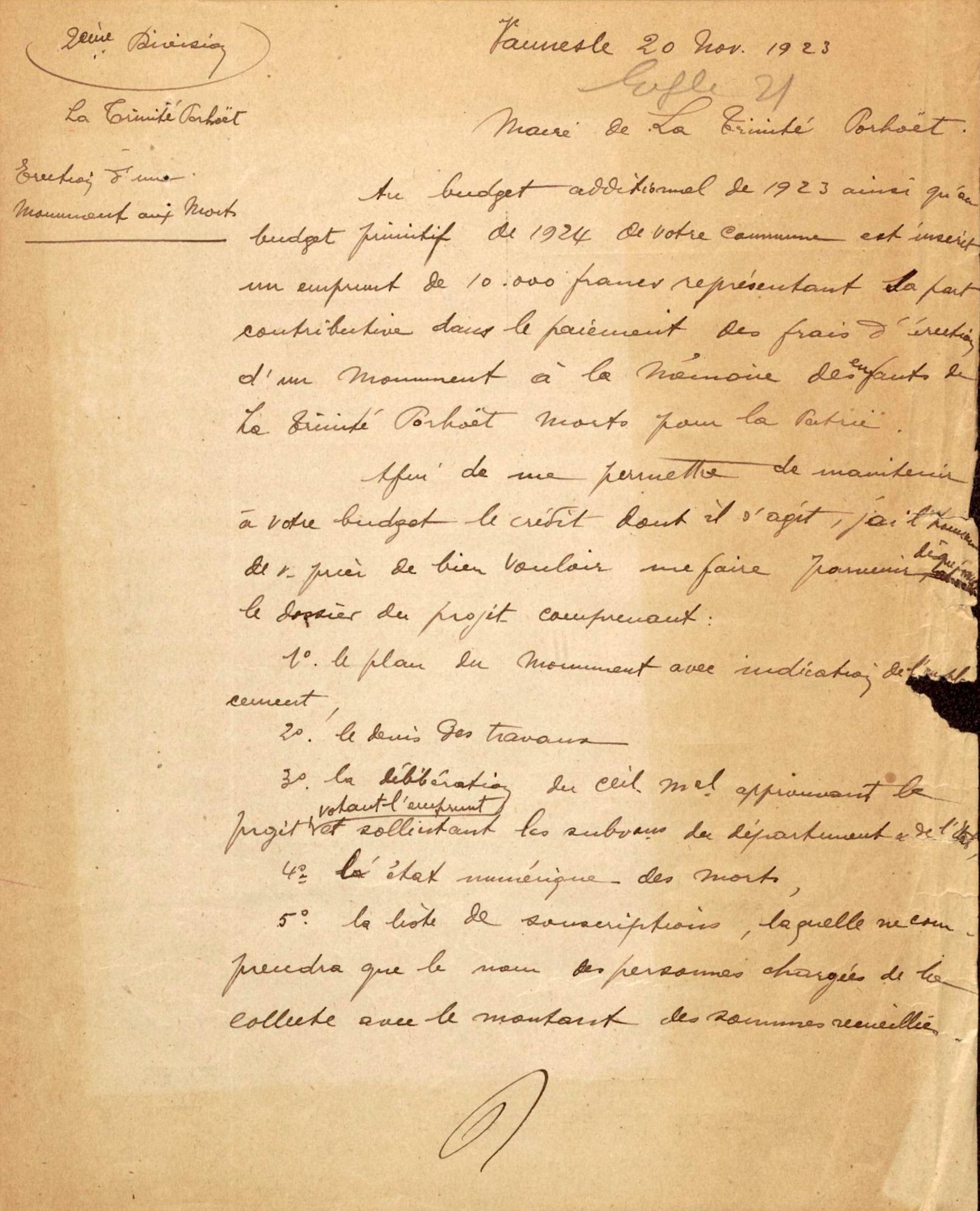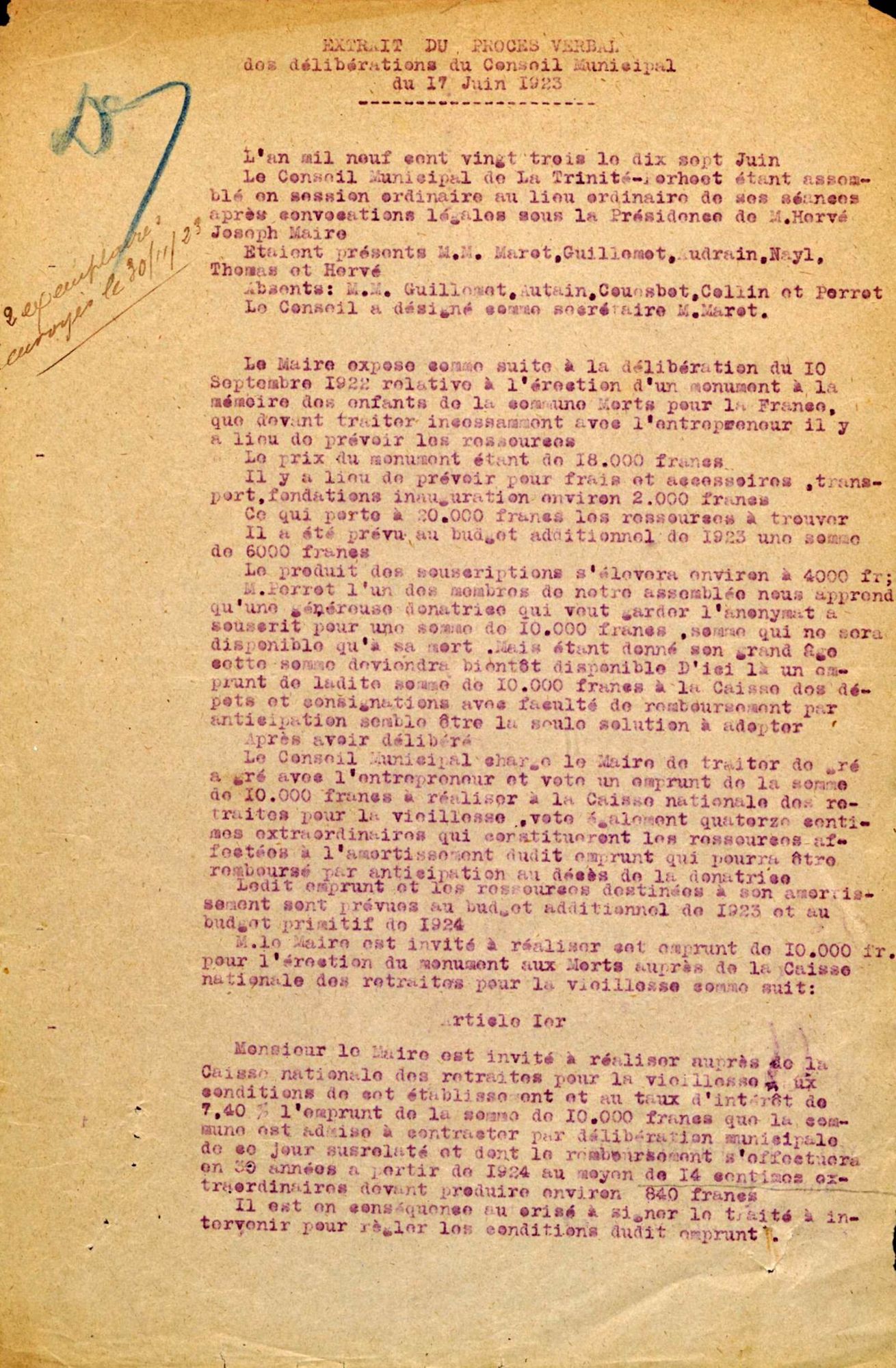 Aubudget 6000 frs prévu au budget additionnel de 1923
