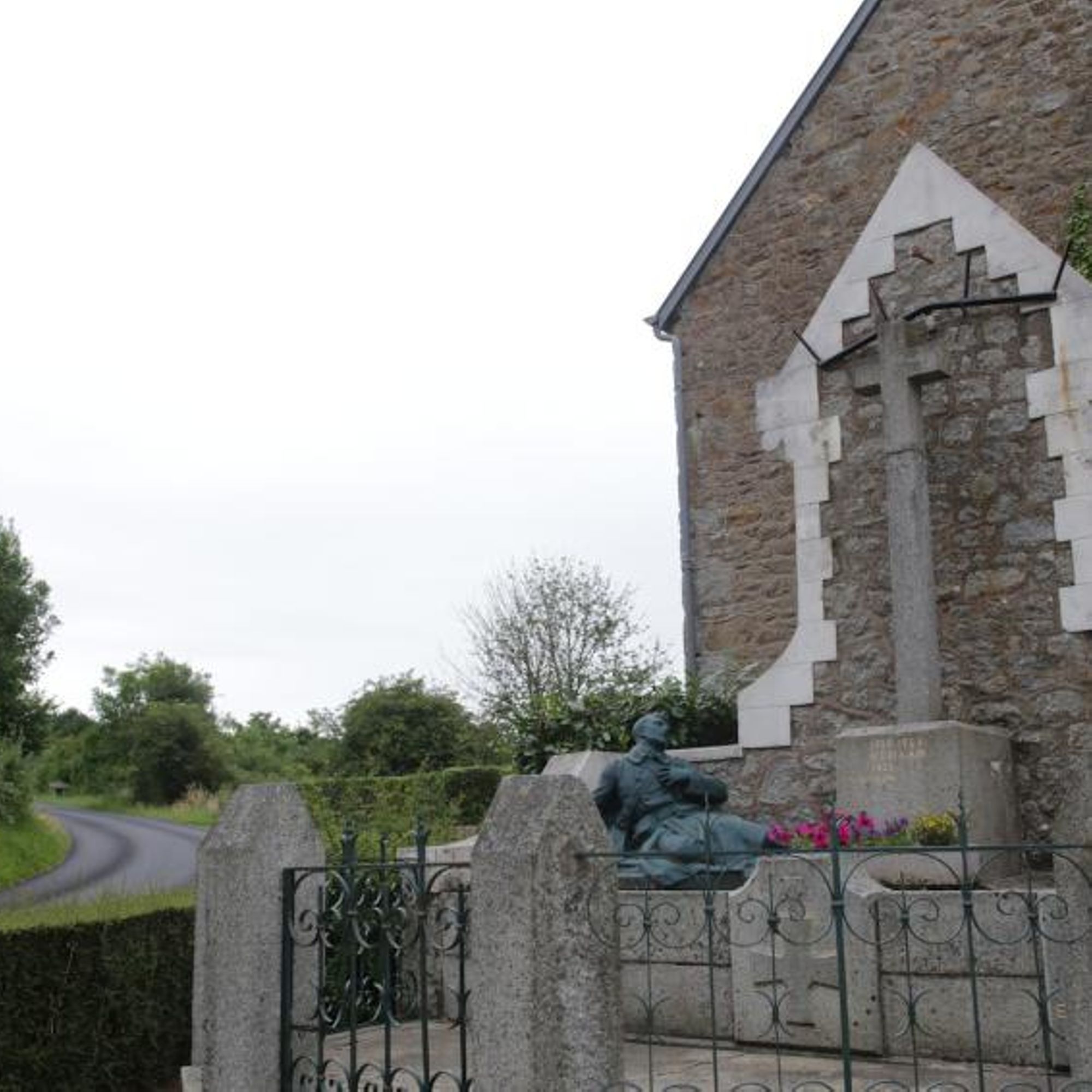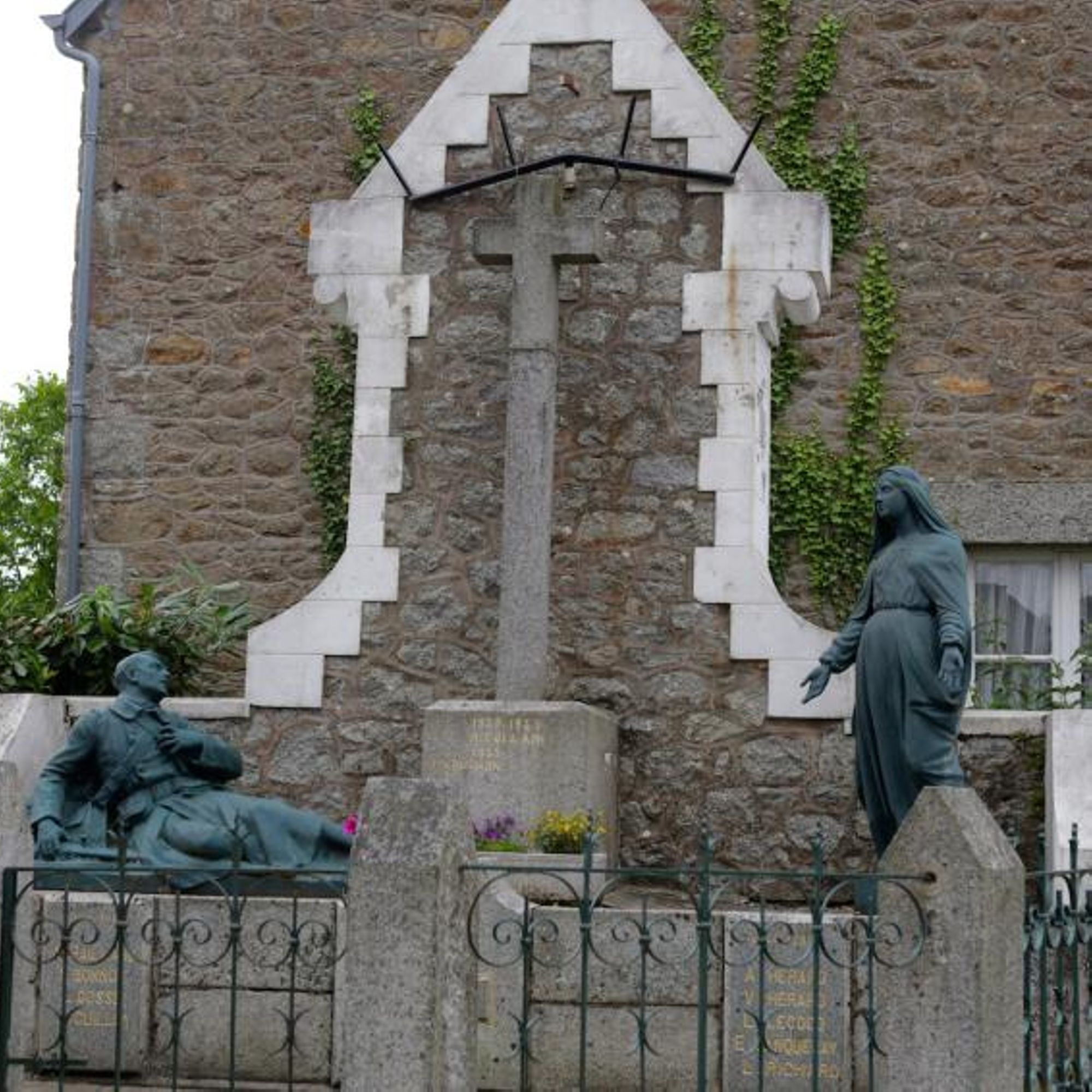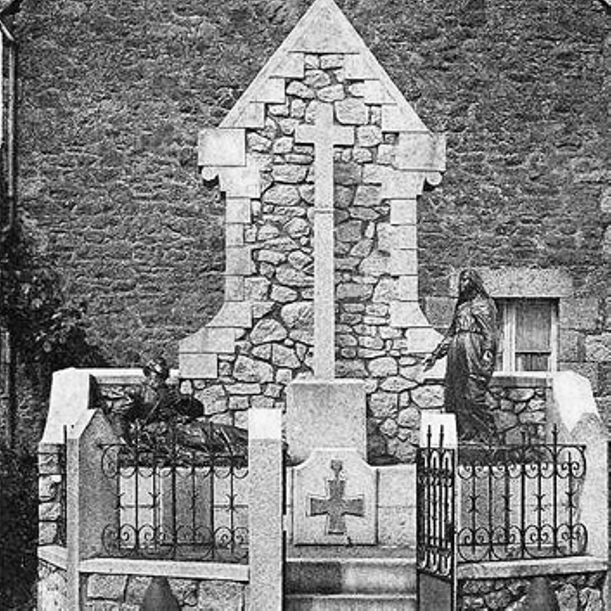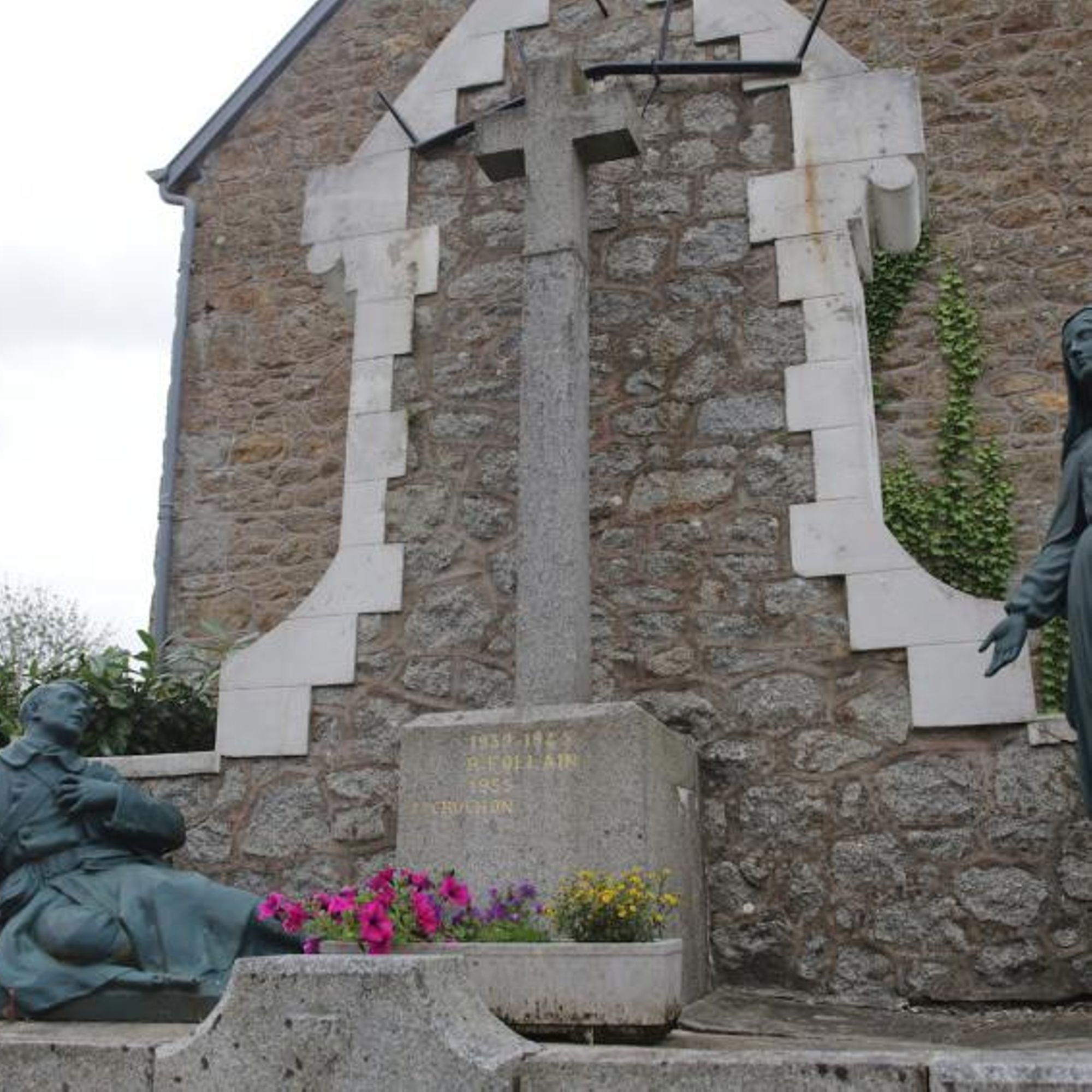 Mausolé avec au centre une croix monumentale ; à droite : la vierge avec les 2 paumes tournées vers l'extérieur, à gauche un soldat gisant avec la main gauche se tenant la poitrine