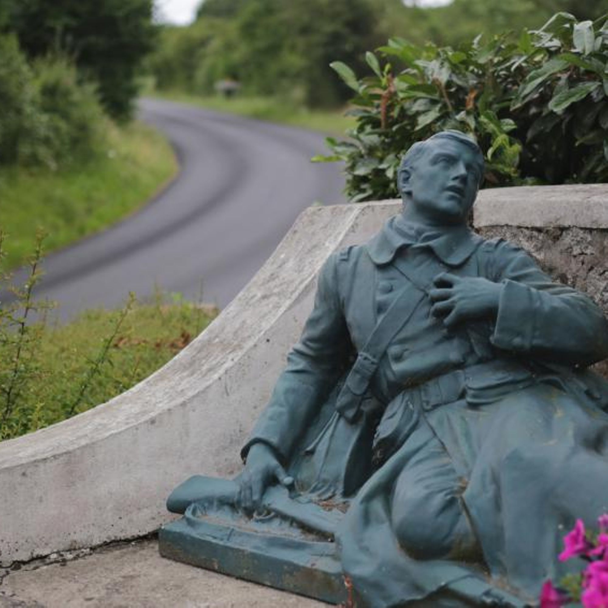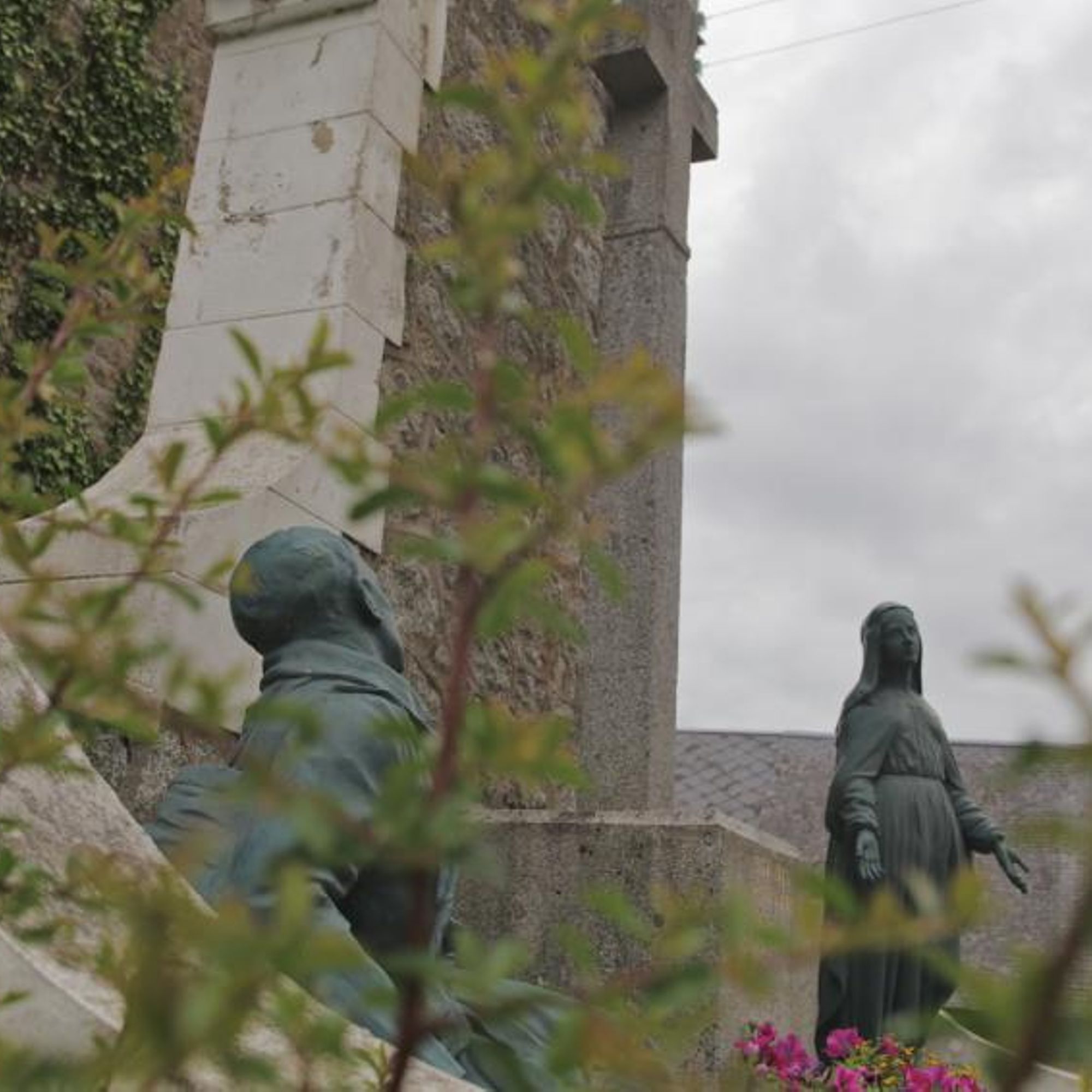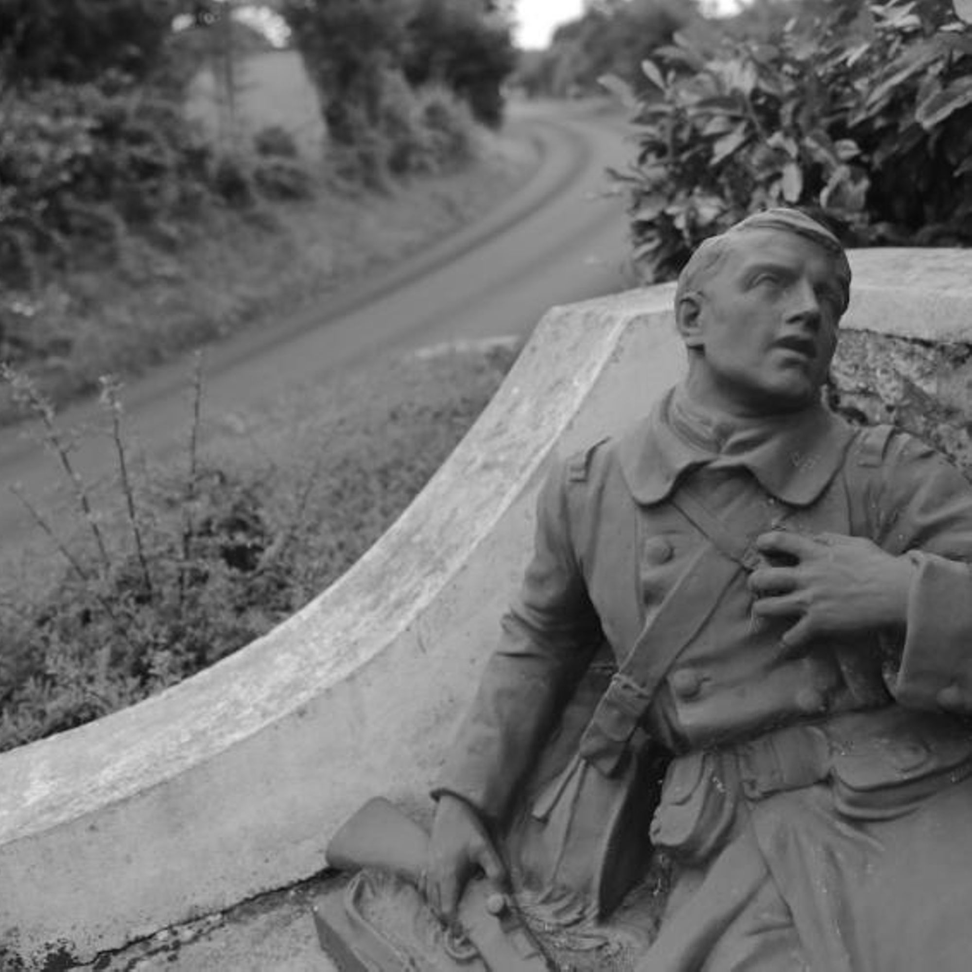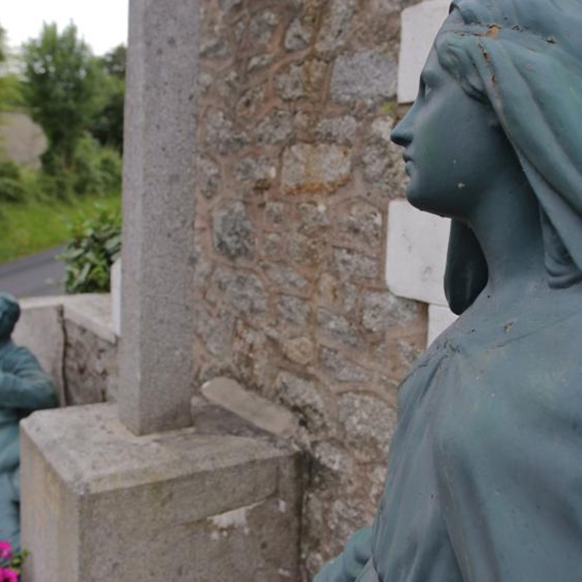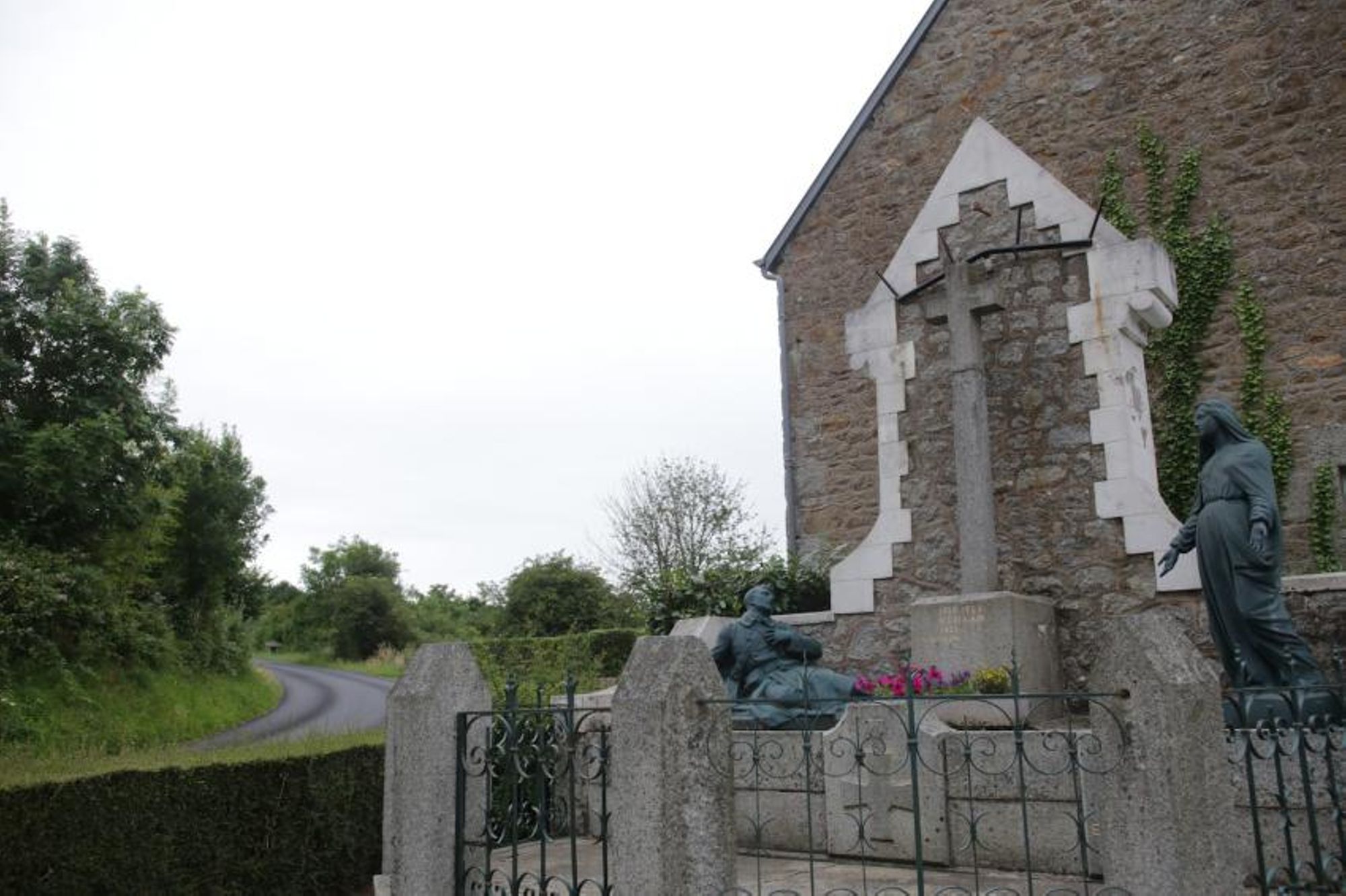 Mausolé avec au centre une croix monumentale ; à droite : la vierge avec les 2 paumes tournées vers l'extérieur, à gauche un soldat gisant avec la main gauche se tenant la poitrine