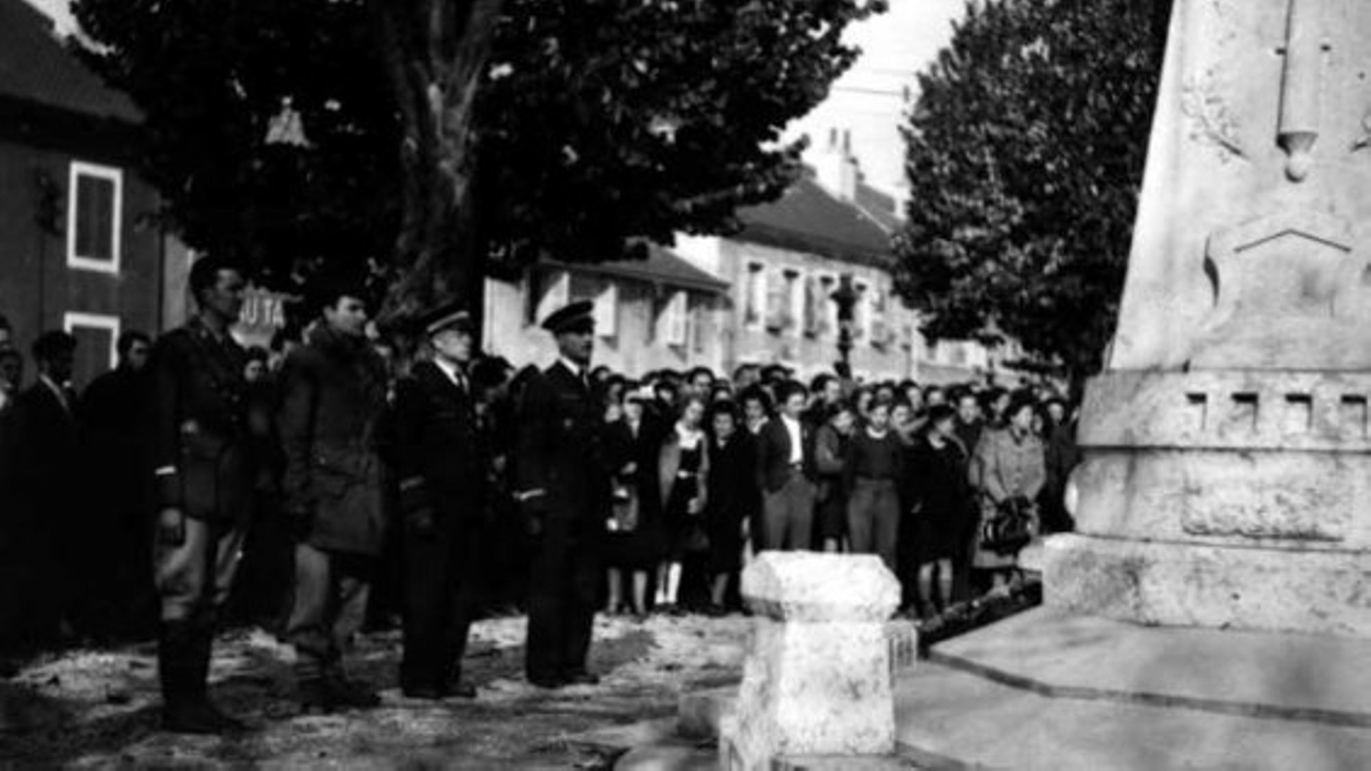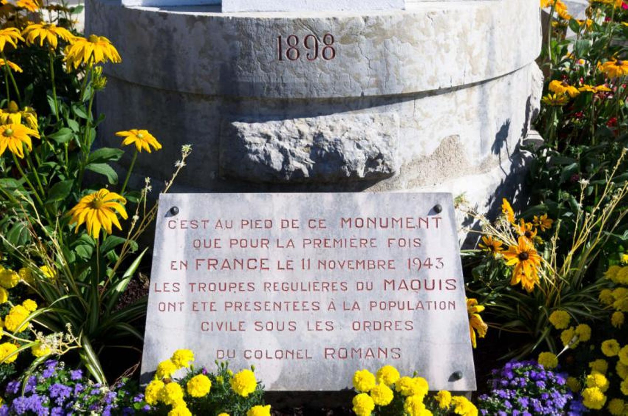 Une inscription rappellerait que c'est devant ce monument que pour la première fois en France, le 11 novembre 1943, les troupes régulières du Maquis ont été présentées au public sous les ordres du Colonel Romans."