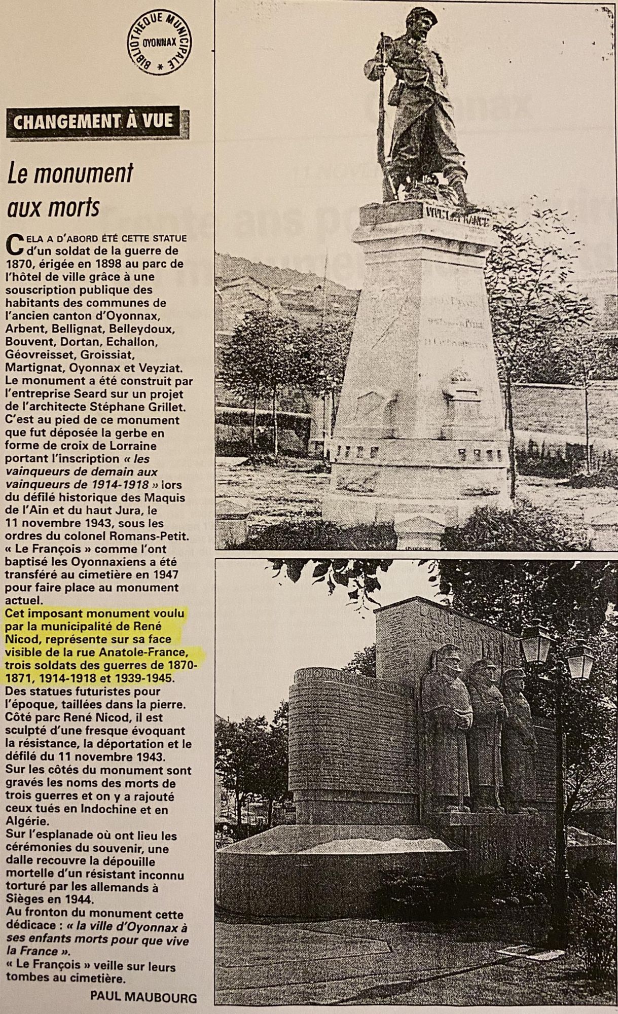 Extraits "...de l'avis du comité, le Monument de 1870, rendu historique à la suite de la manifestation du Maquis, en novembre 1943, devrait être conservé tel quel, et transporté au cimetière au milieu des 23 tombes des héros morts au moment de la Libération, qui n'ont pas été inhumés dans des caveaux de famille.