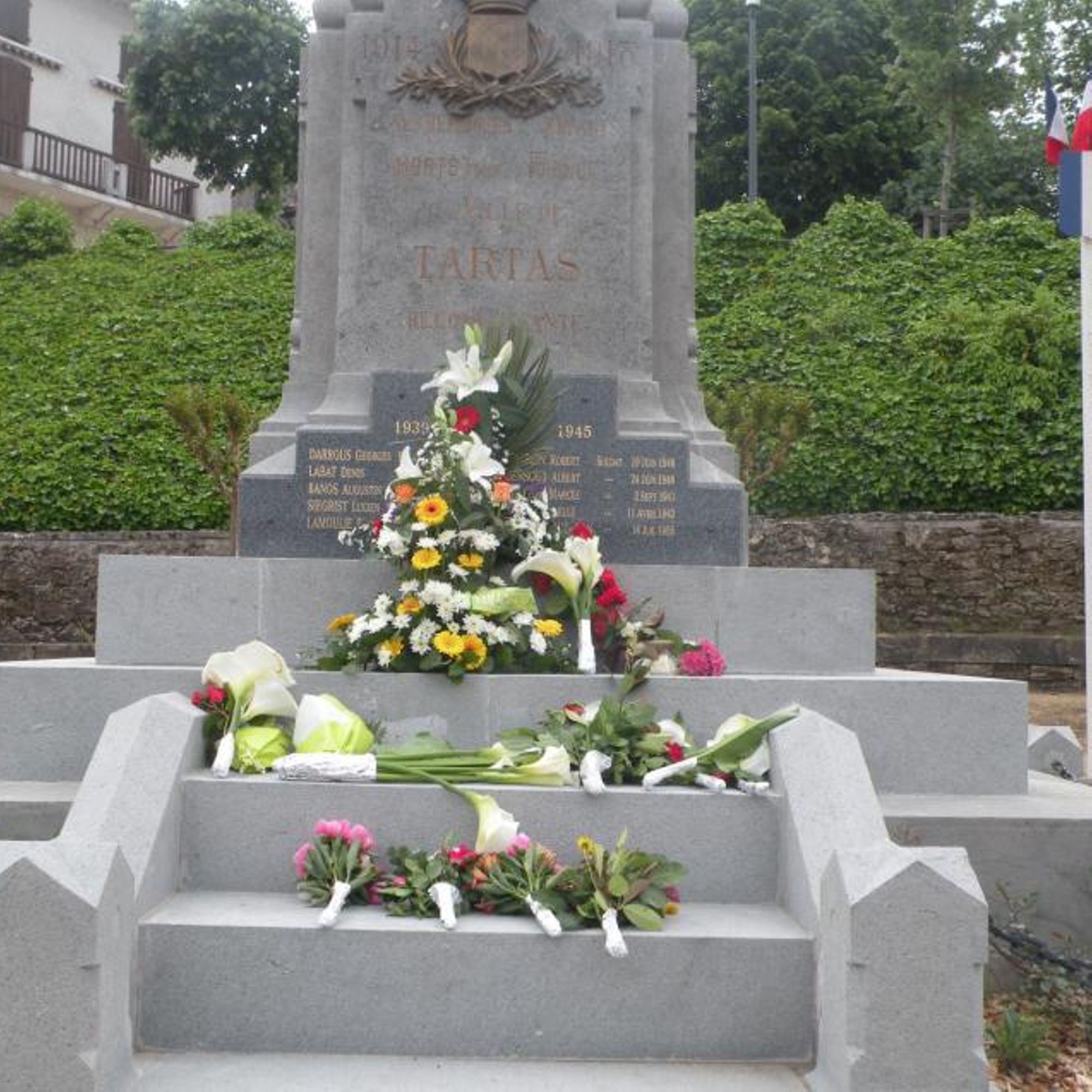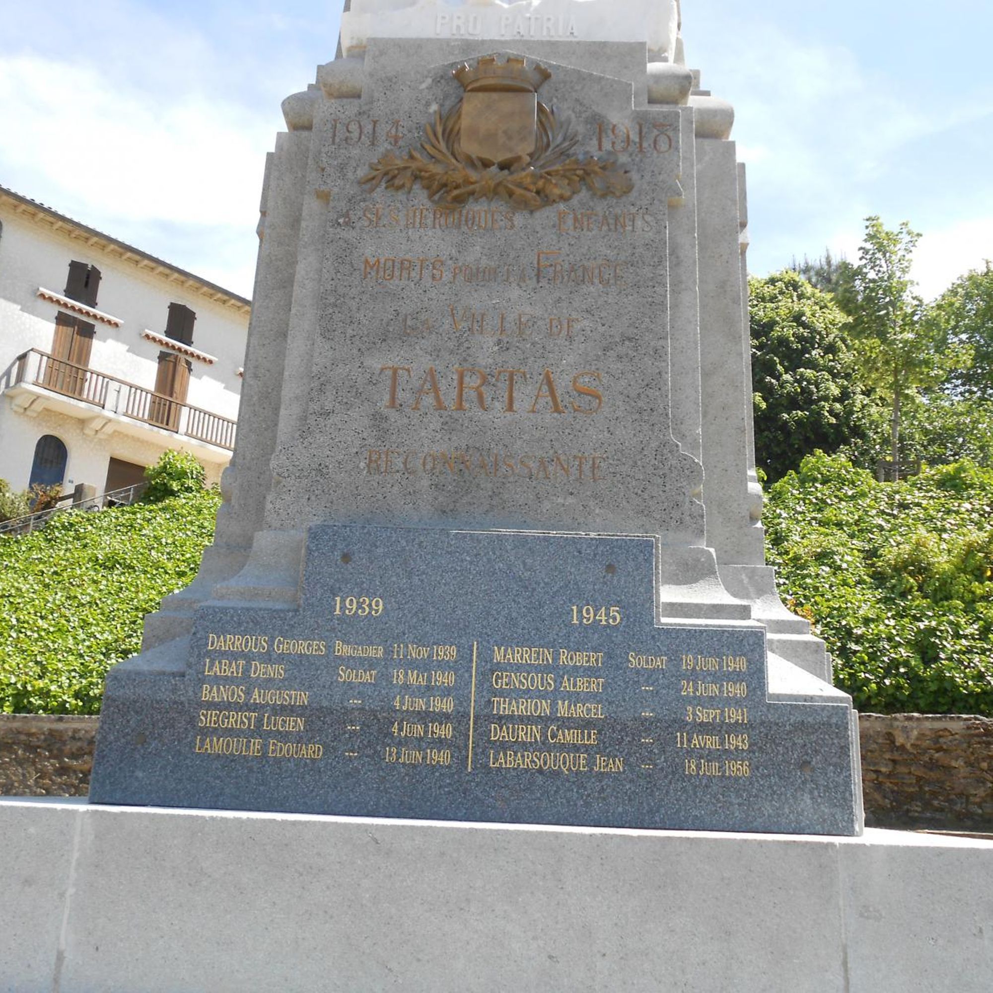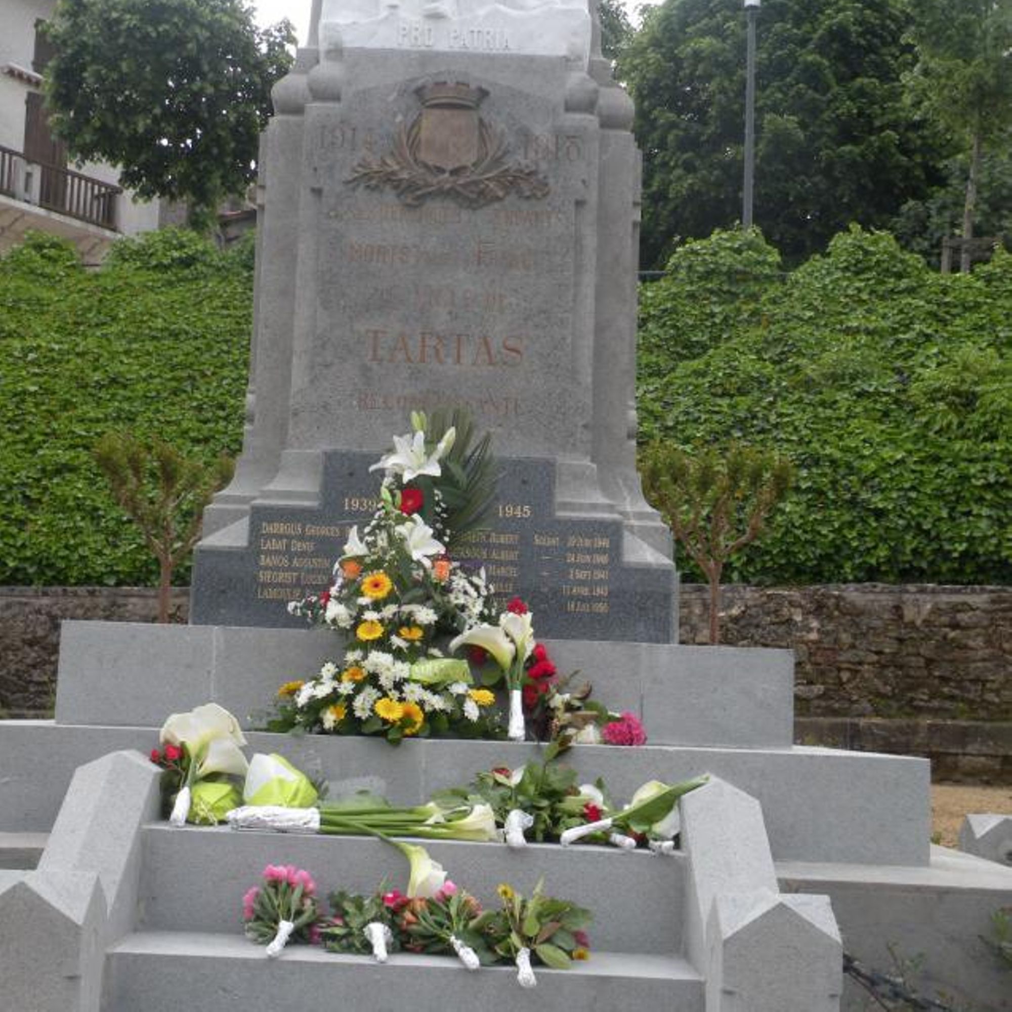L’orientation patriotique et républicaine du monument aux morts de Tartas est accentuée par la présence du blason de la ville et de la croix de guerre.