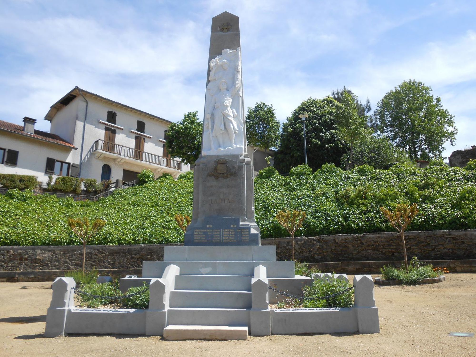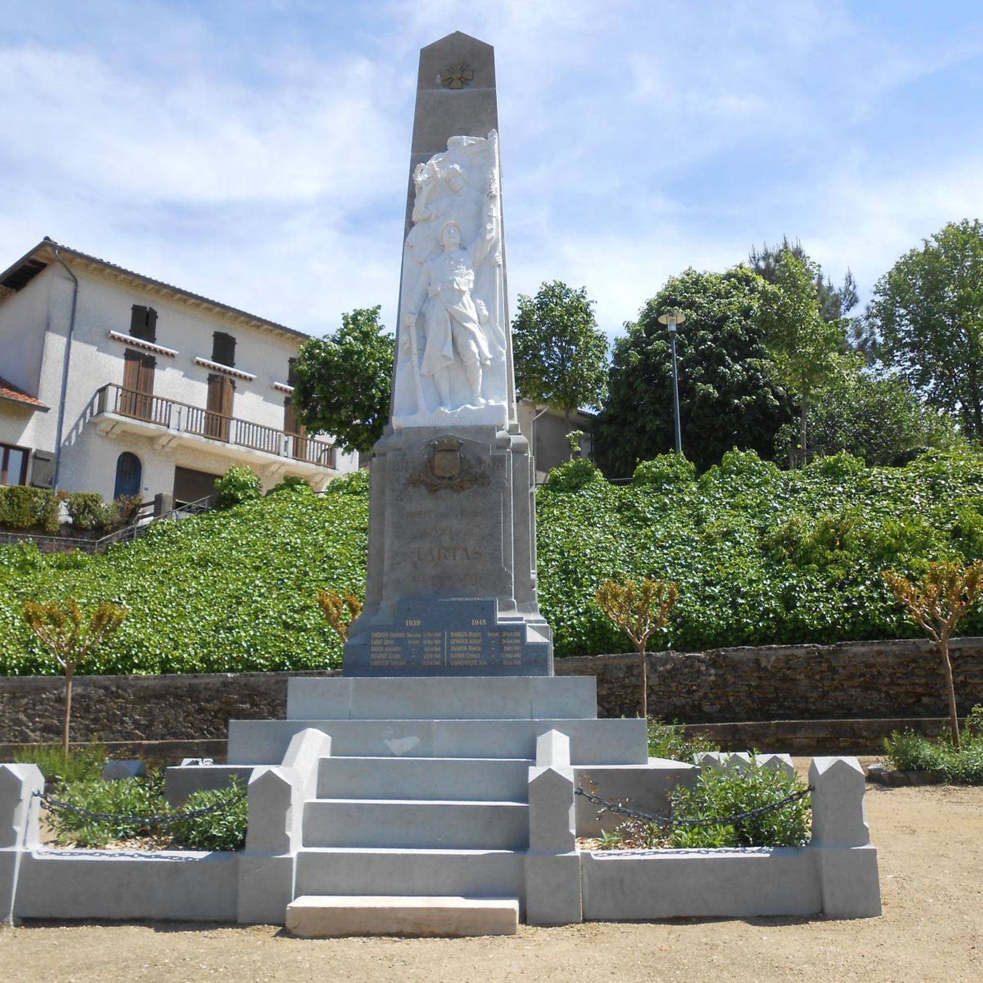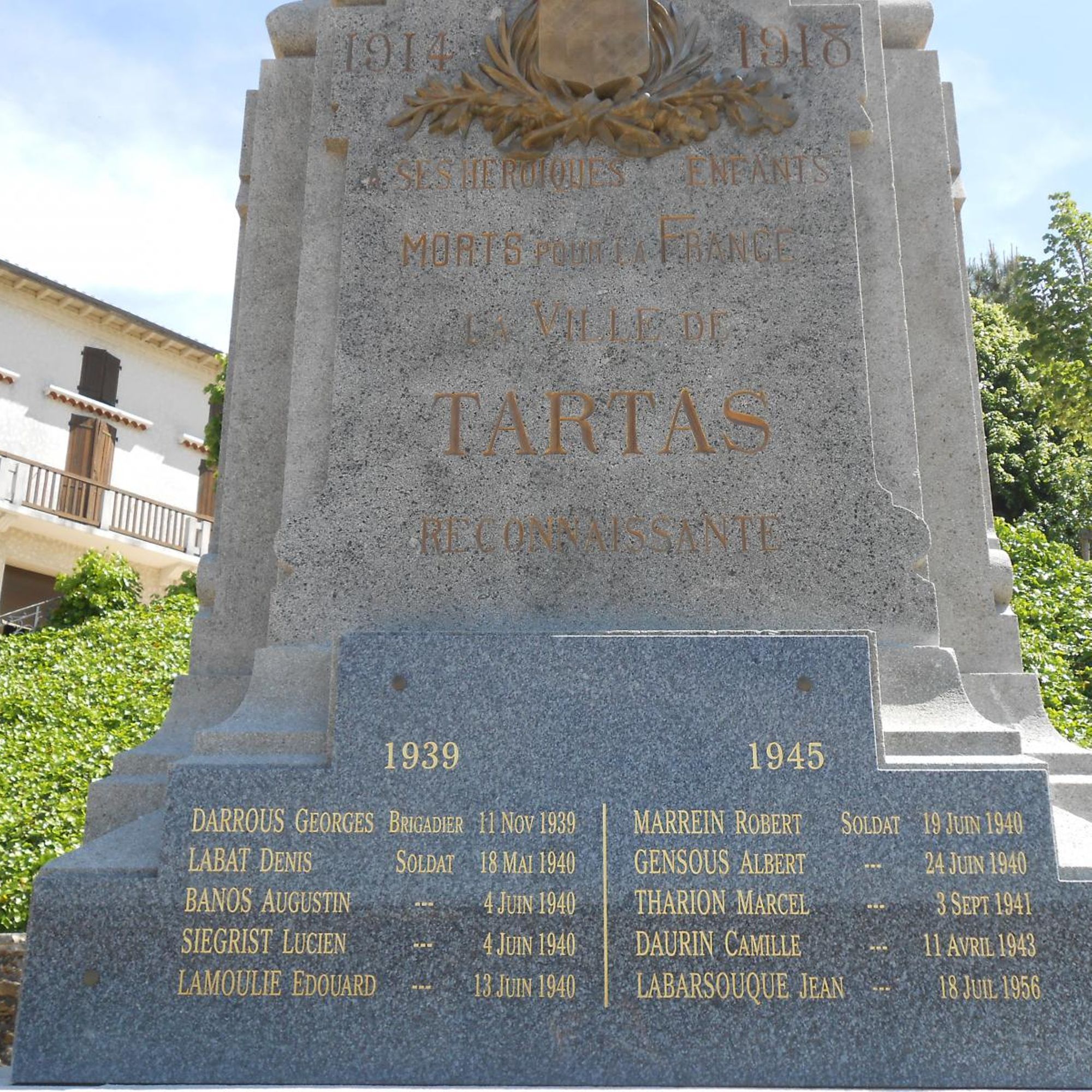 L’orientation patriotique et républicaine du monument aux morts de Tartas est accentuée par la présence du blason de la ville et de la croix de guerre.