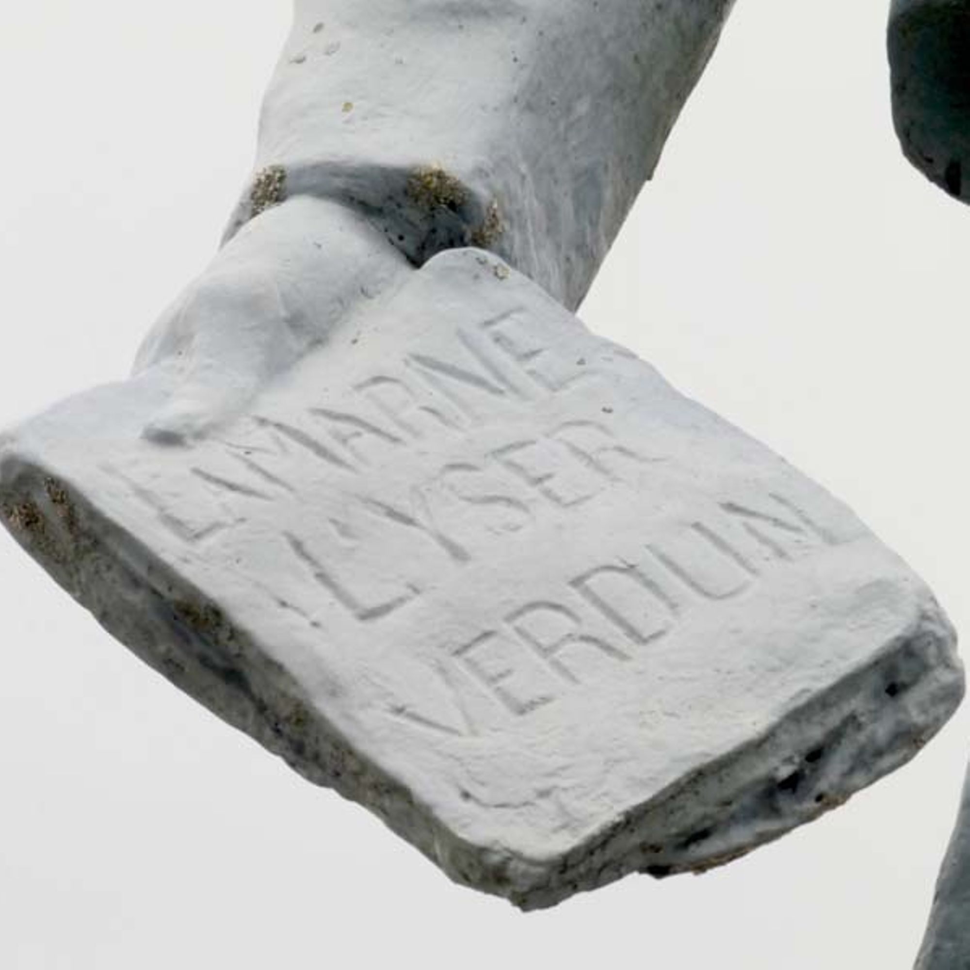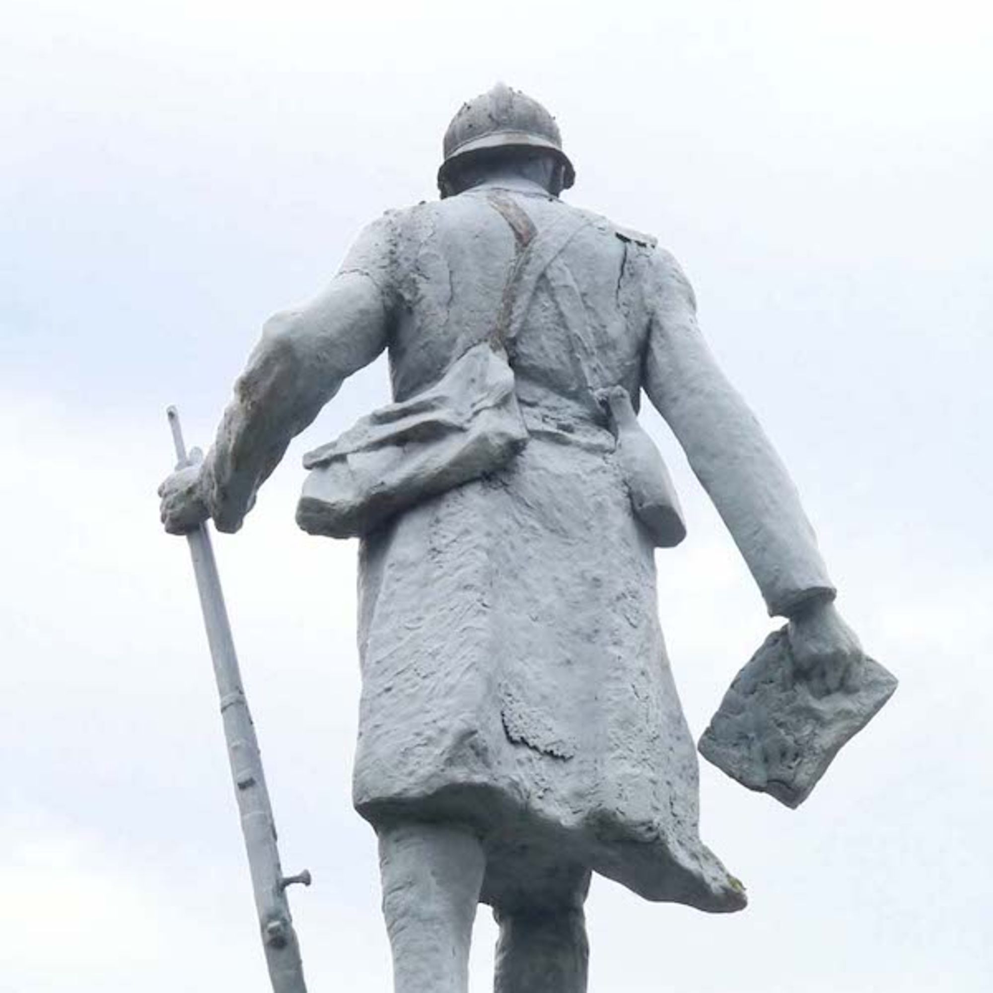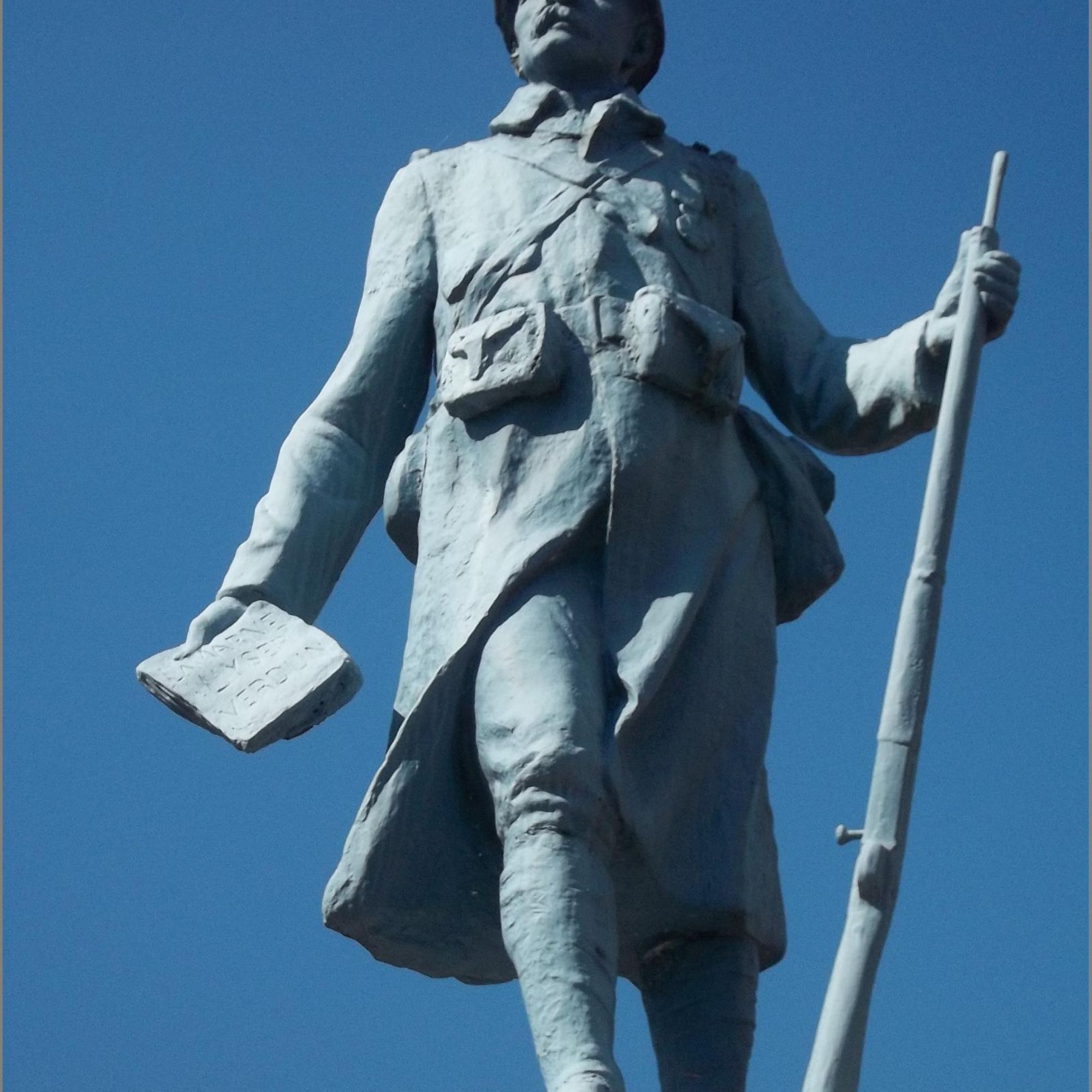 - Dans la main du poilu, une feuille où sont inscrits "La Marne, l'Yser, Verdun"