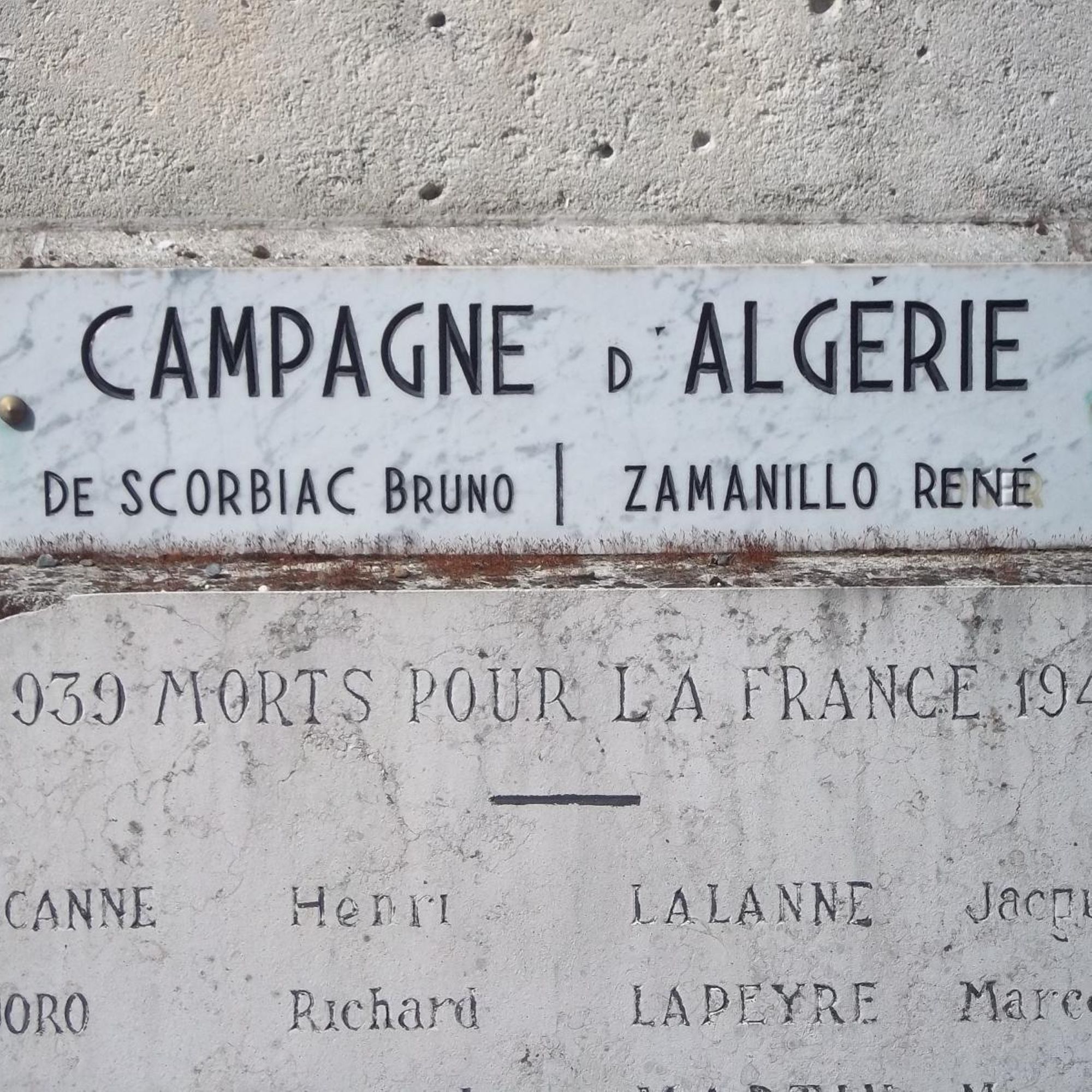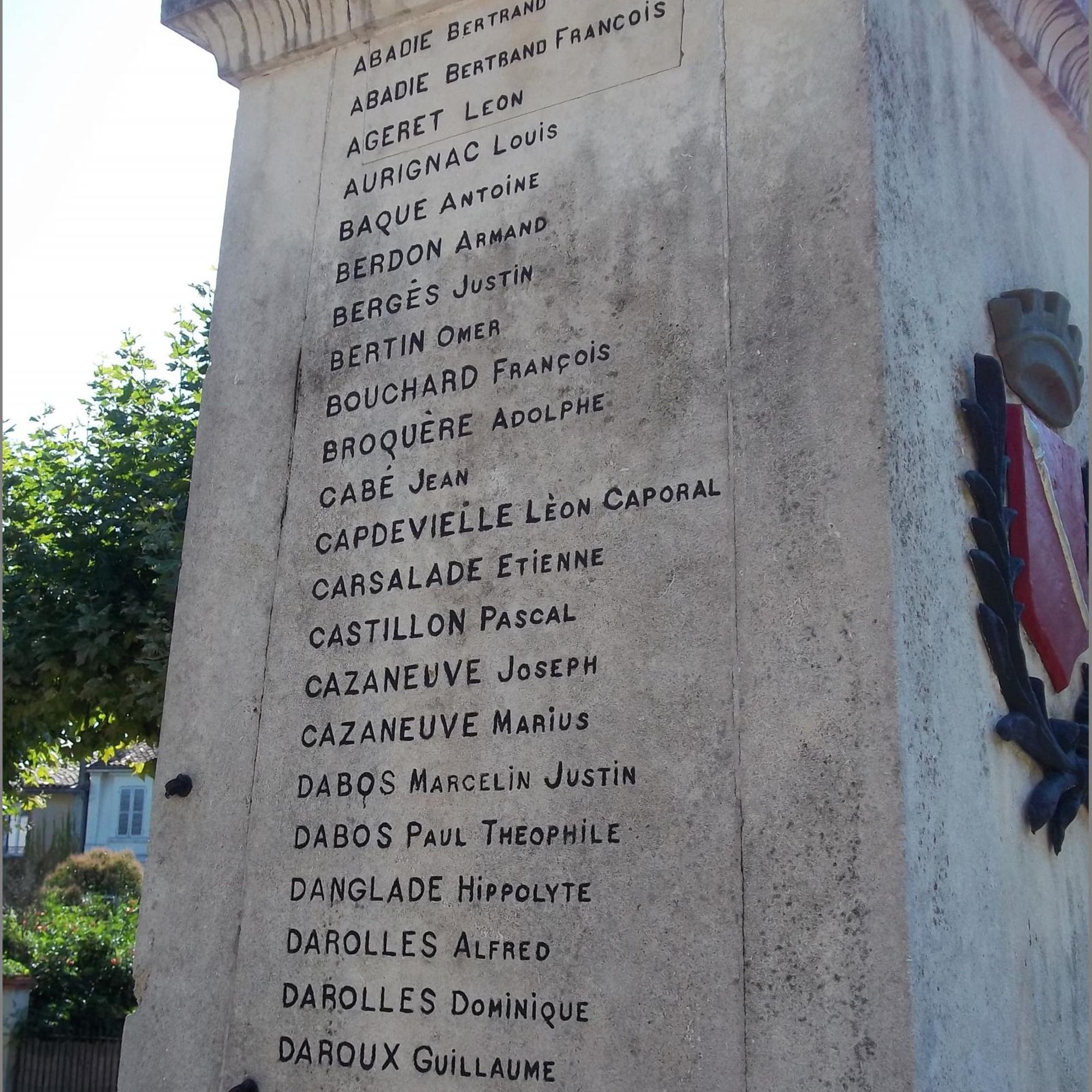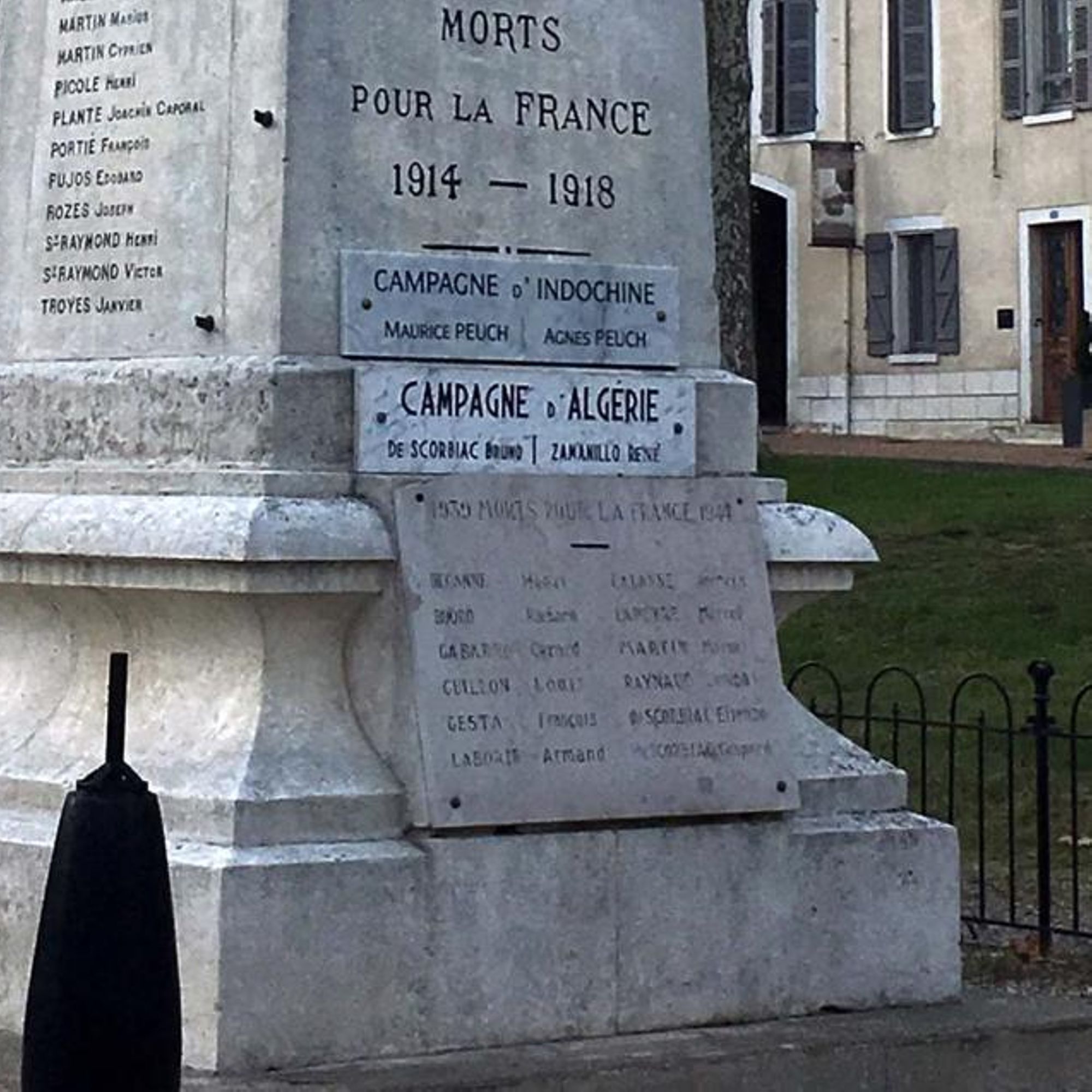 La face principale du piédestal a été modifiée après la guerre de 1939-45 et celles d'Indochine et d'Algérie : la palme en bronze qui se trouvait en bas a été mise à la place de la croix de guerre qui se trouvait en haut ; l'emplacement de celle-ci a été remplacé par une plaque en marbre portant les noms des morts de ces dernières guerres.