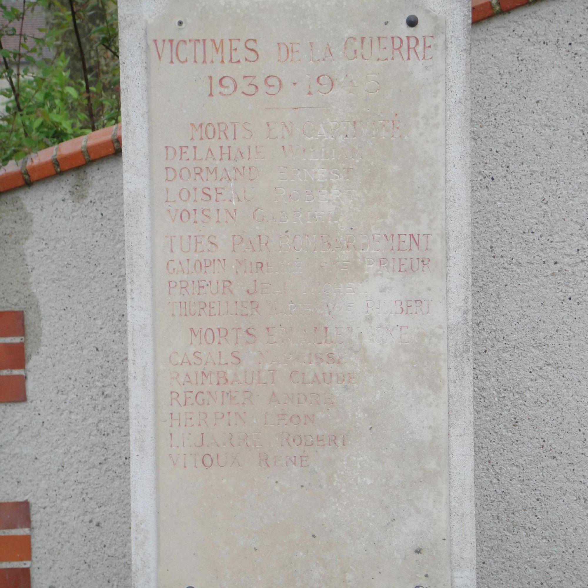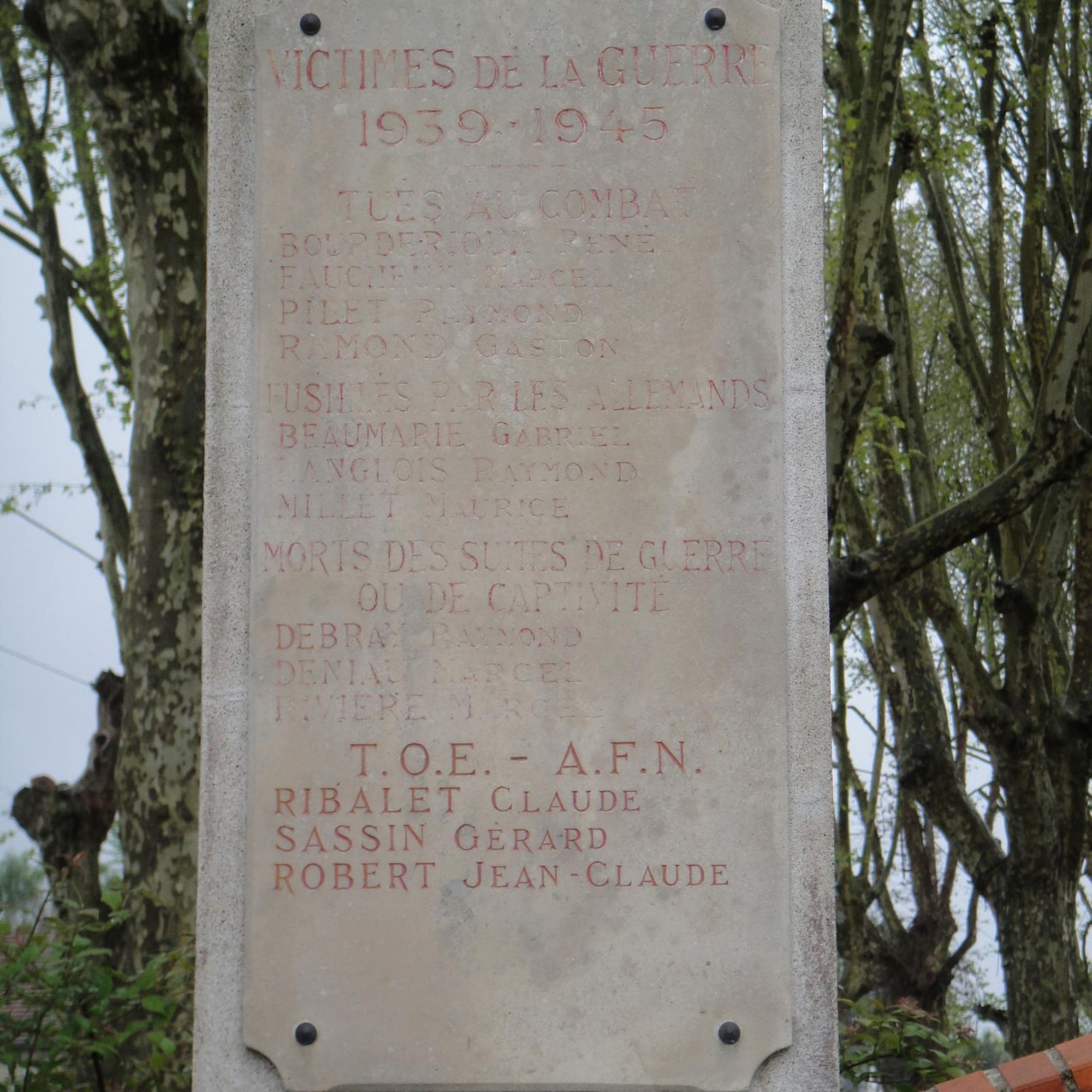 Sur les plaques de gauche les noms des defunts de la seconde guerre mondiale ainsi que T.O.E. - A.F.N.