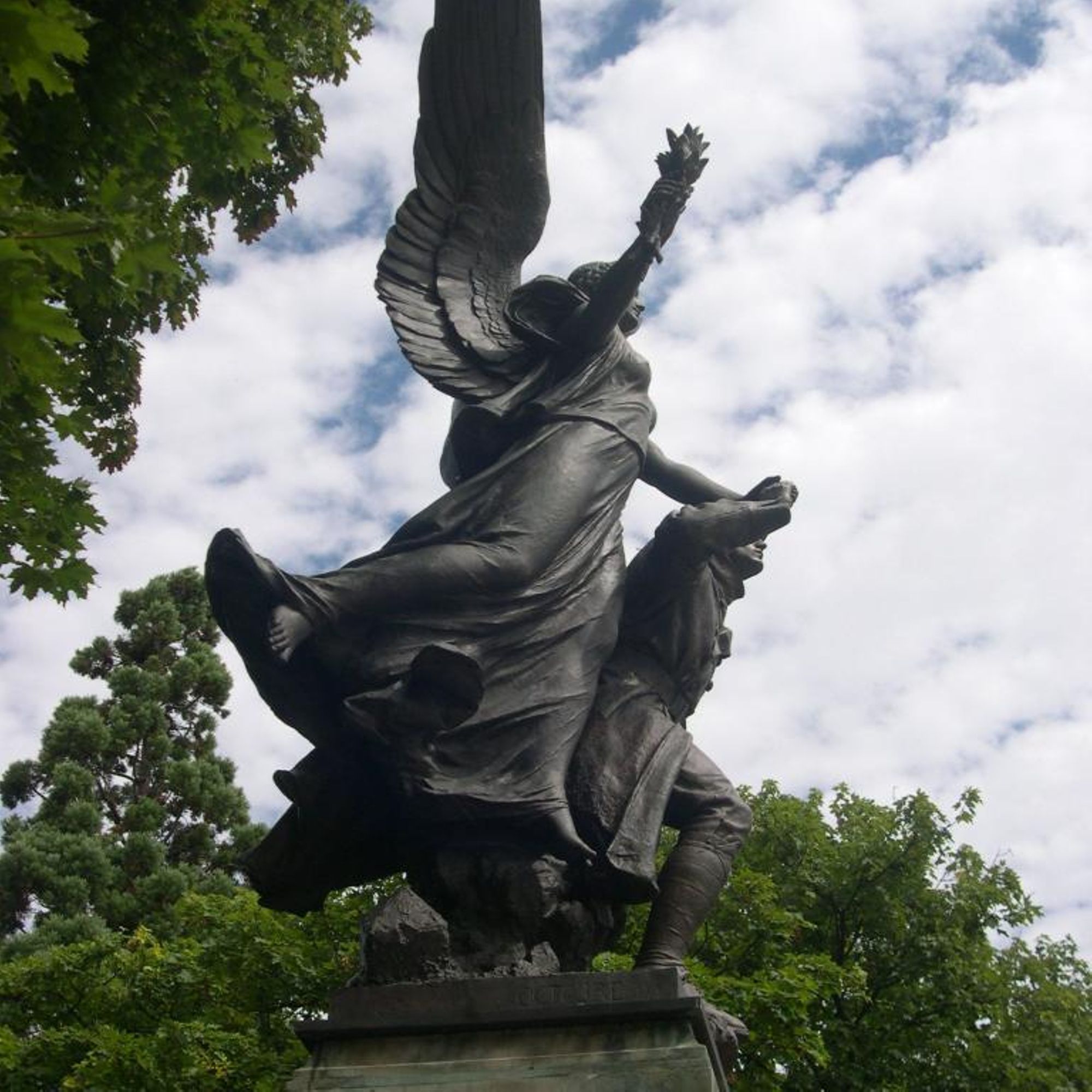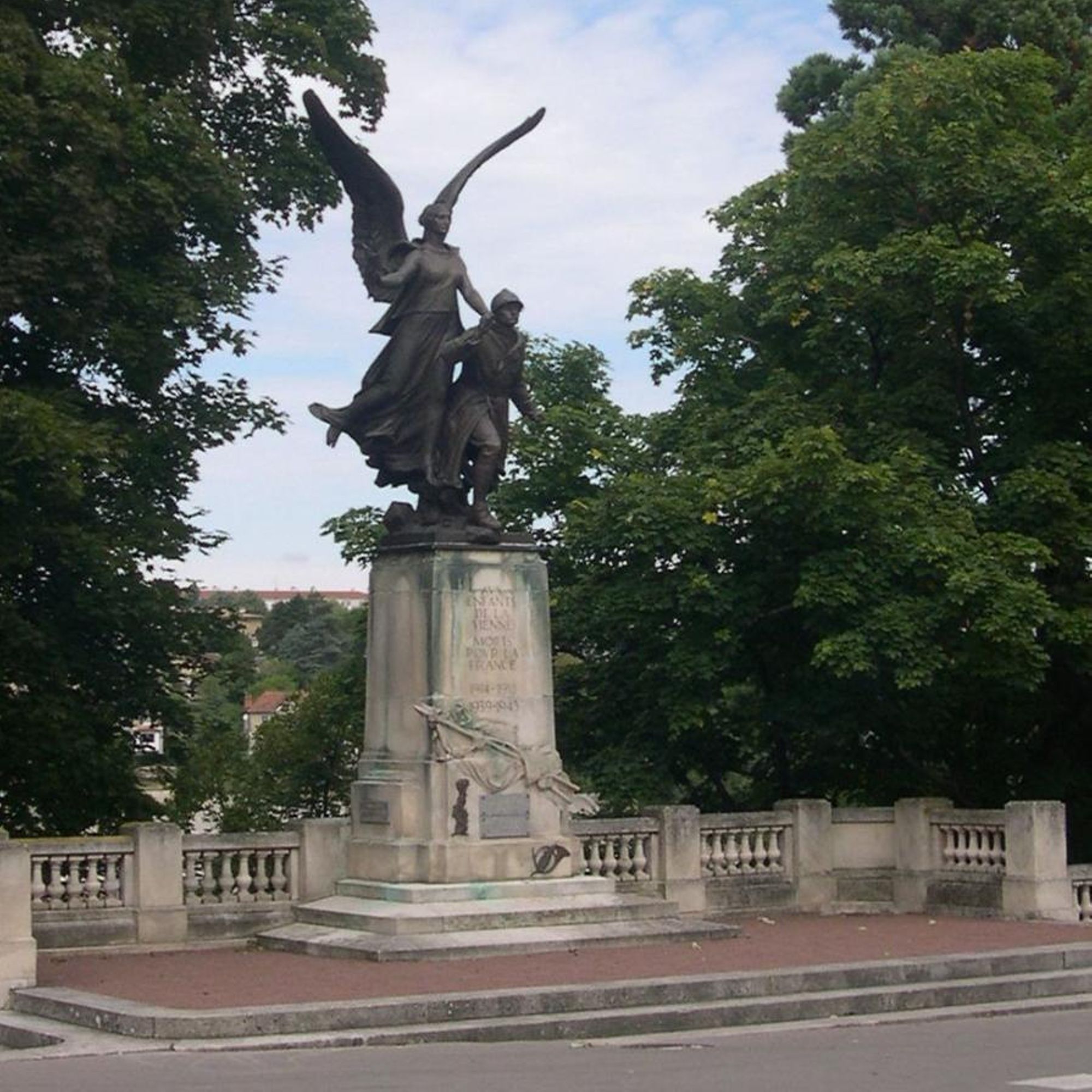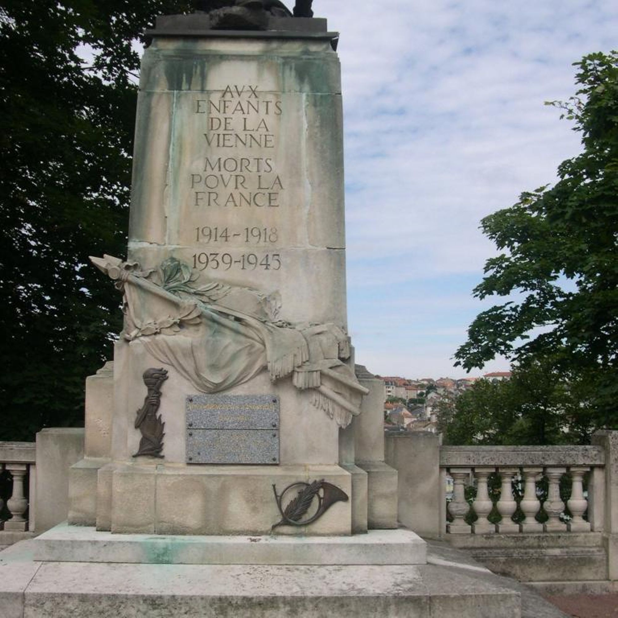 Le socle, qui repose sur des gradins, porte la dédicace "AUX / ENFANTS / DE LA / VIENNE / MORTS / POUR LA / FRANCE / 1914-1918" et l'ajout dans des caractères différents : "1939-1945".