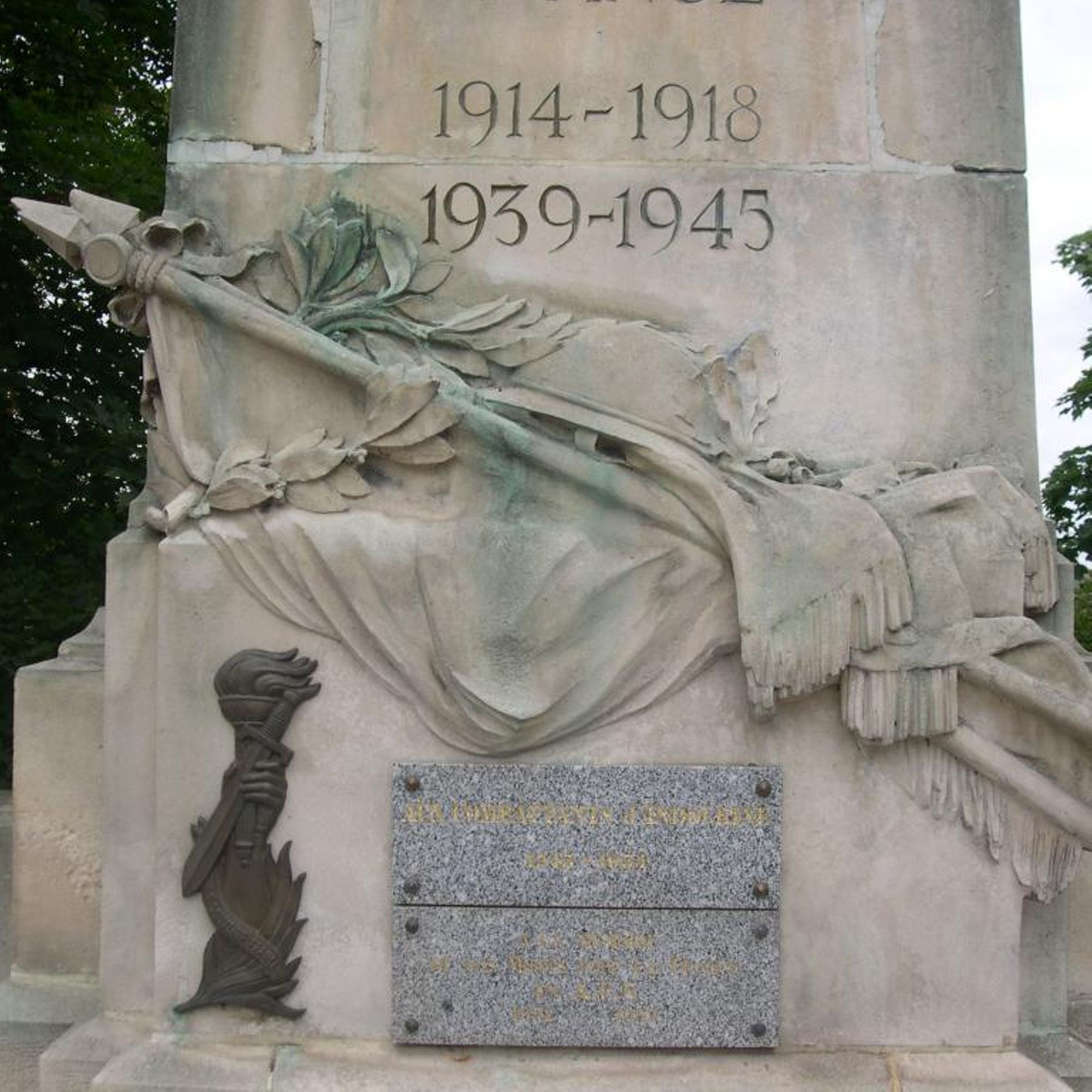 Un flambeau de la Liberté entrecroisé avec un poignard (du Souvenir français) et un cor entremêlé avec une palme (avec l'inscription Sidi Brahim du Poitou), en bronze, ont été apposés sur la face du socle, ainsi que plusieurs plaques en marbre, en mémoire des veuves et orphelins de guerre, des combattants d'Indochine et des Anciens d'Afrique du Nord.