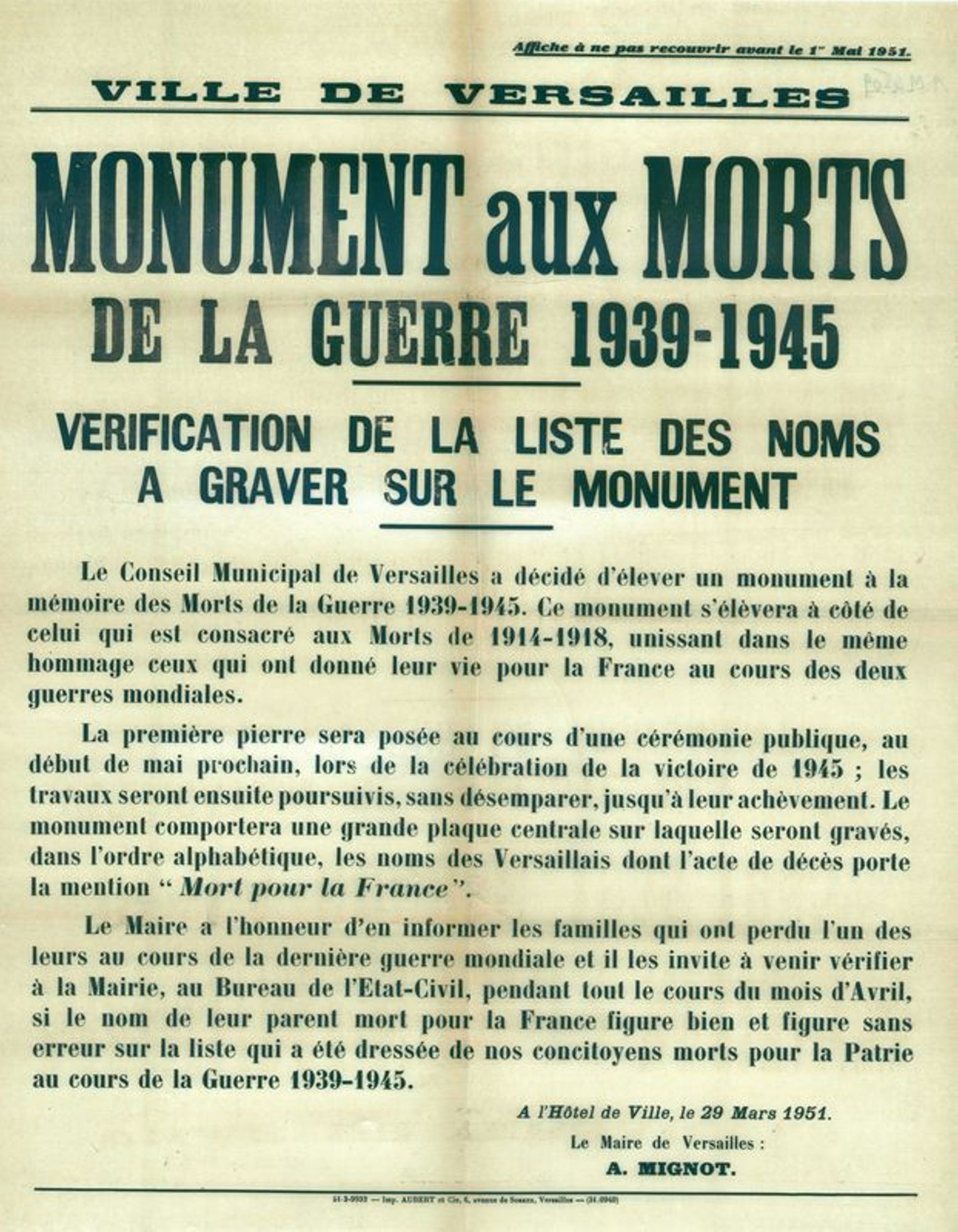 Monument aux morts de la guerre 1939-1945. Vérification de la liste des noms à graver sur le monument. Affiche
