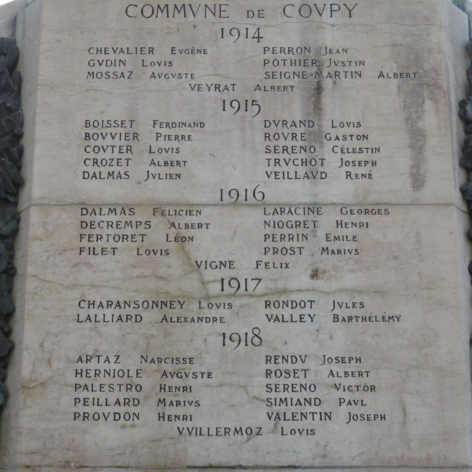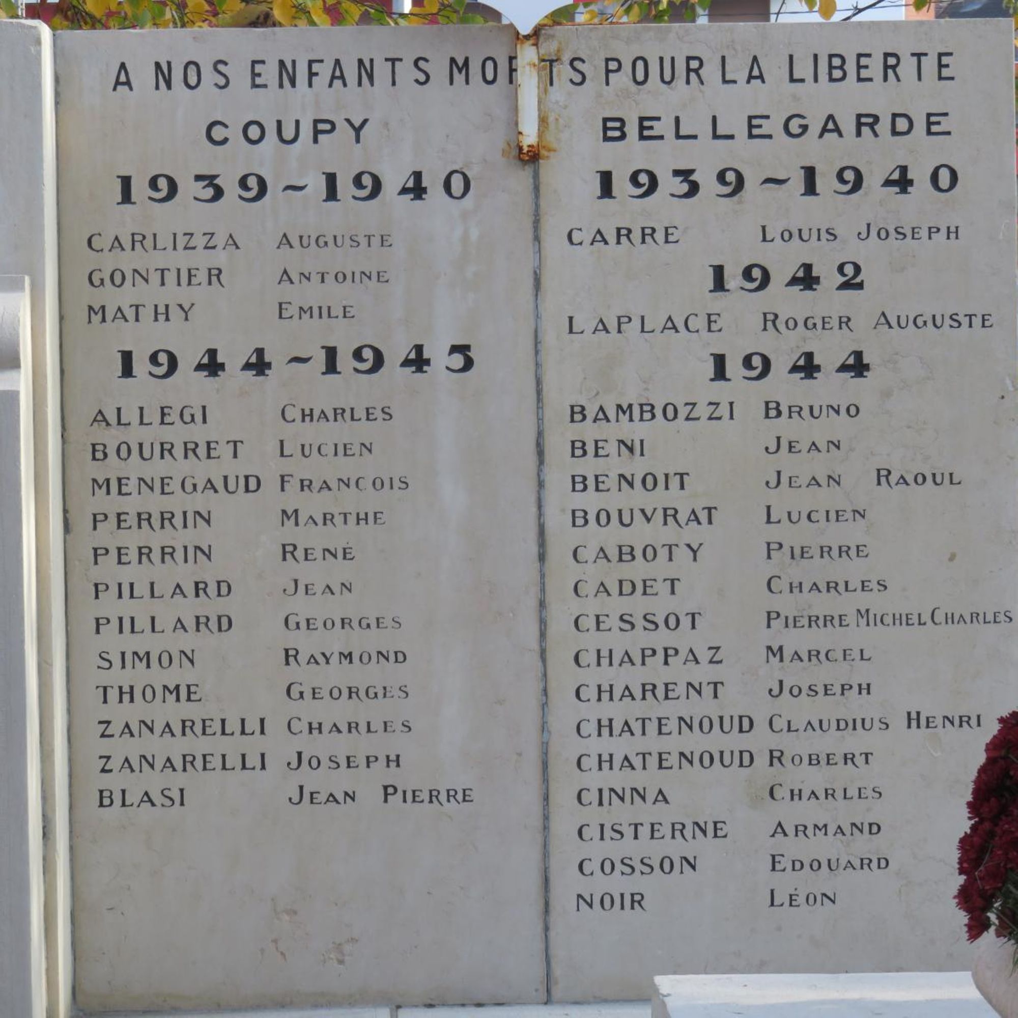 Derrière le monument, stèles ajoutées en 1947. 15 noms pour Coupy, 53 pour Bellegarde de 1939 à 1945 et