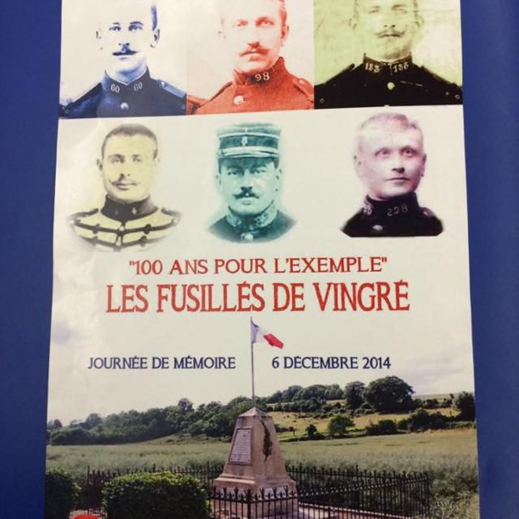 Samedi 6 décembre 2014 - JOURNÉE DE MÉMOIRE - "100 ANS POUR L'EXEMPLE" . LES FUSILLÉS DE VINGRÉ - Cérémonie au MONUMENT DES FUSILLÉS - en présence de très nombreuses personnalités dont Laurent OLIVIER, sous-préfet de l'arrondissement de SOISSONS, les parlementaires, Marie-Francoise BECHTEL, députée, Yves DAUDIGNY, sénateur et Président du Conseil général, Antoine LEFEVRE, sénateur-maire de Laon, Pierre ERBS, maire de Nouvron-Vingré, Jean-Luc PAMART, Président de l'association Soissonnais 14-18, Jean-Luc MORAUX, conseil général du canton de Vic-sur-Aisne -