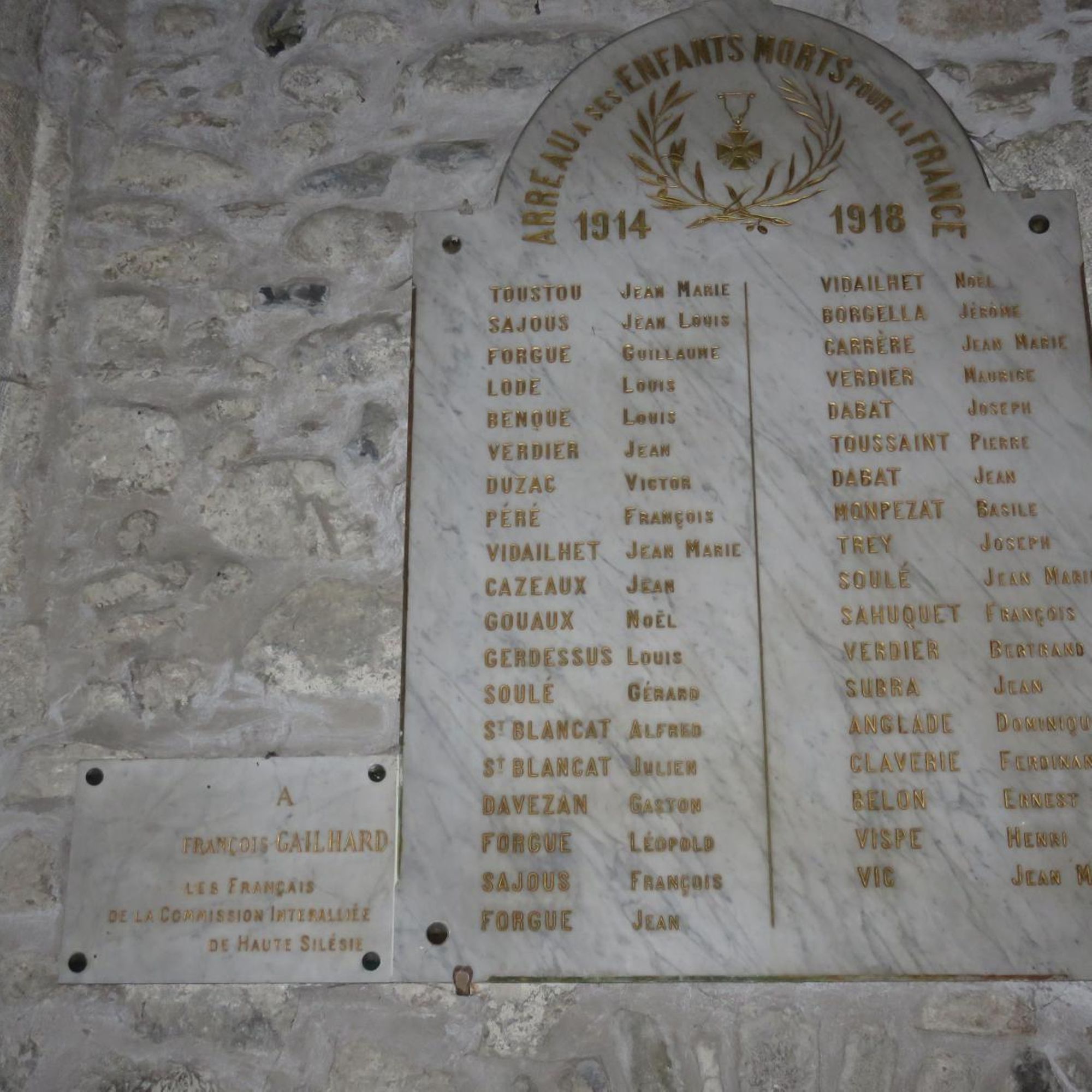 Une seconde plaque offerte par les Français de la Commission Interalliée de Haute Silésie en mémoire de François GAILHARD a été apposée ultérieurement. Le monument communal érigé à proximité de l'église indique que François GAILHARD a été tué le 3 juillet 1922.