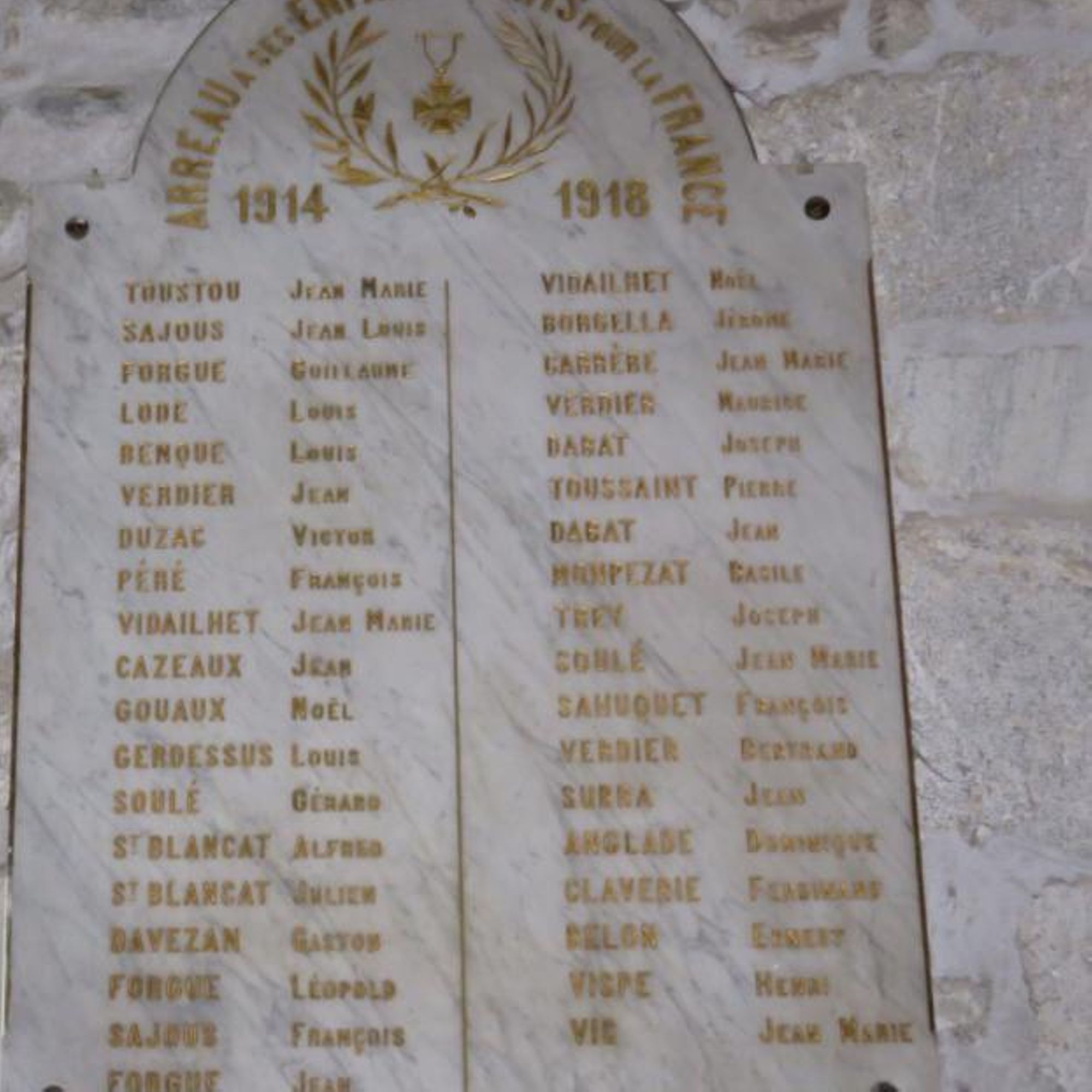 2 plaques commératives constituent le monument. La plus importante comprend les noms, gravés dans le marbre, de 37 soldats morts pour la France pendant la guerre 1914-1918. Trois noms gravés sur le monument communal n'apparaissent pas sur cette plaque: Vignau Jean Joseph, Duchan Casimir et Verdier Emile, ces deux derniers noms ayant été gravés tardivement sur le monument communal.