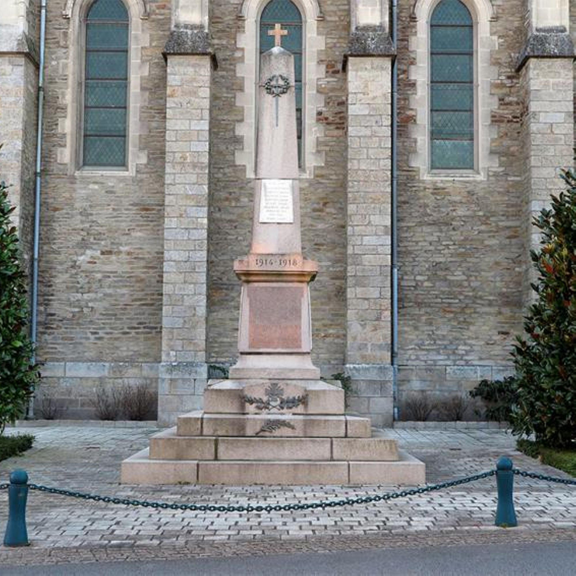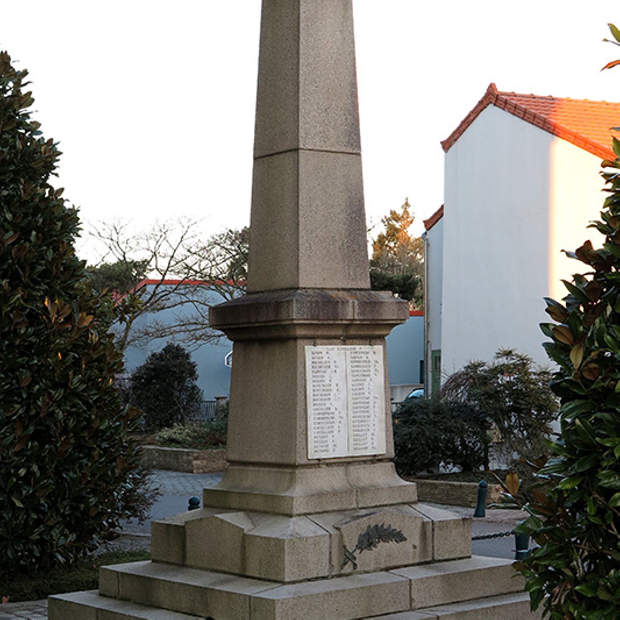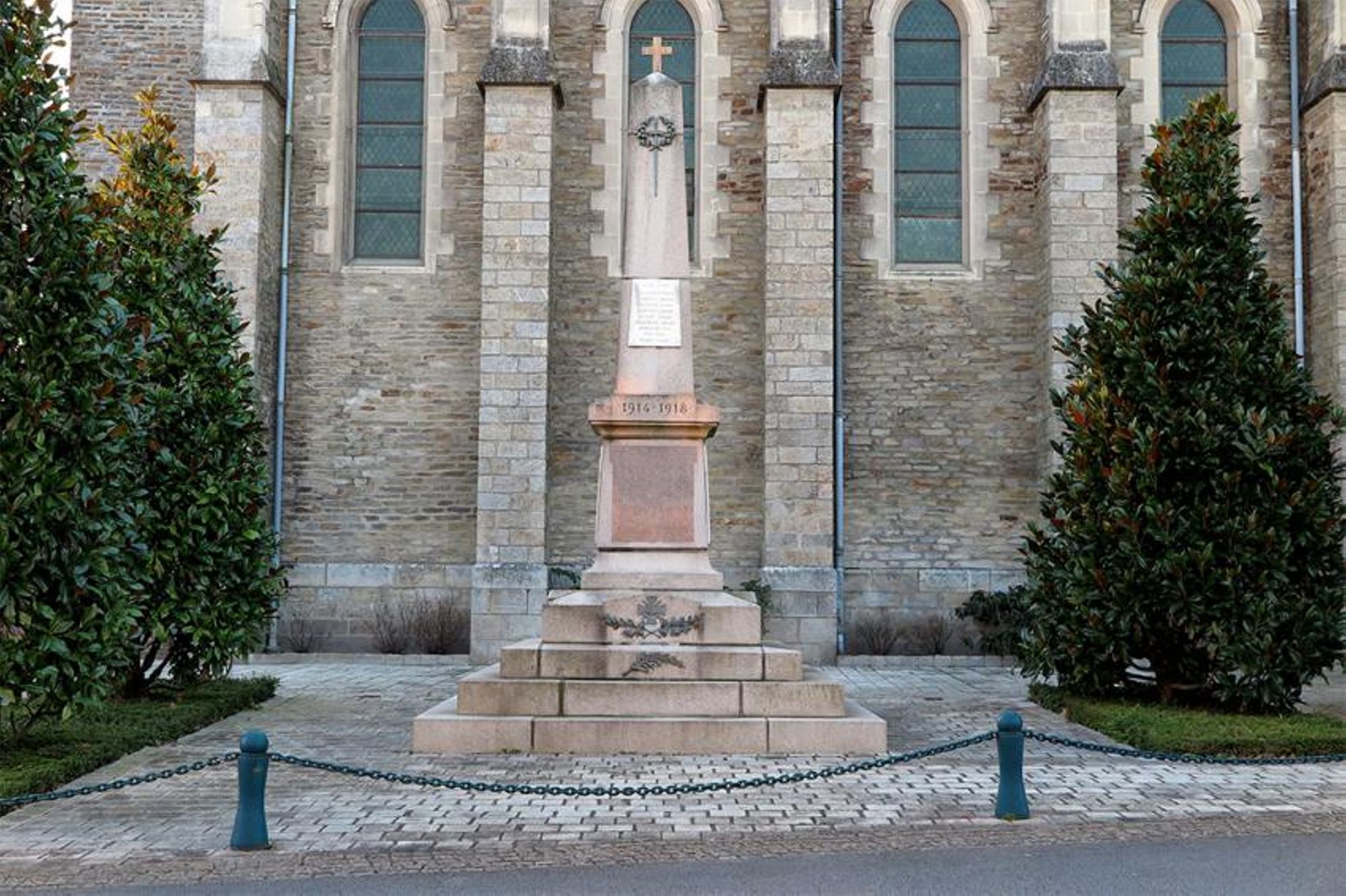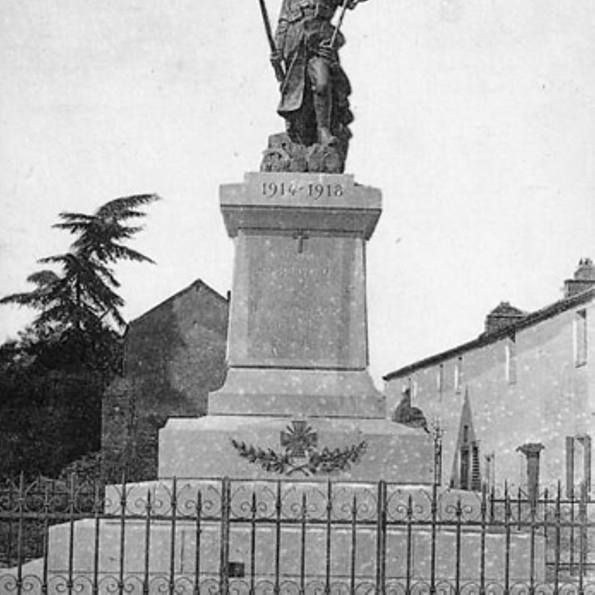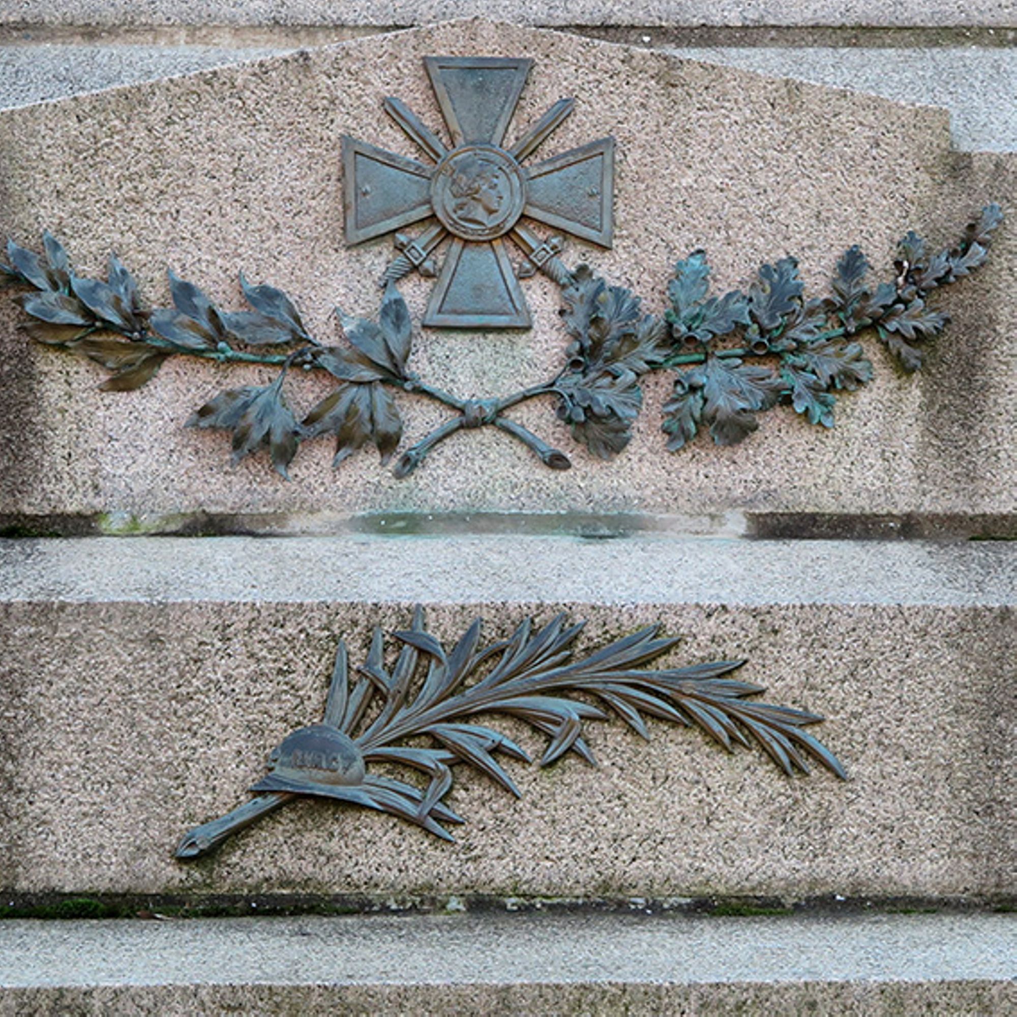 En façade sur le socle : croix de guerre avec rameaux - casque de Poilu avec rameau