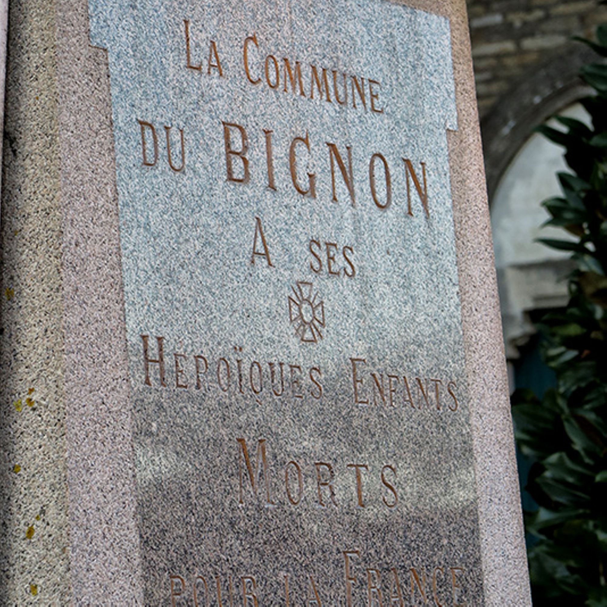sur le côté gauche une branche de lauriers avec casque portant les inscription "unis comme au front" , "les jeunes du Bignon à leur ainés 12-5-35", " à nos enfants 1914-1918"