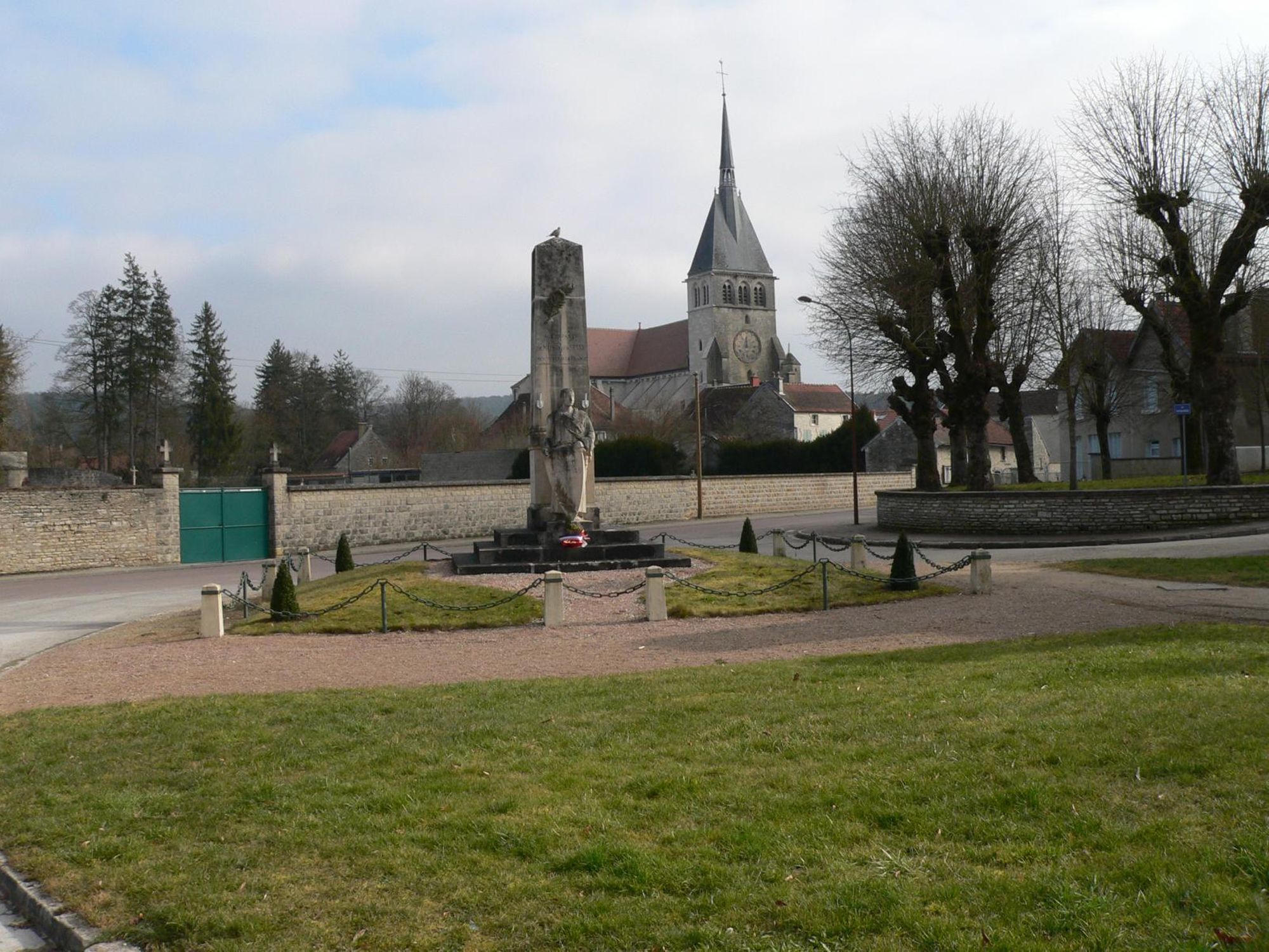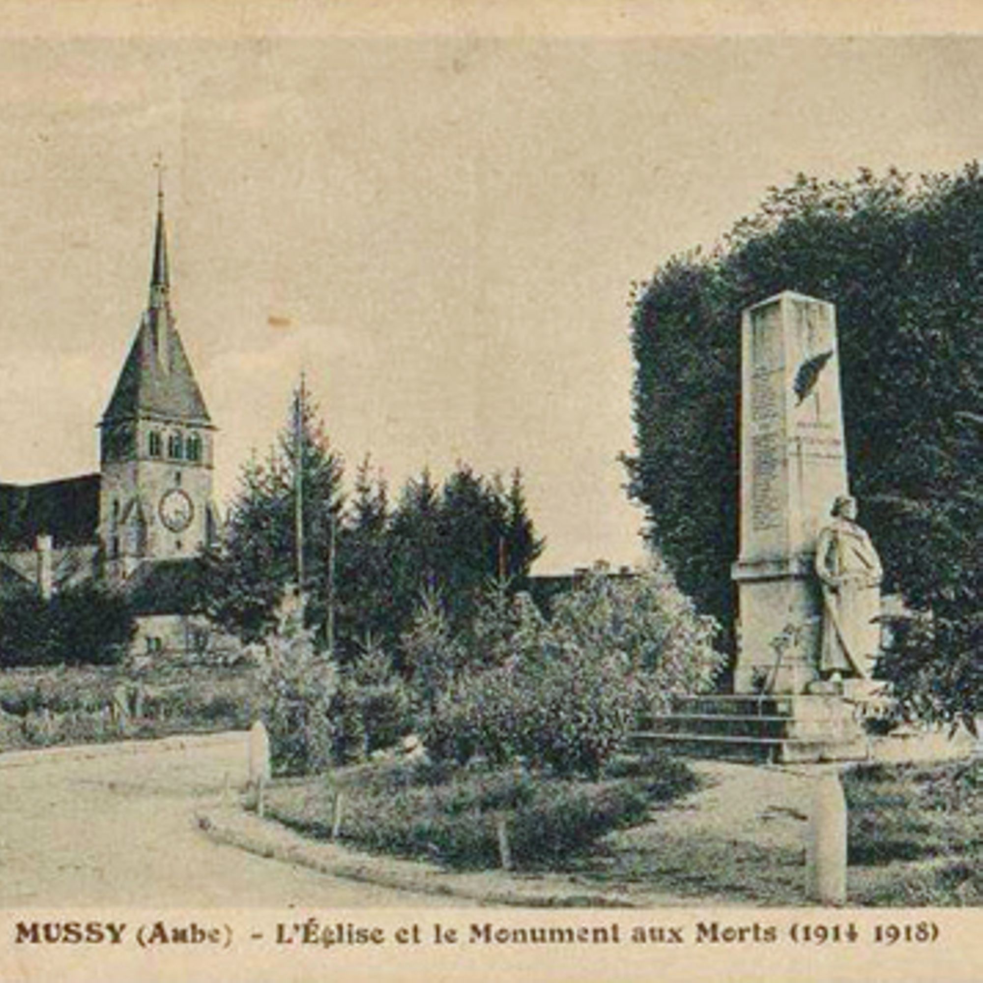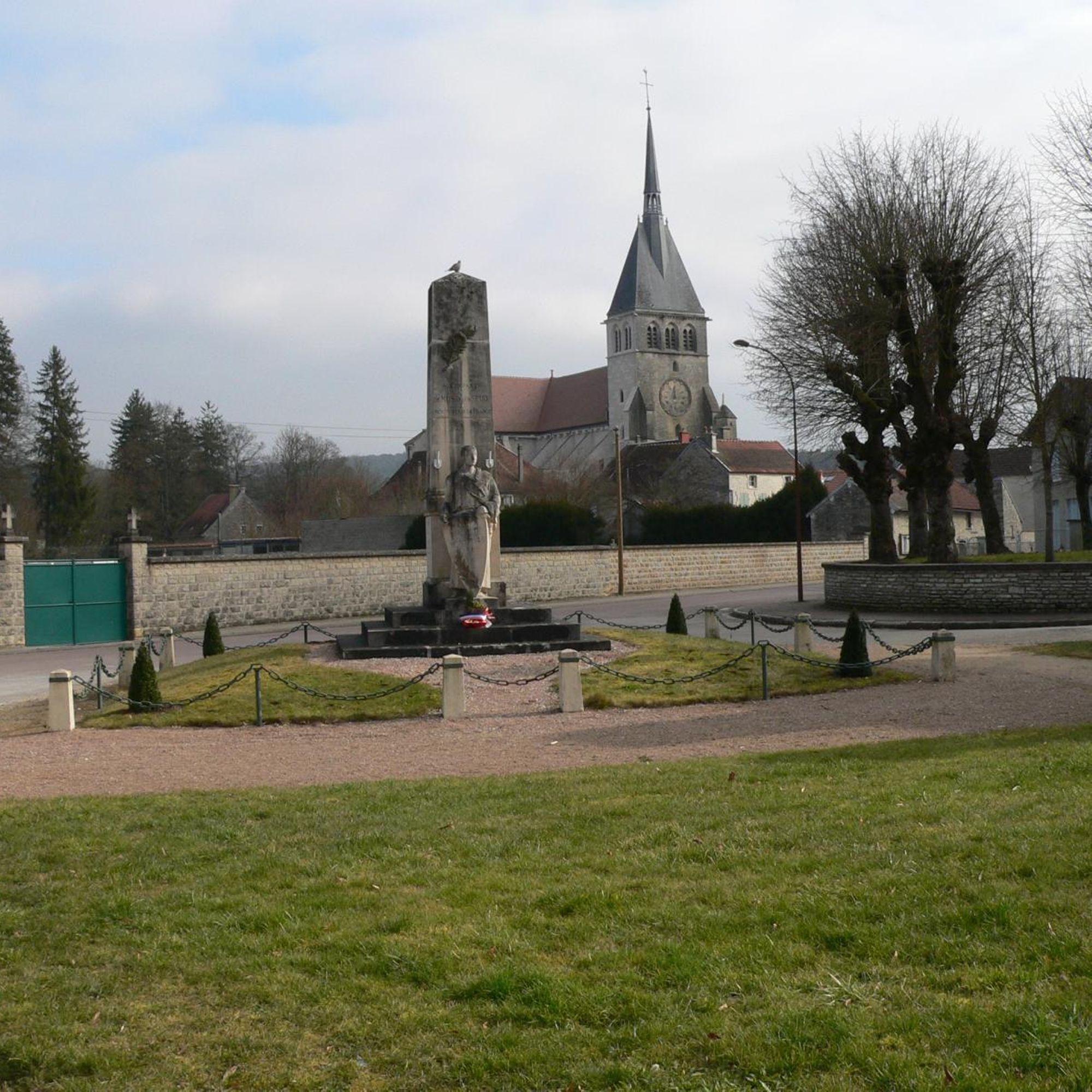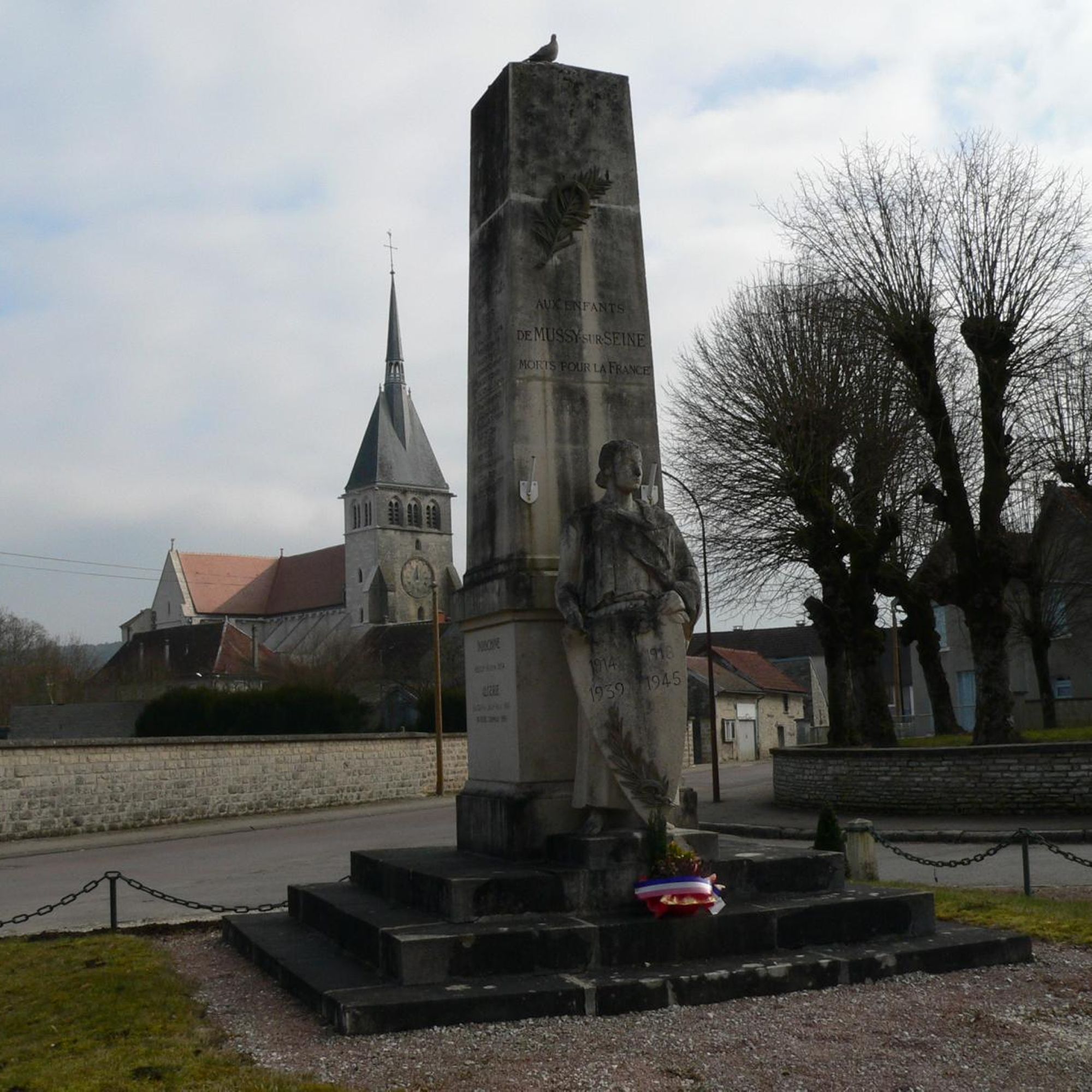 Monument en pierre de type obélisque avec une statue d'allégorie de la victoire tenant un pavois.