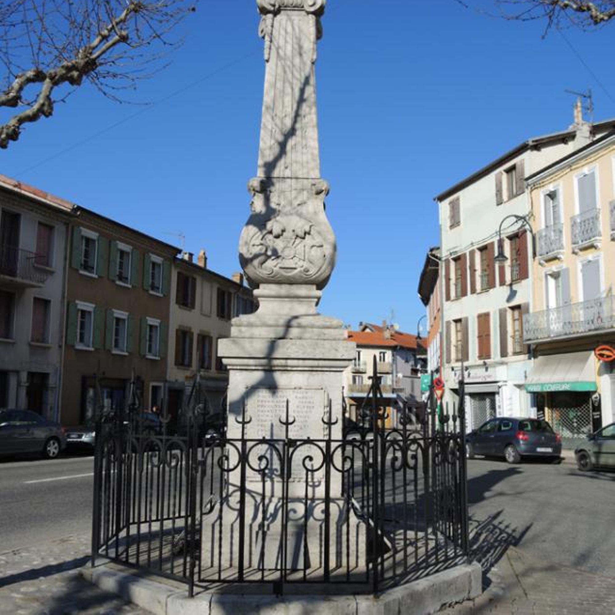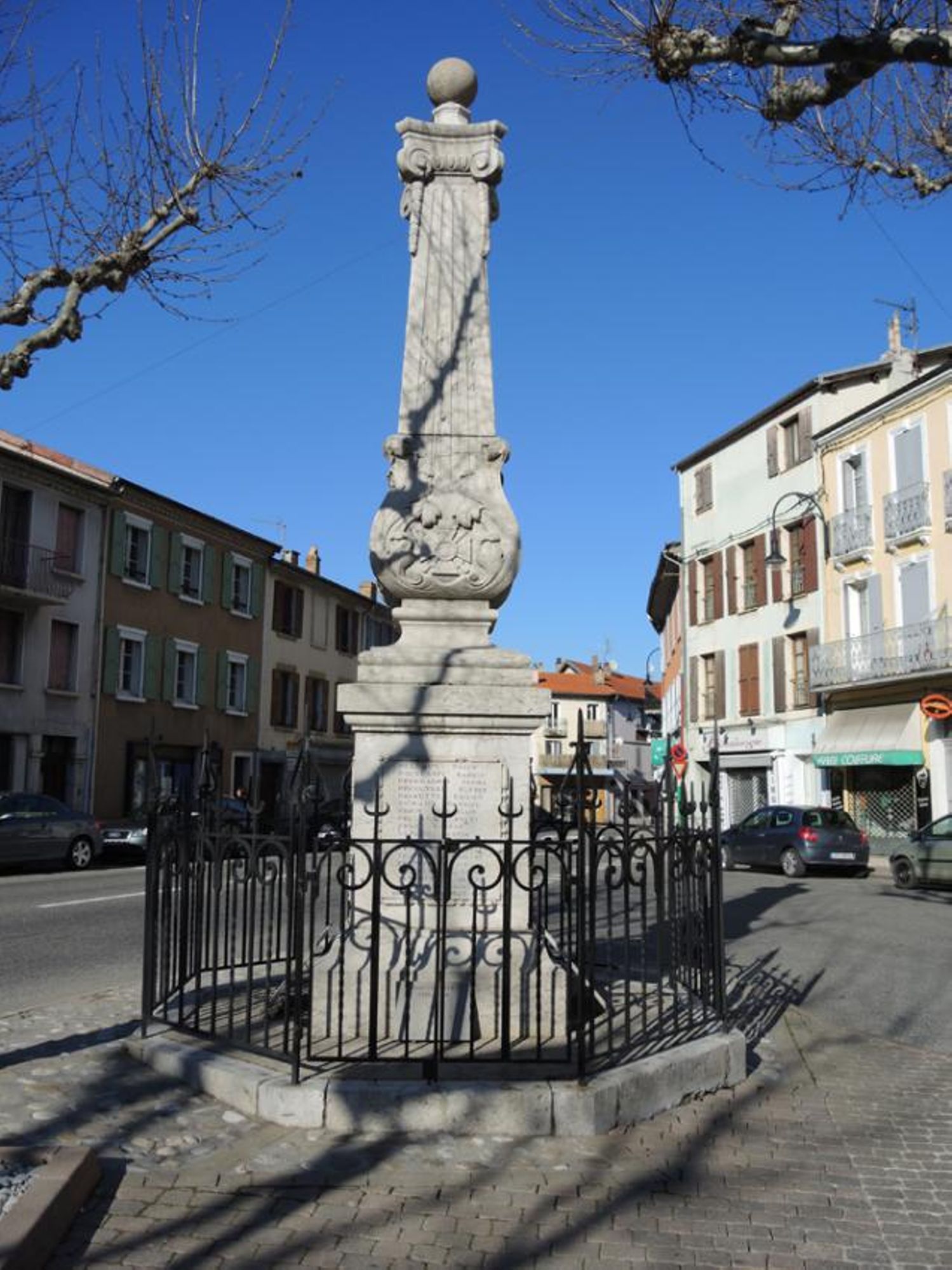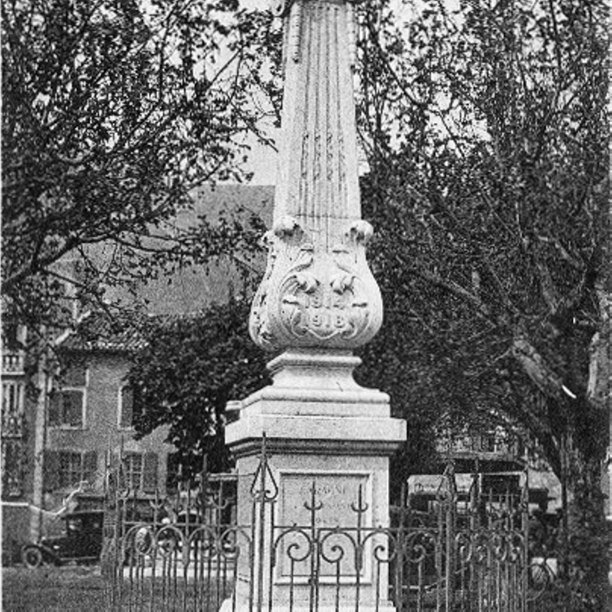 Monument posé sur un socle bas octogonal entouré d'une grille. Il est constitué d'un piédestal supportant un pilier cannelé en forme de pyramide élancée et tronquée, enserrée à la base dans une corbeille de feuillage. Ce pilier supporte un chapiteau ionique sur lequel est posé une boule.Des guirlandes pendent sous les volutes du chapiteau.