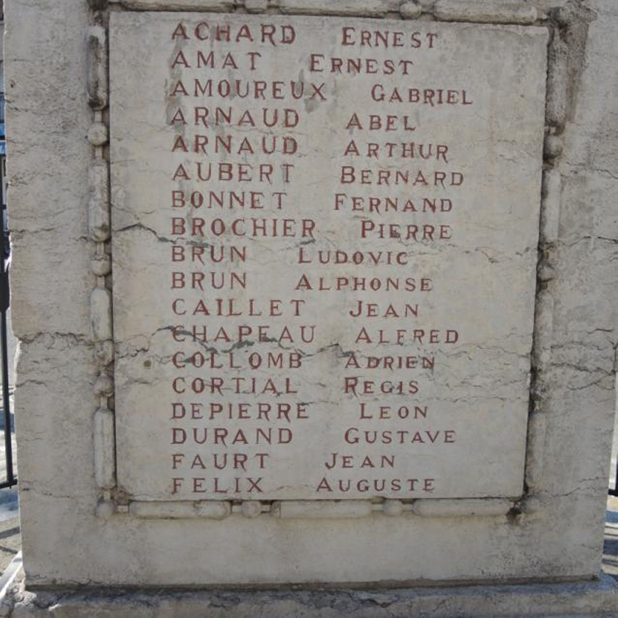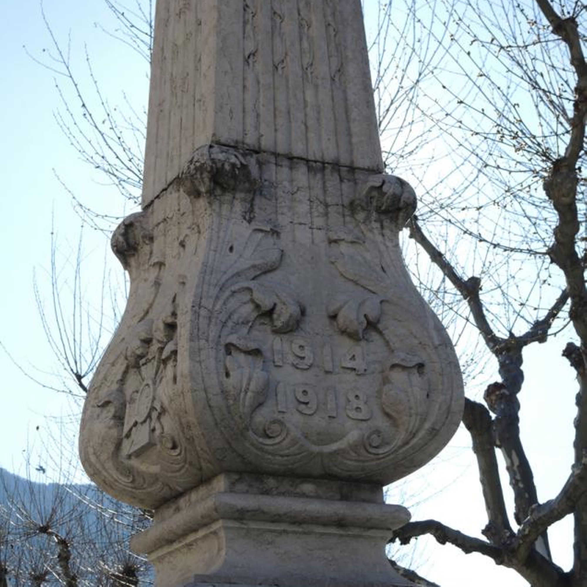 Entre les branches feuillées, croix de guerre sur les faces N, O et S, et inscription "1914-1978" sur la face E.
