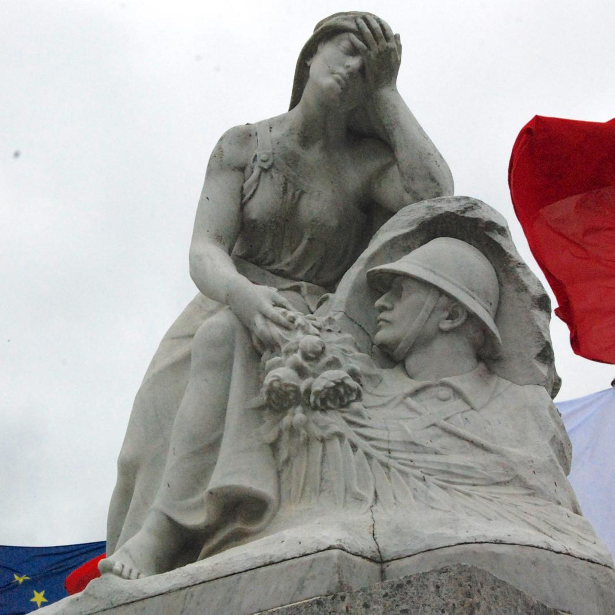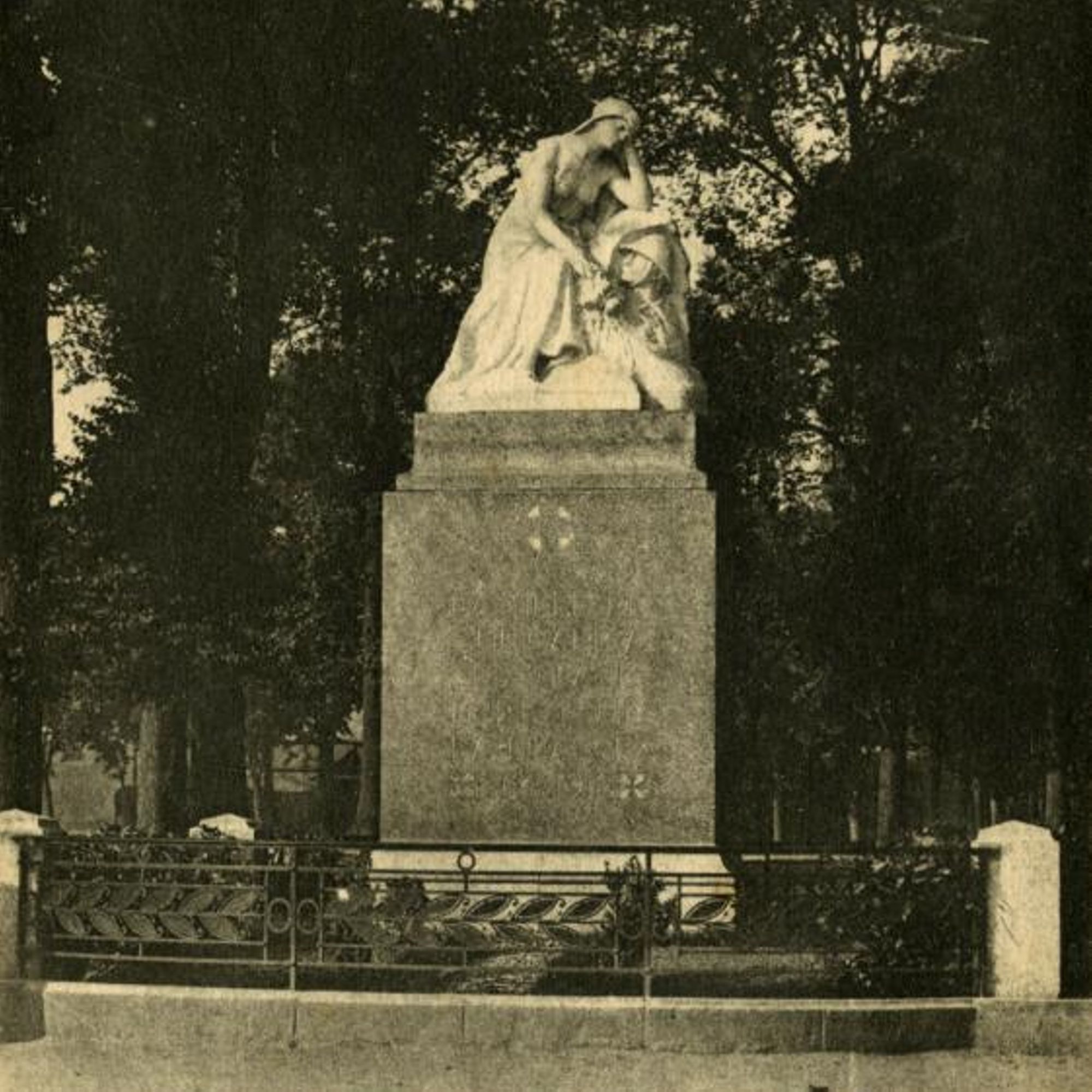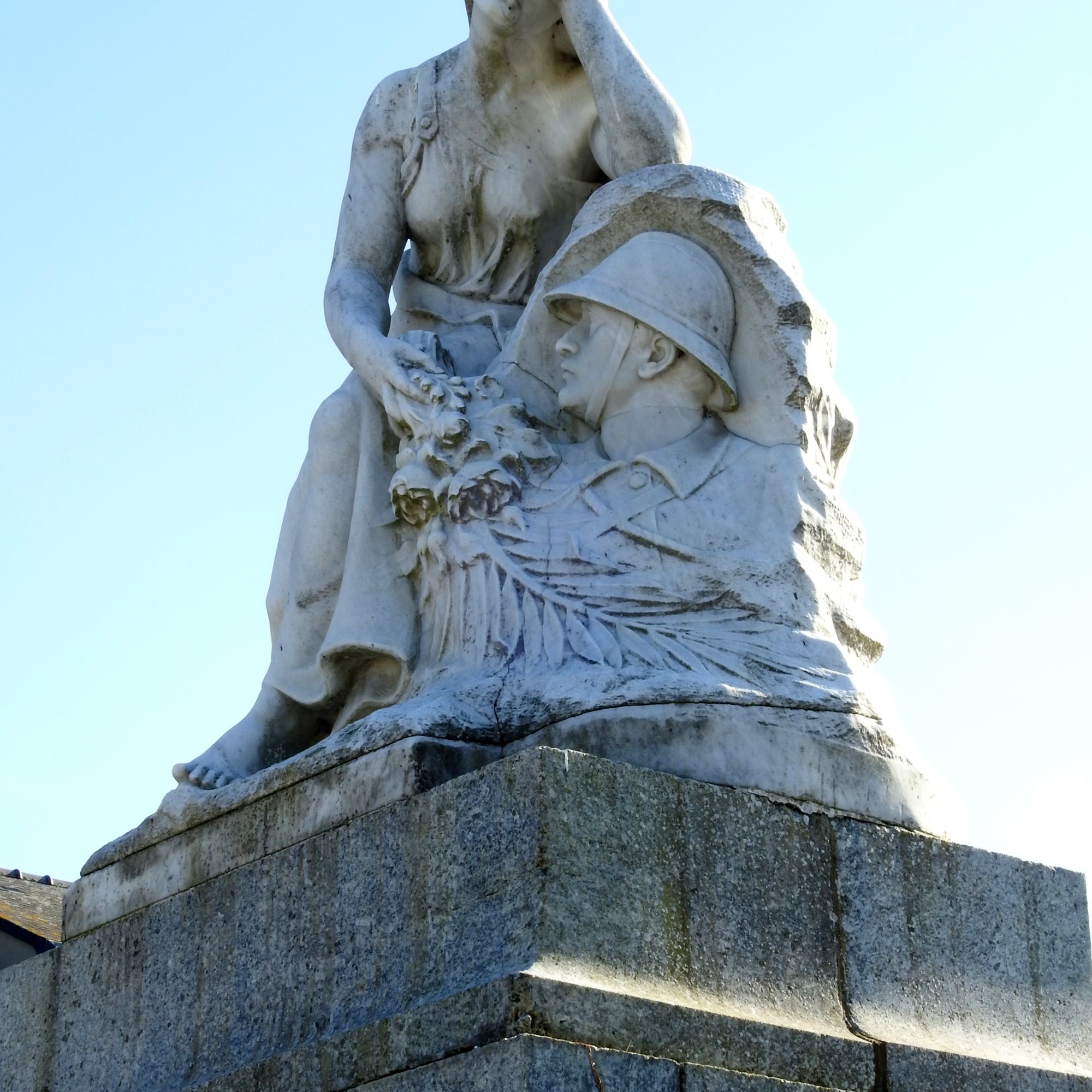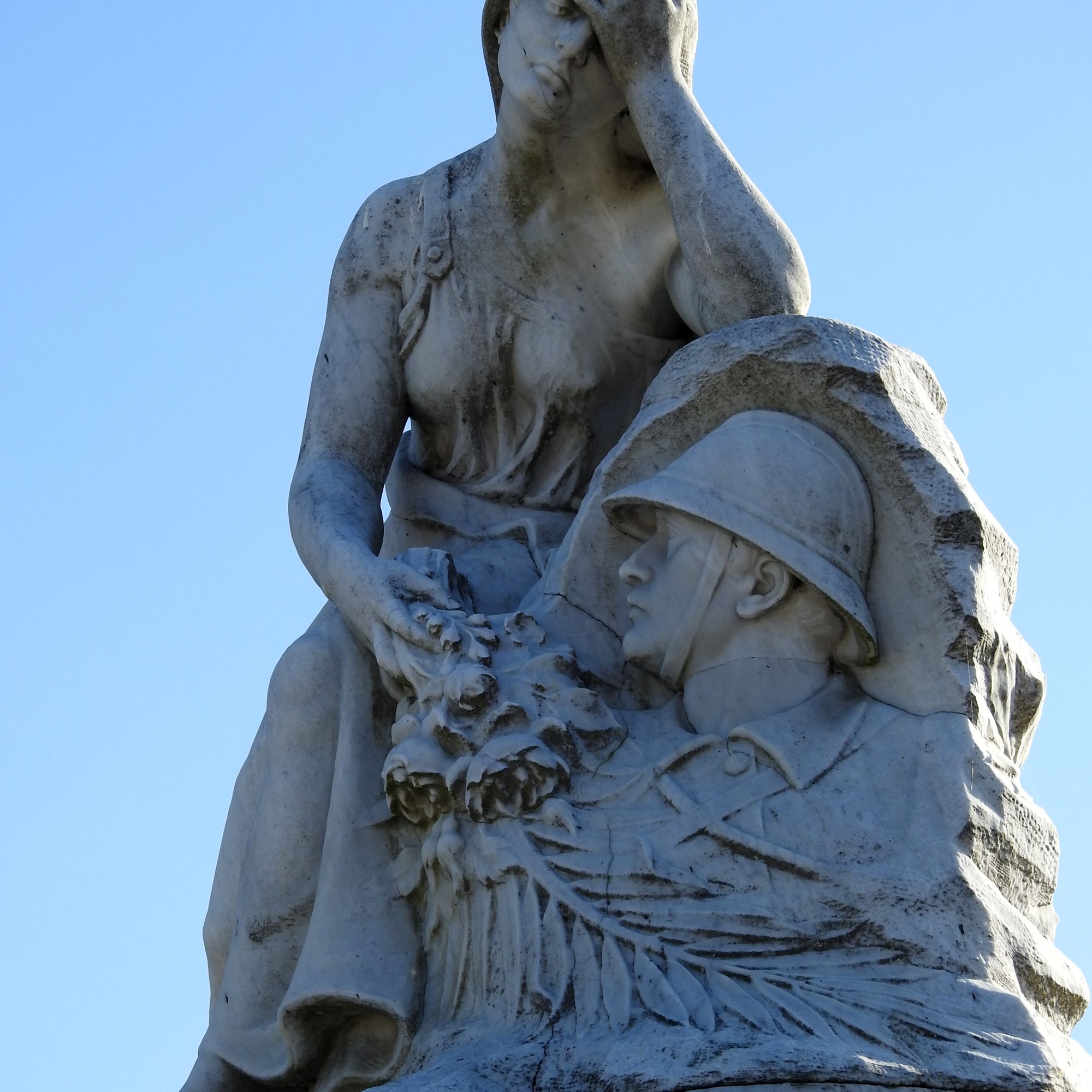 Mausolé avec une femme voilée assise pieds nus près d'un médaillon avec la tête d'un poilu.