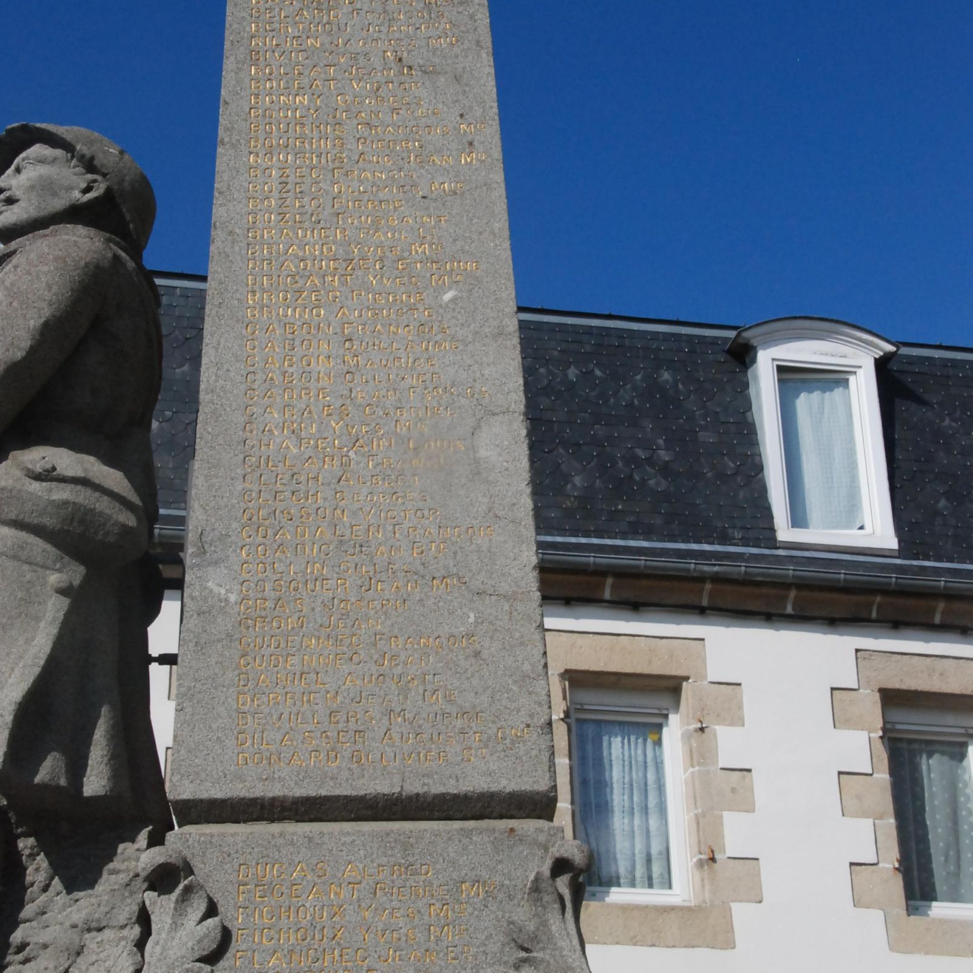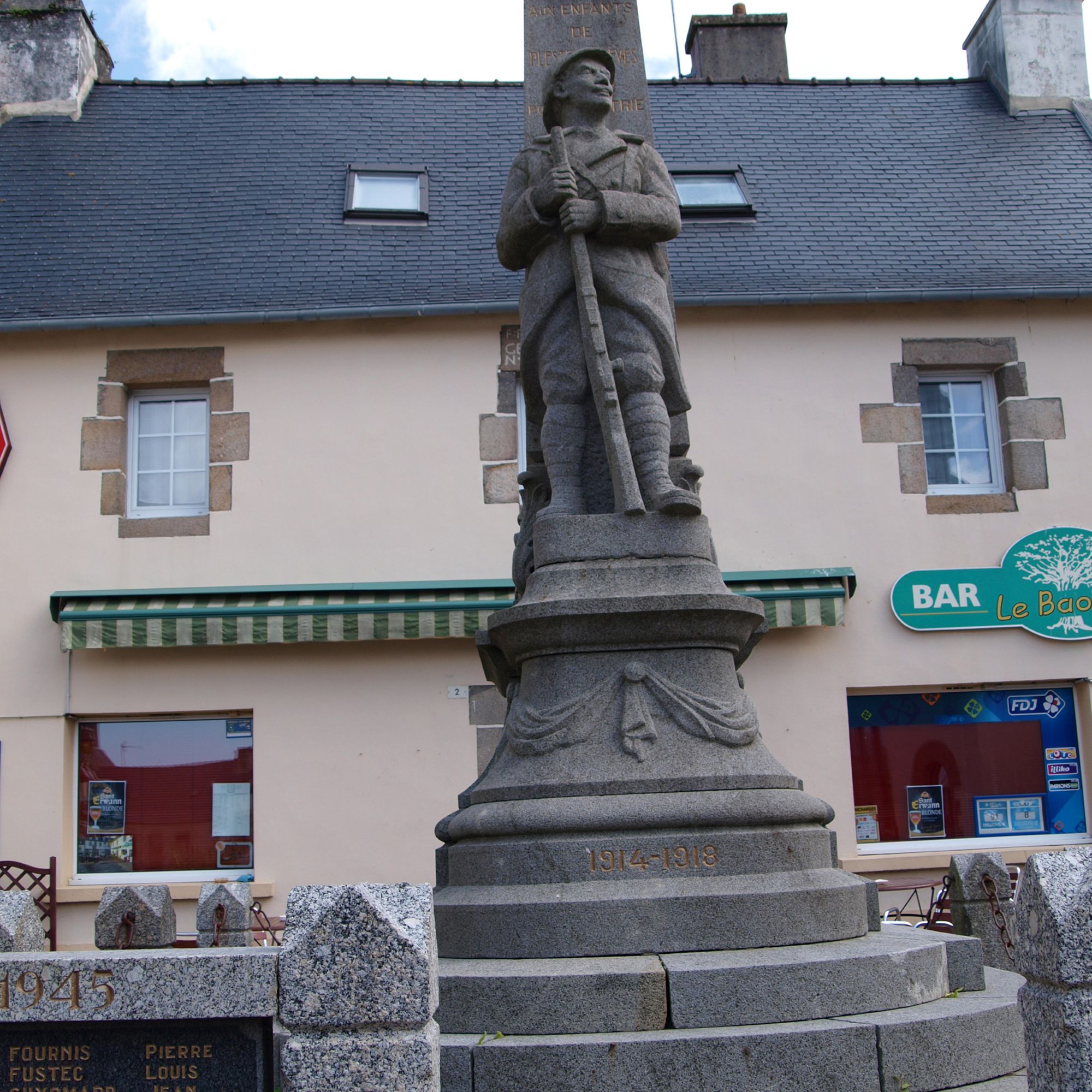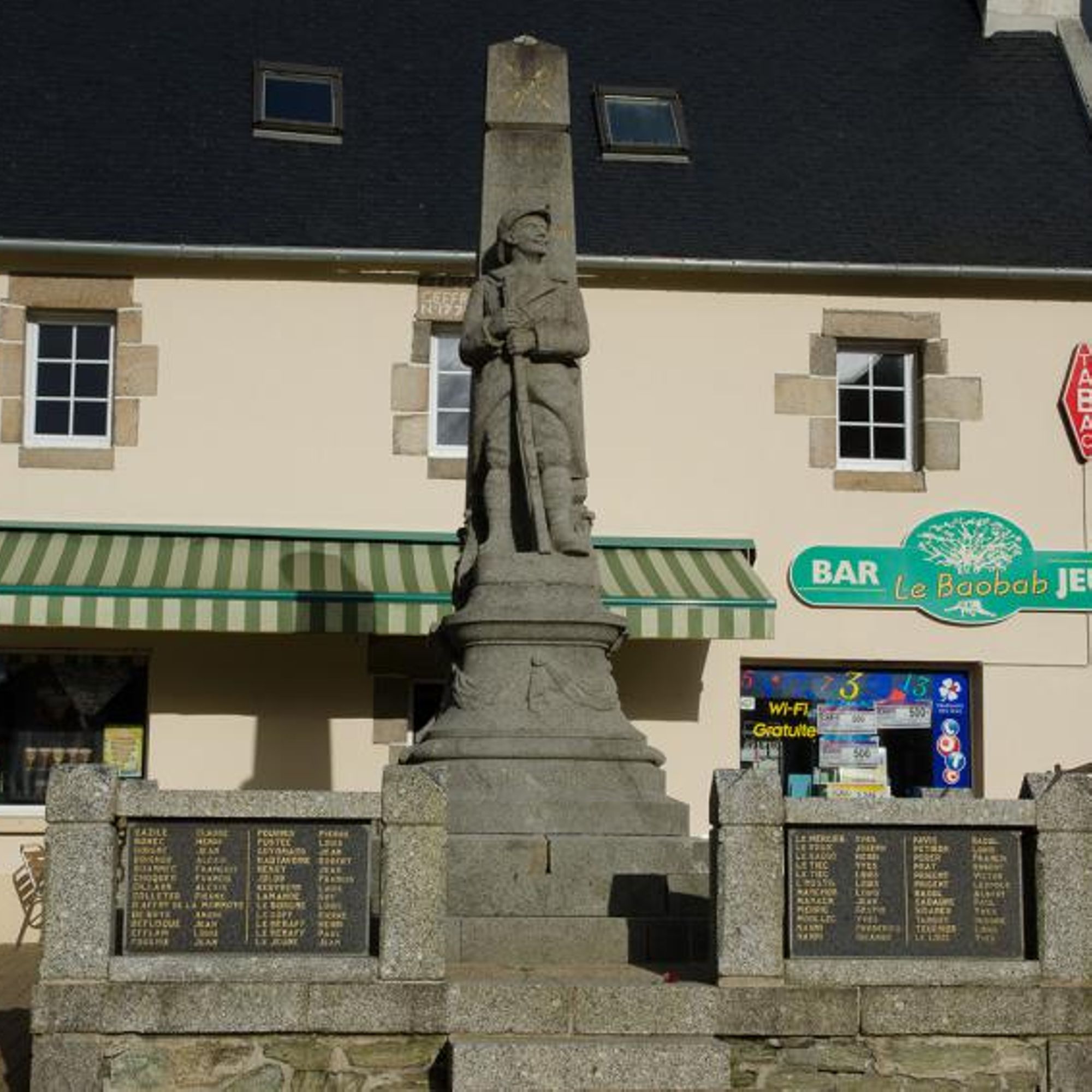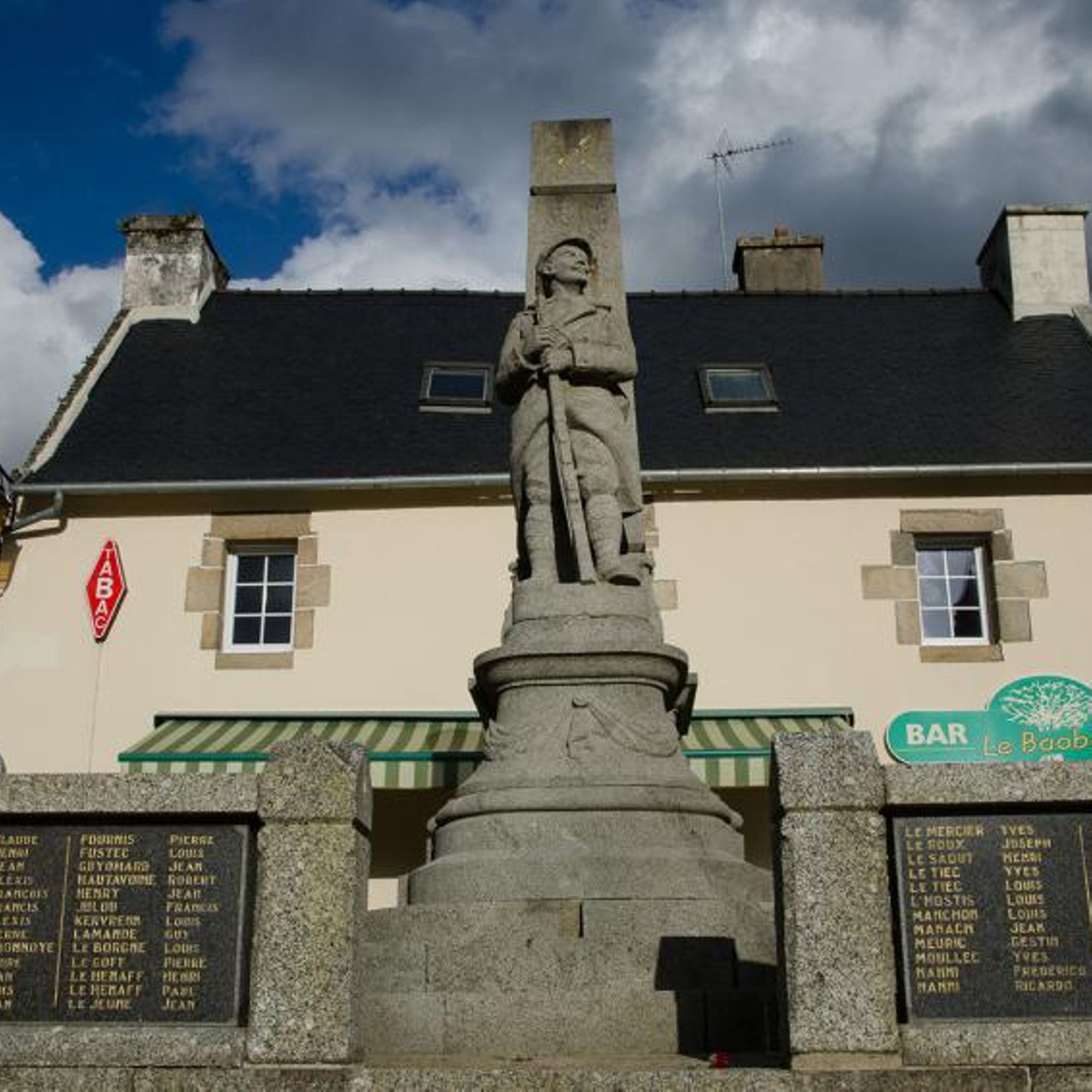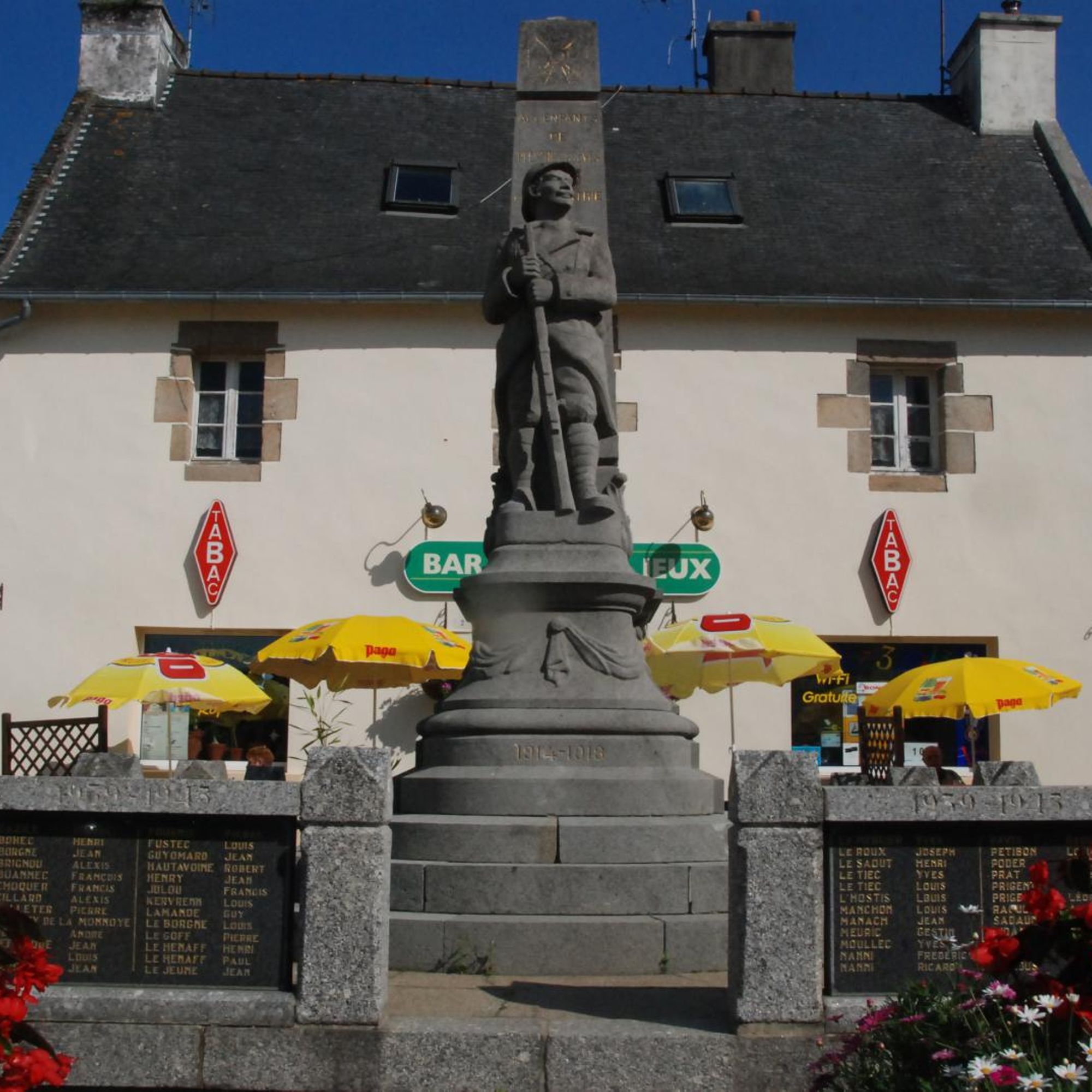 Le monument aux morts est taillé dans de la kersantite. Il a été érigé au milieu d'une plateforme en granite délimité par des piliers reliés par des chaînes (granite bleu provenant de Bégard).