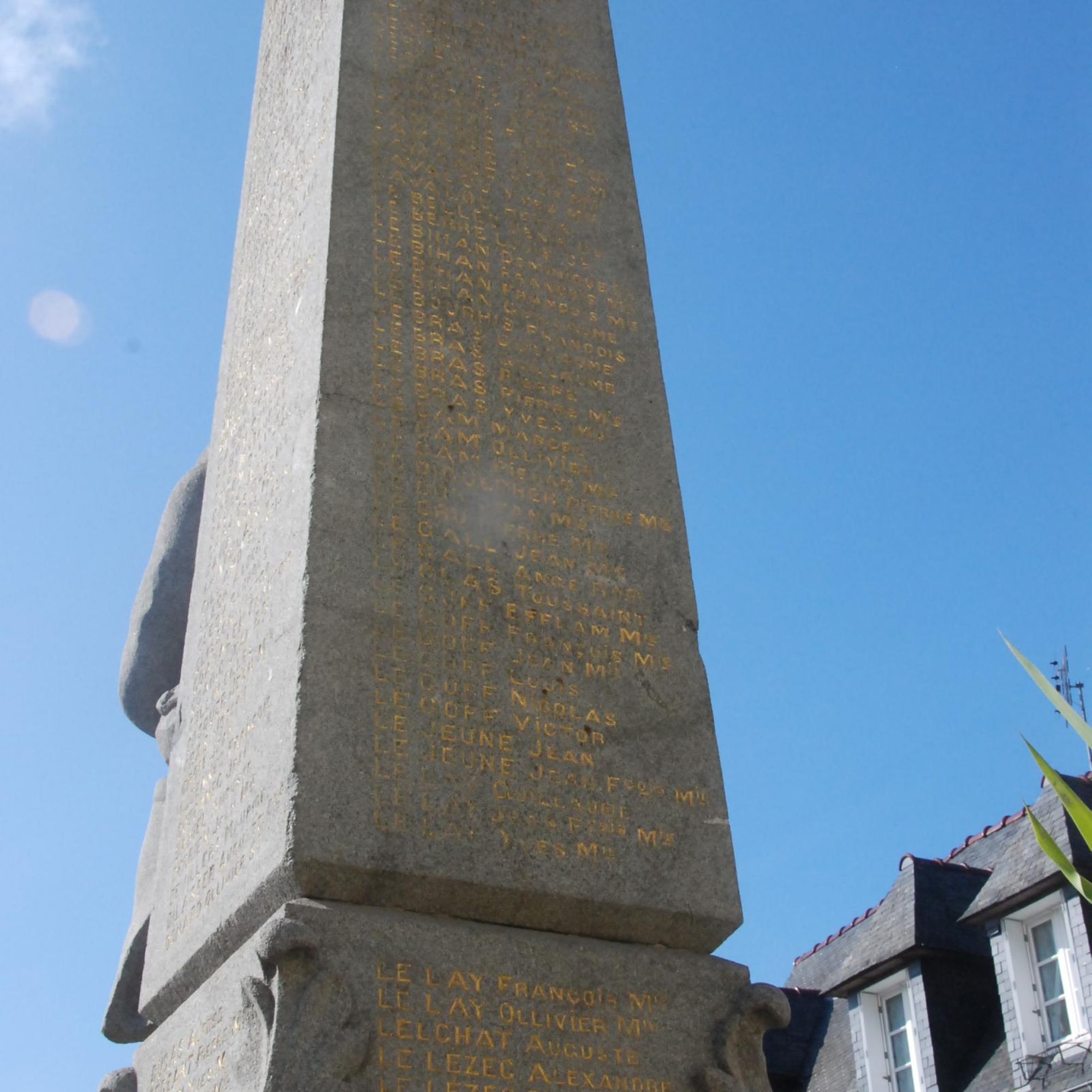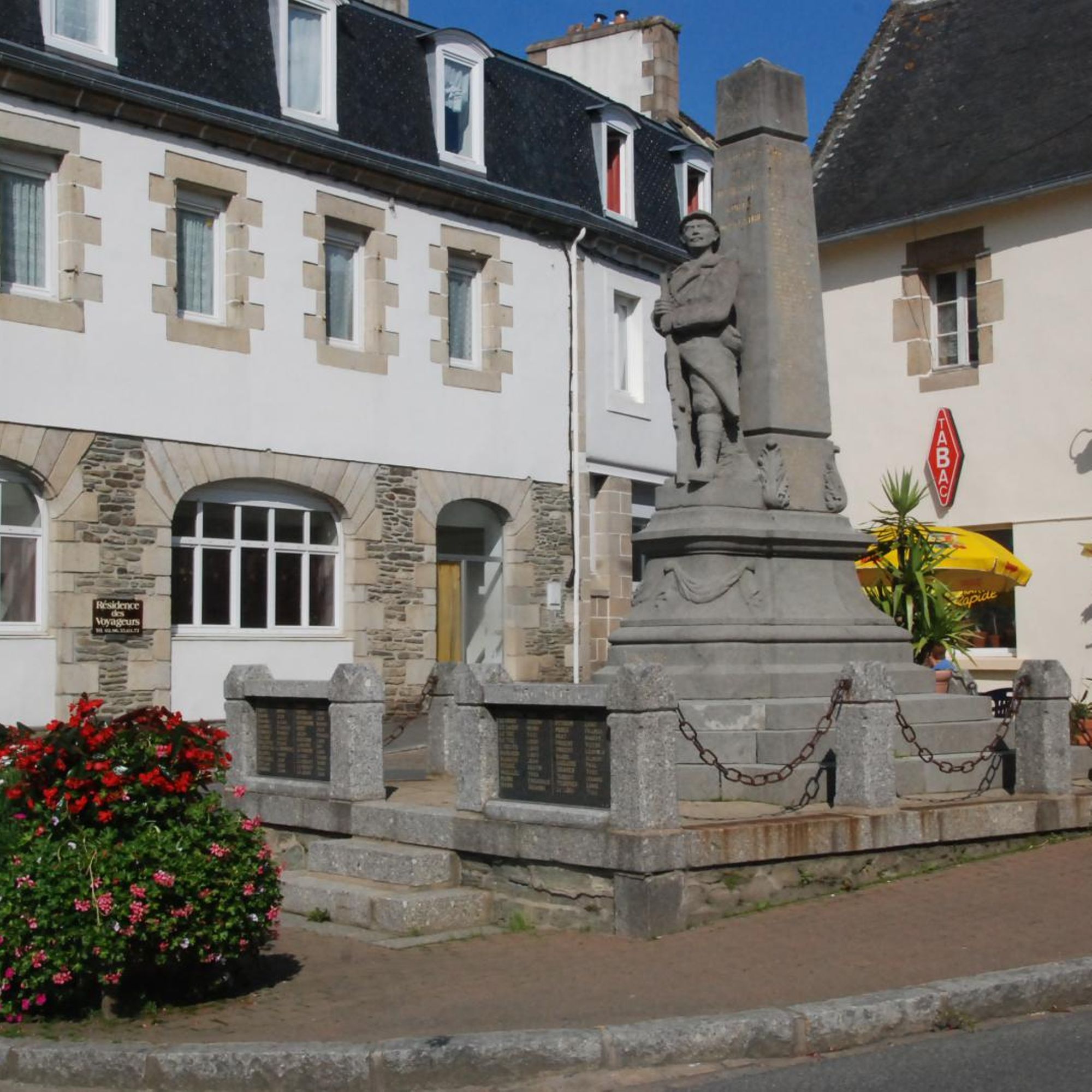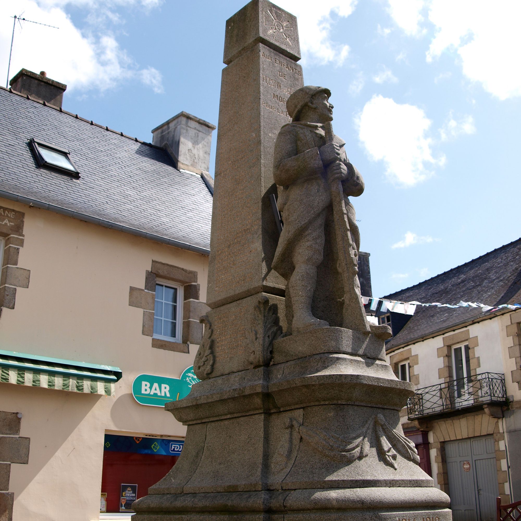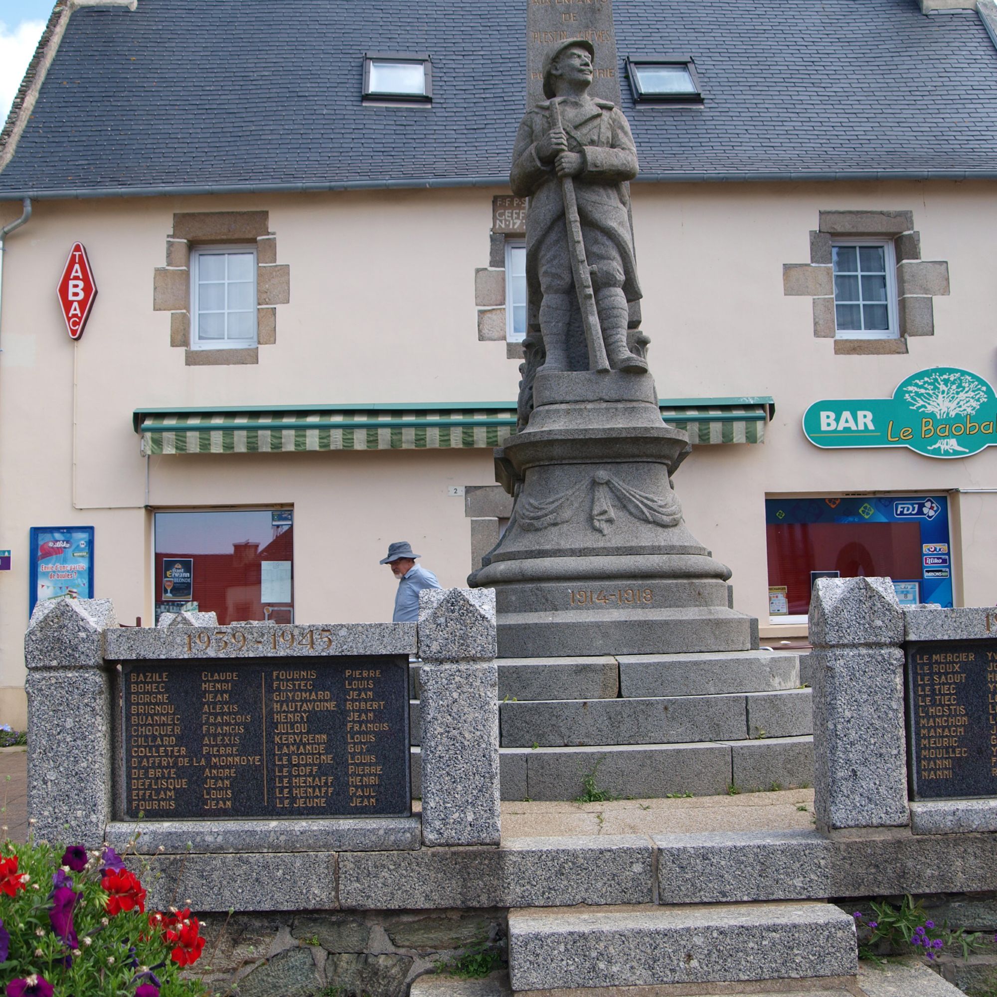 Le monument aux morts est taillé dans de la kersantite. Il a été érigé au milieu d'une plateforme en granite délimité par des piliers reliés par des chaînes (granite bleu provenant de Bégard).