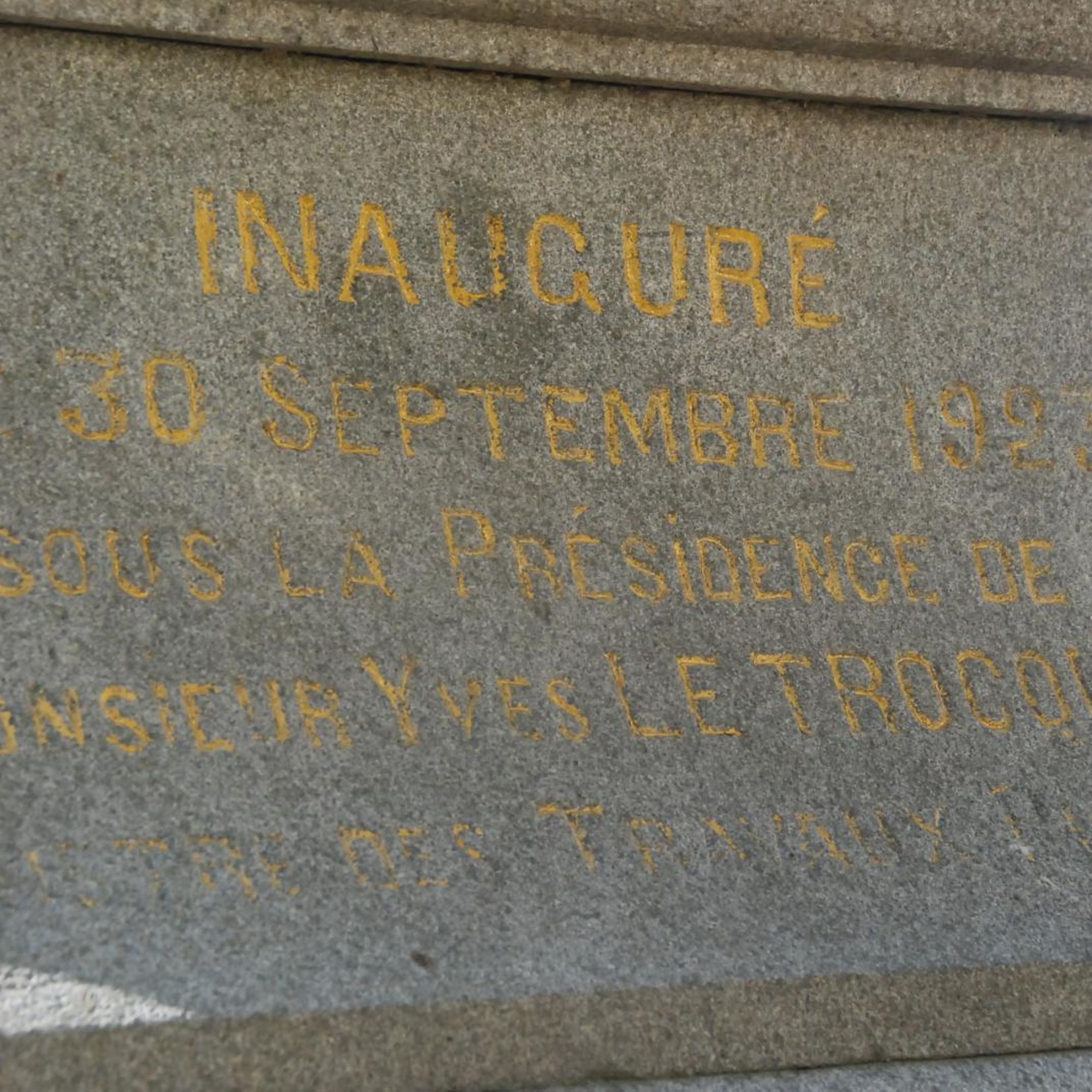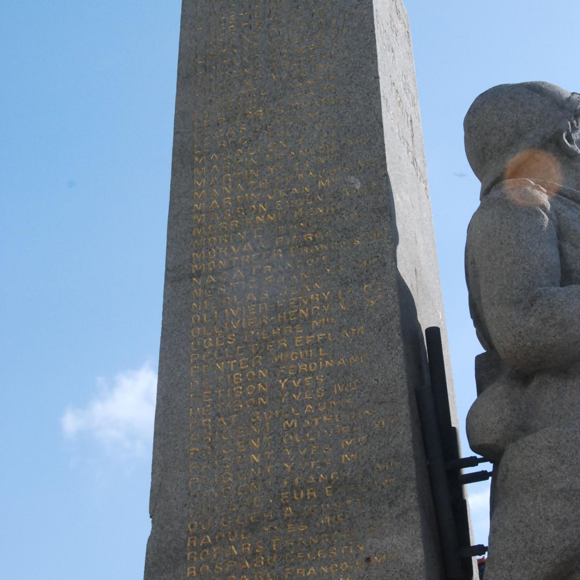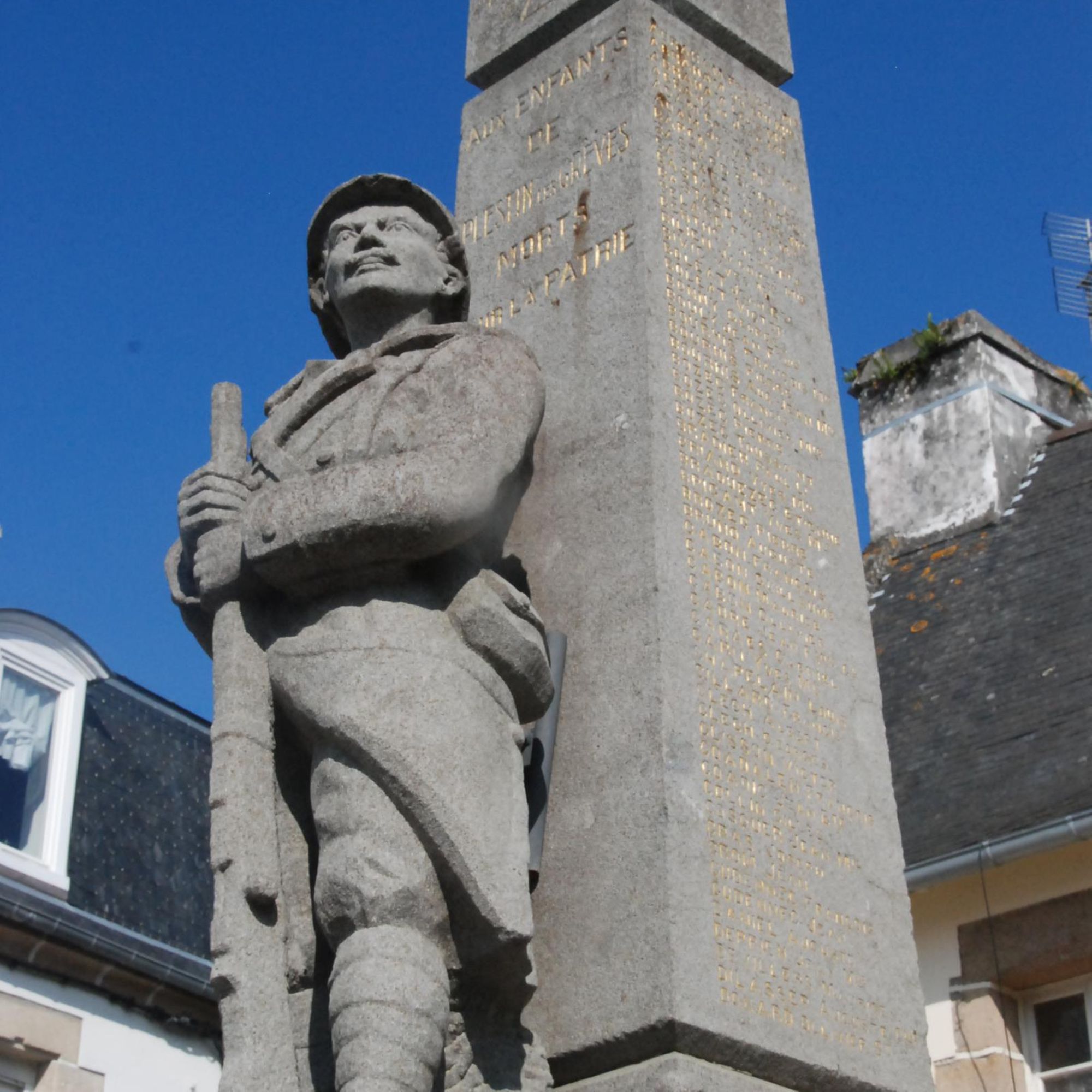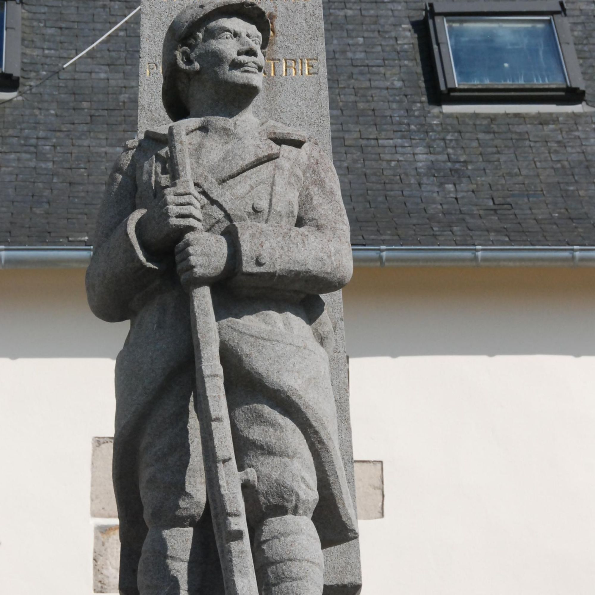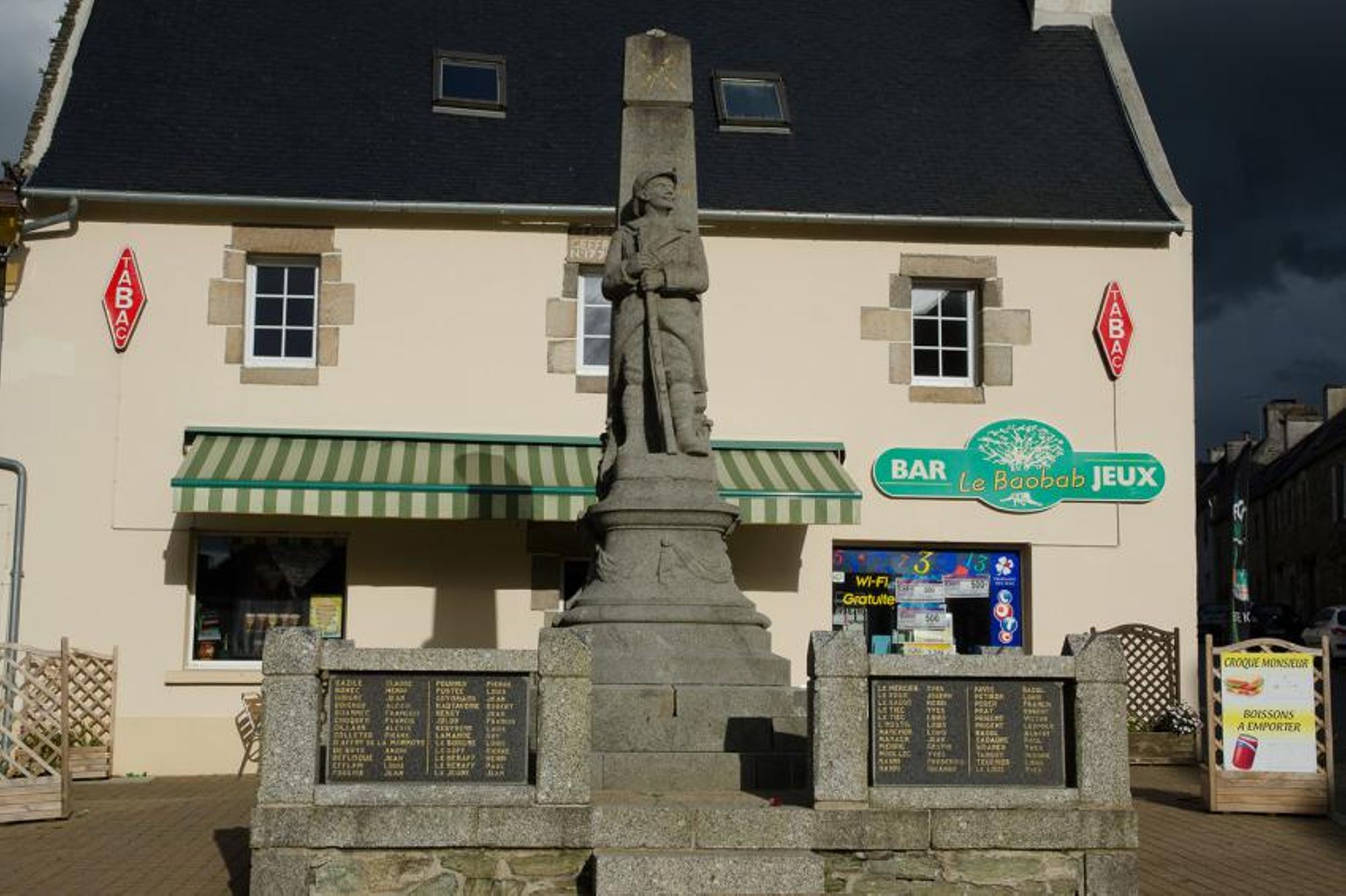 Le monument aux morts est taillé dans de la kersantite. Il a été érigé au milieu d'une plateforme en granite délimité par des piliers reliés par des chaînes (granite bleu provenant de Bégard).