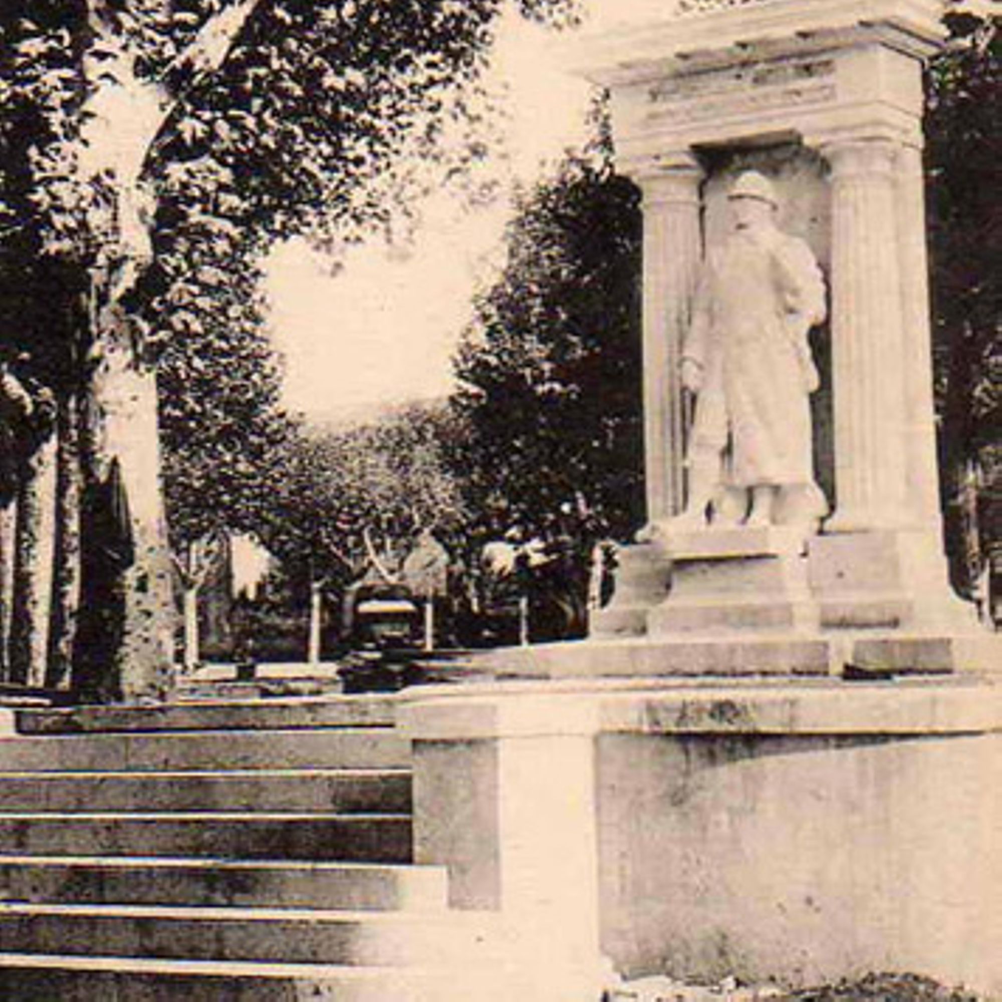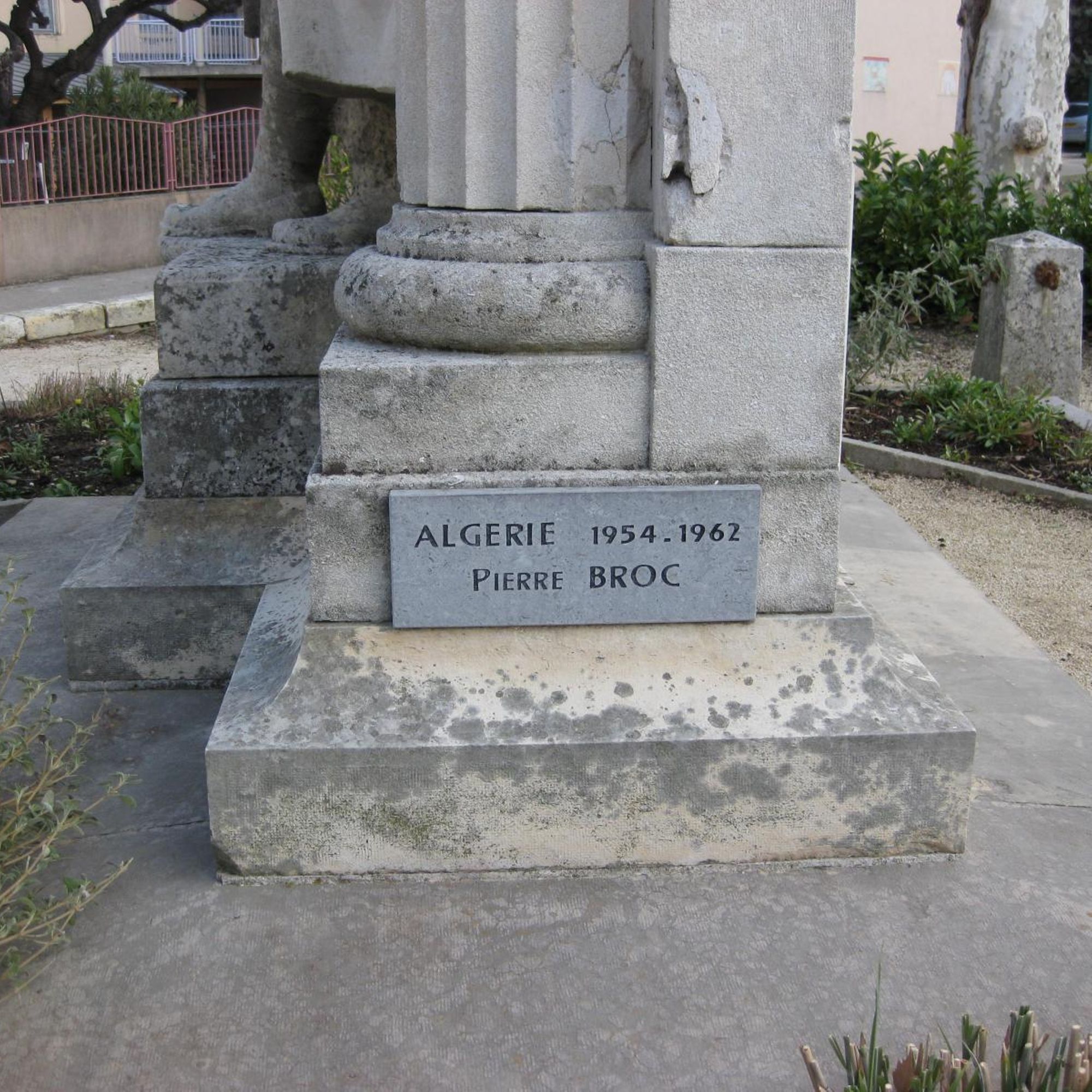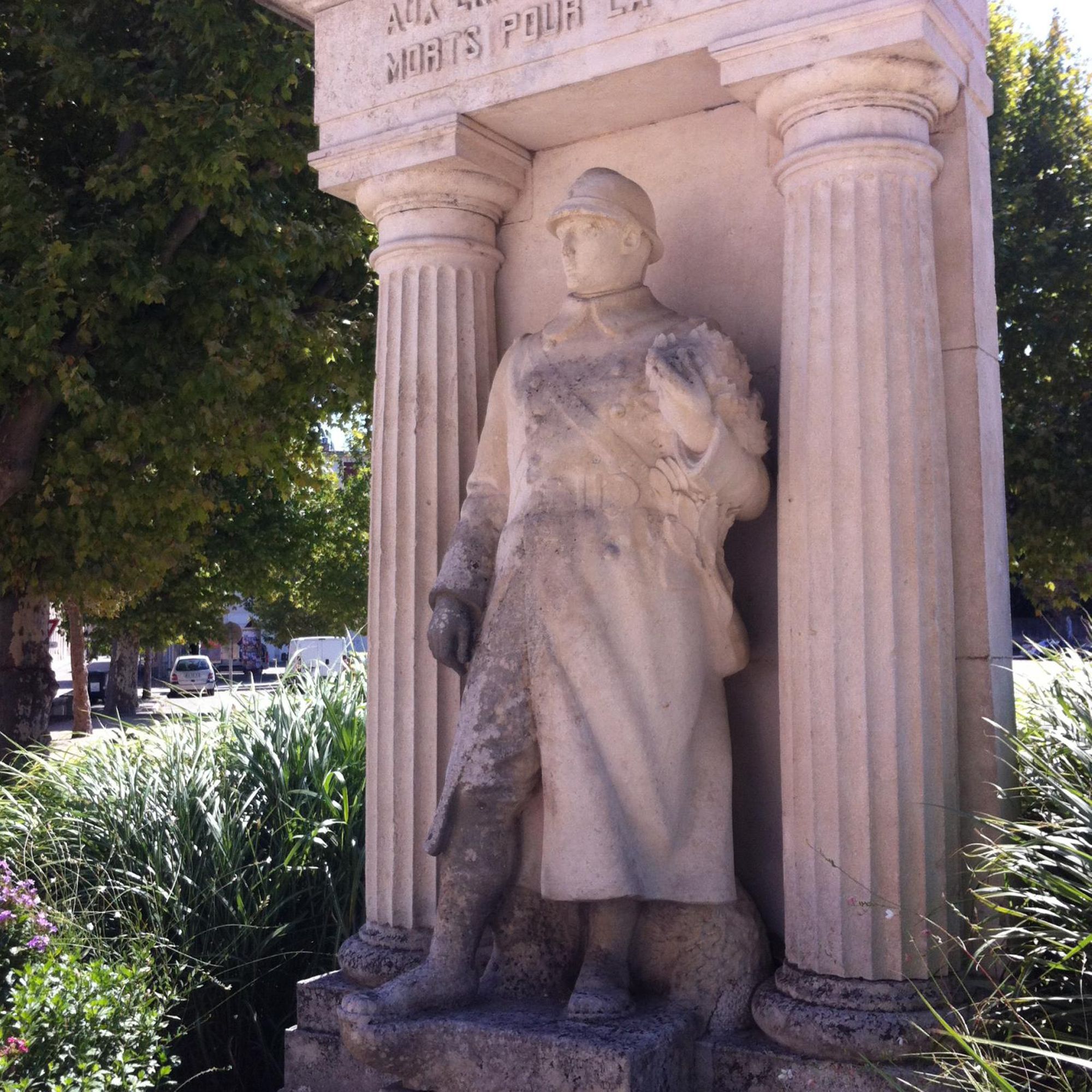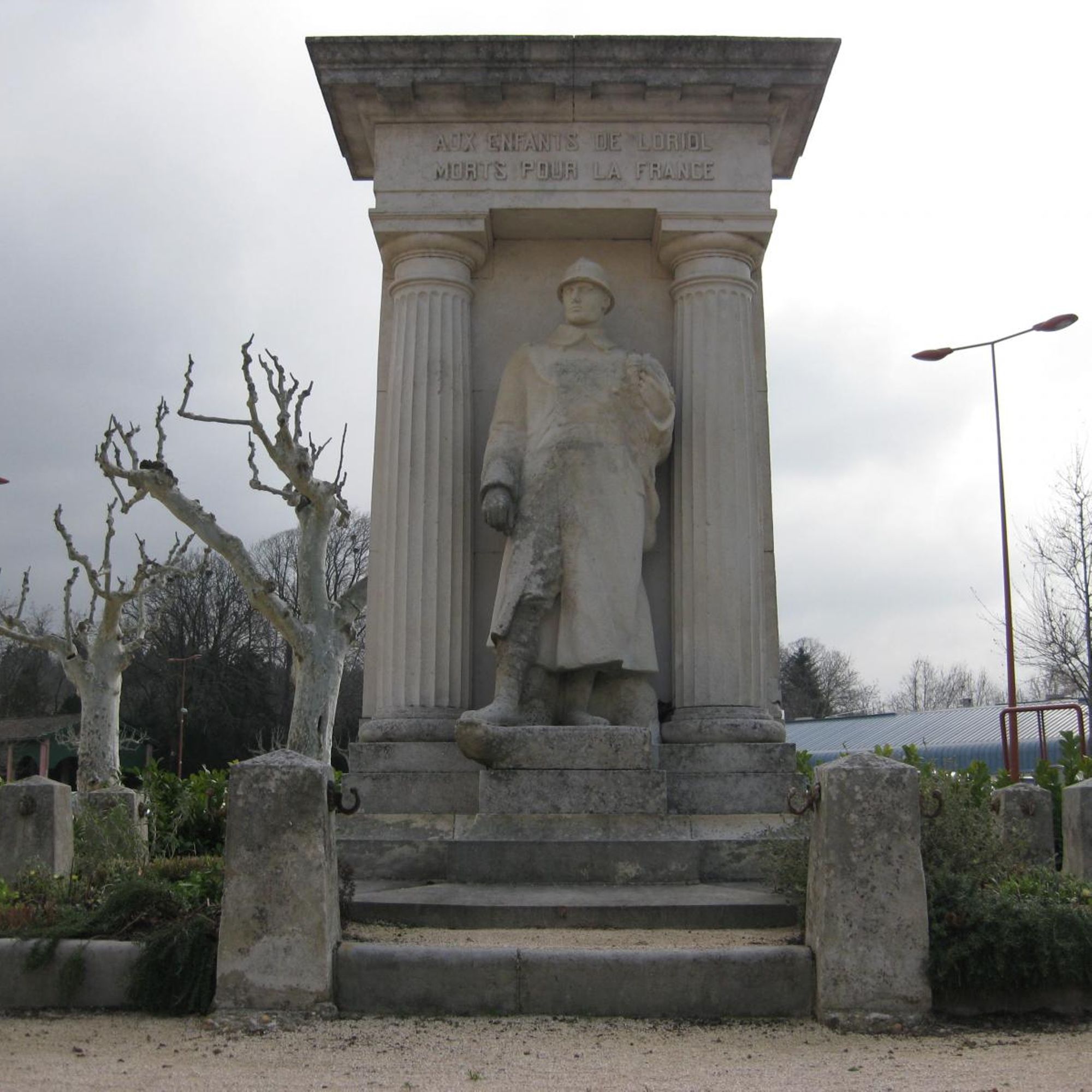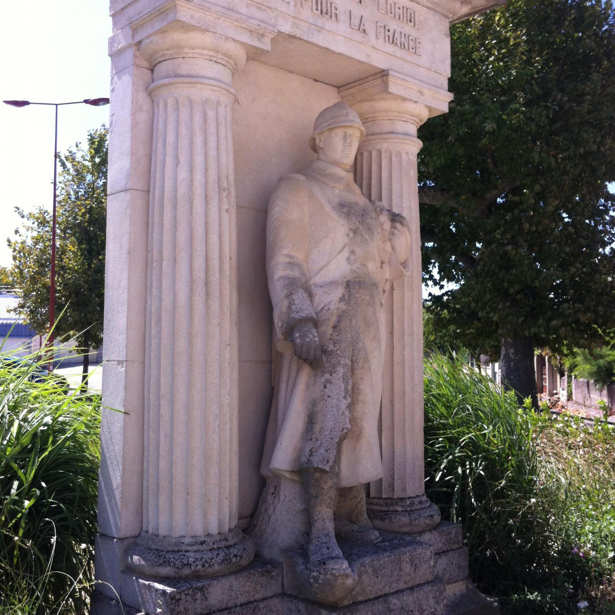- Monument à colonnes avec un poilu debout tenant une couronne de laurier à son bras gauche.