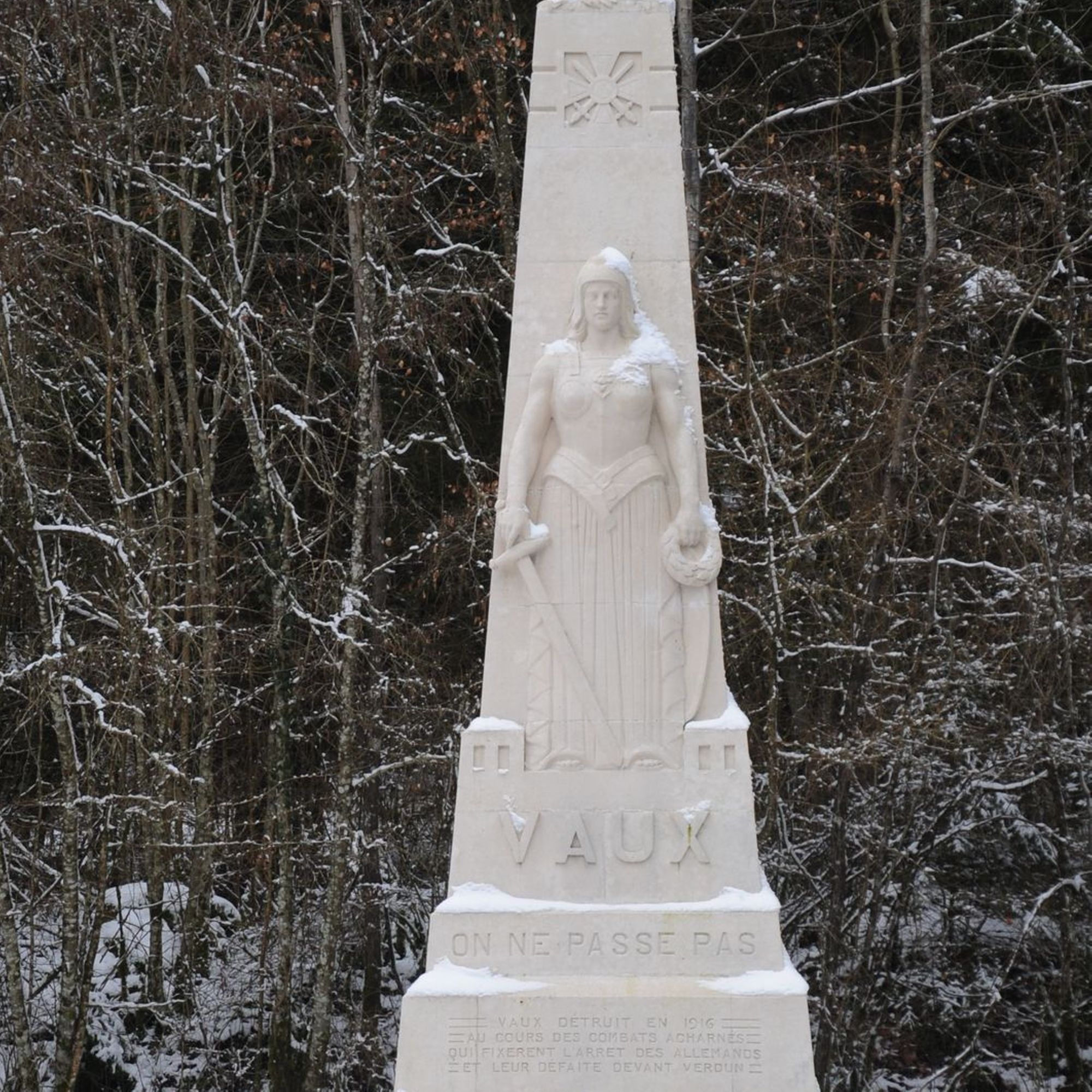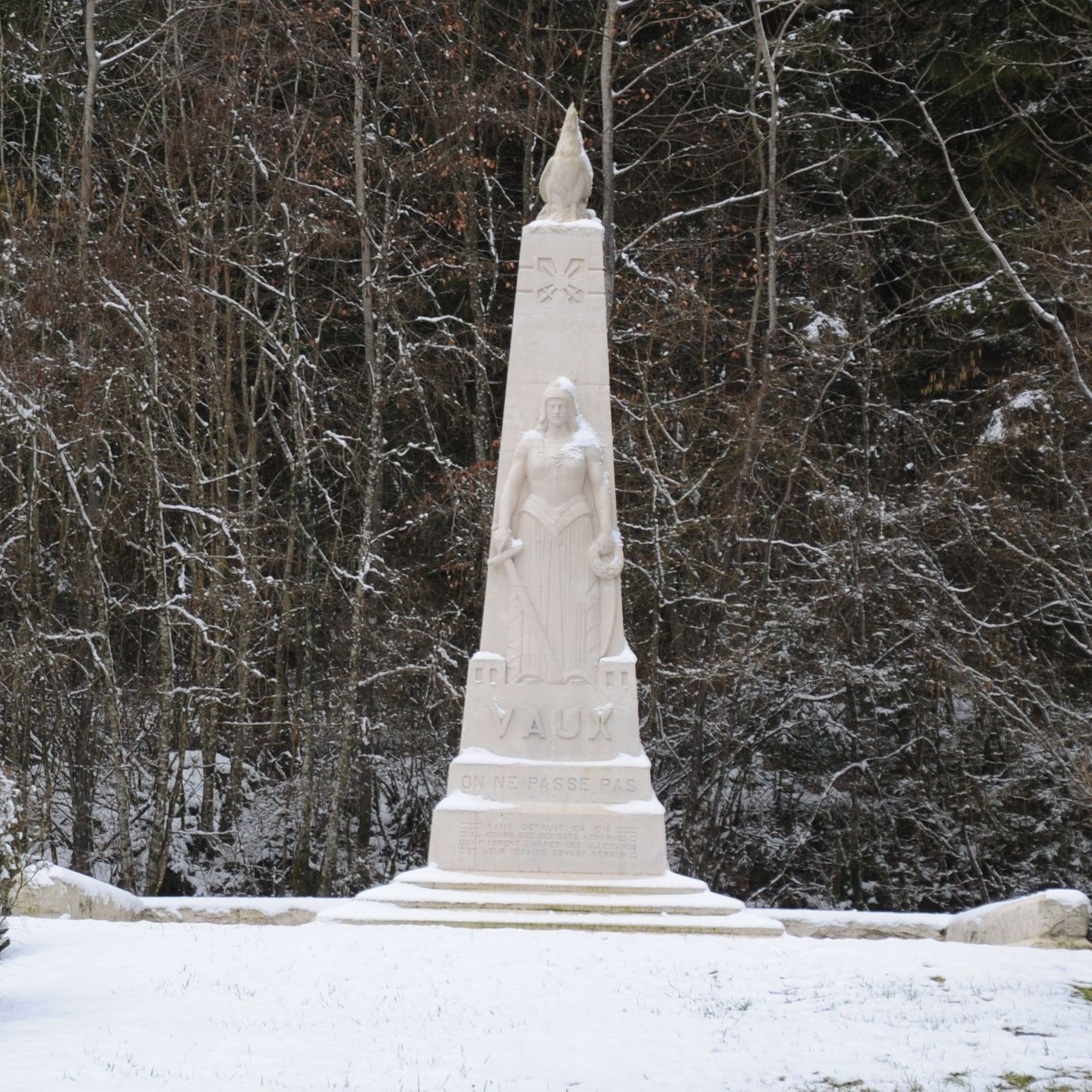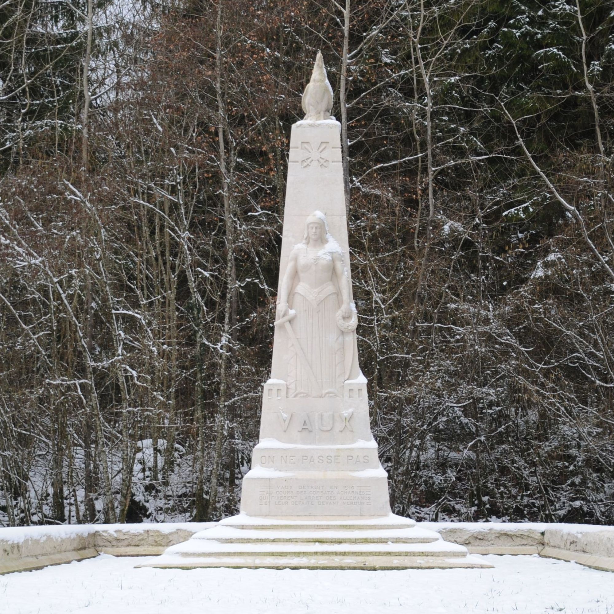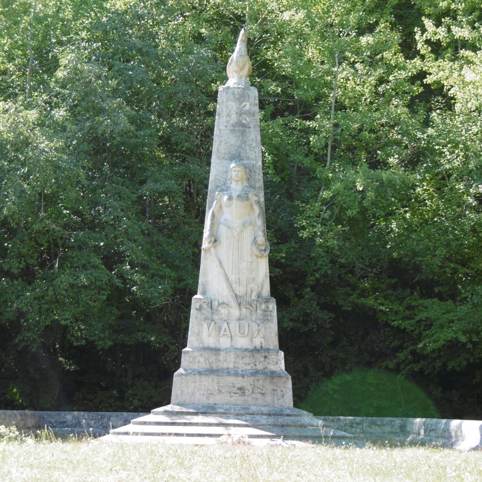 - Le monument commémore la mémoire des morts et la destruction du village de Vaux en 1916. Il est situé à l'emplacement de celui-ci, à proximité du nouveau Vaux-devant-Damloup, construit à la fin de la Première Guerre mondiale.