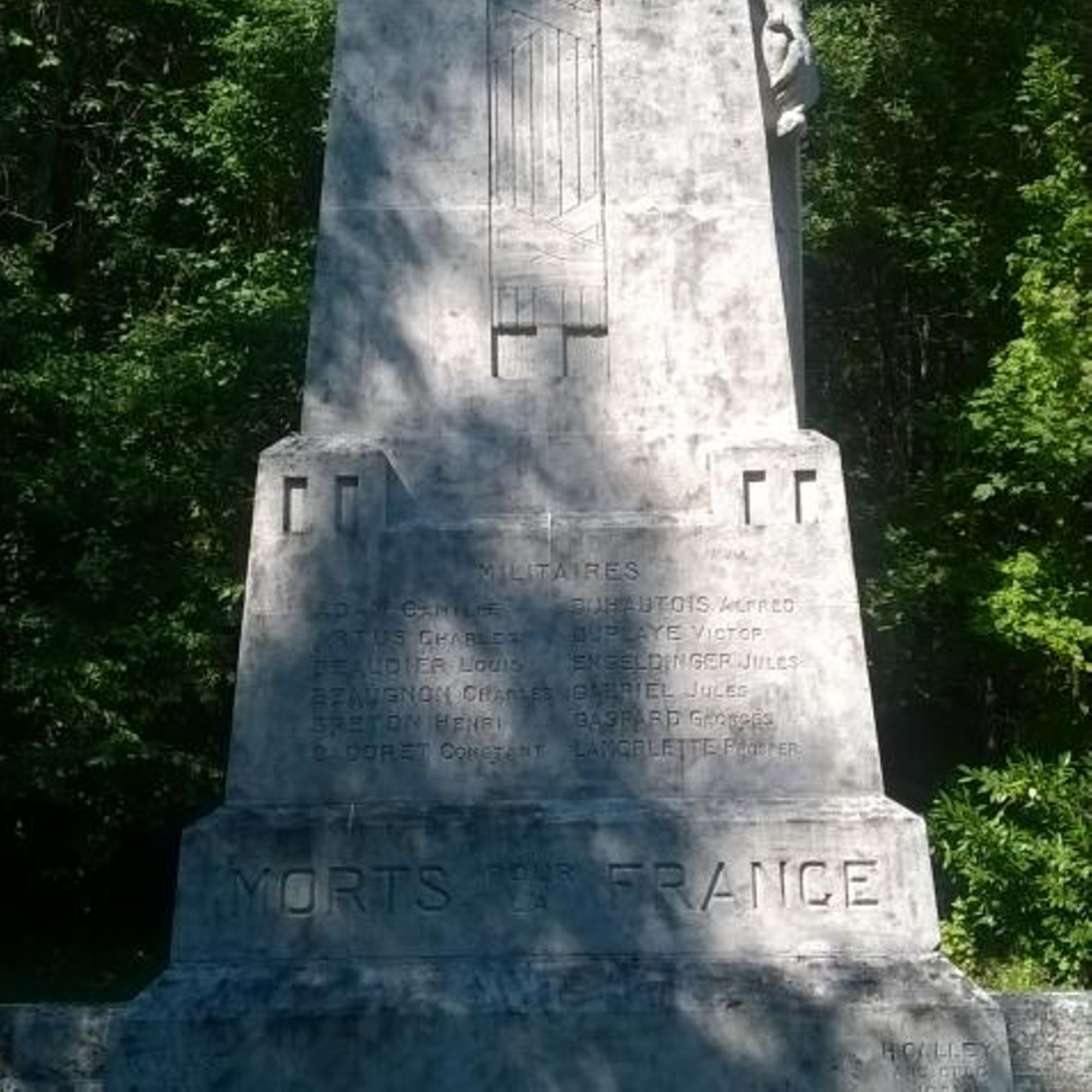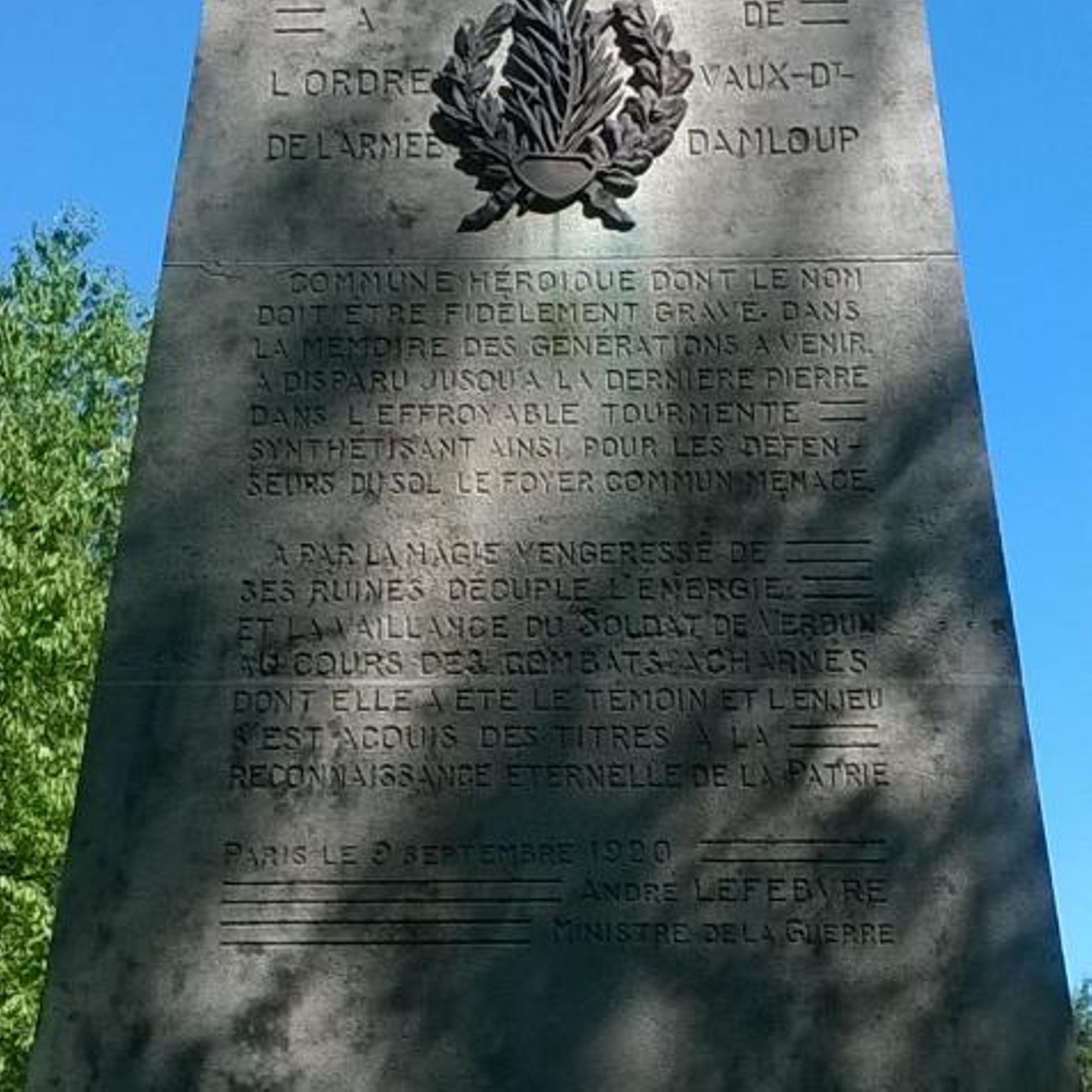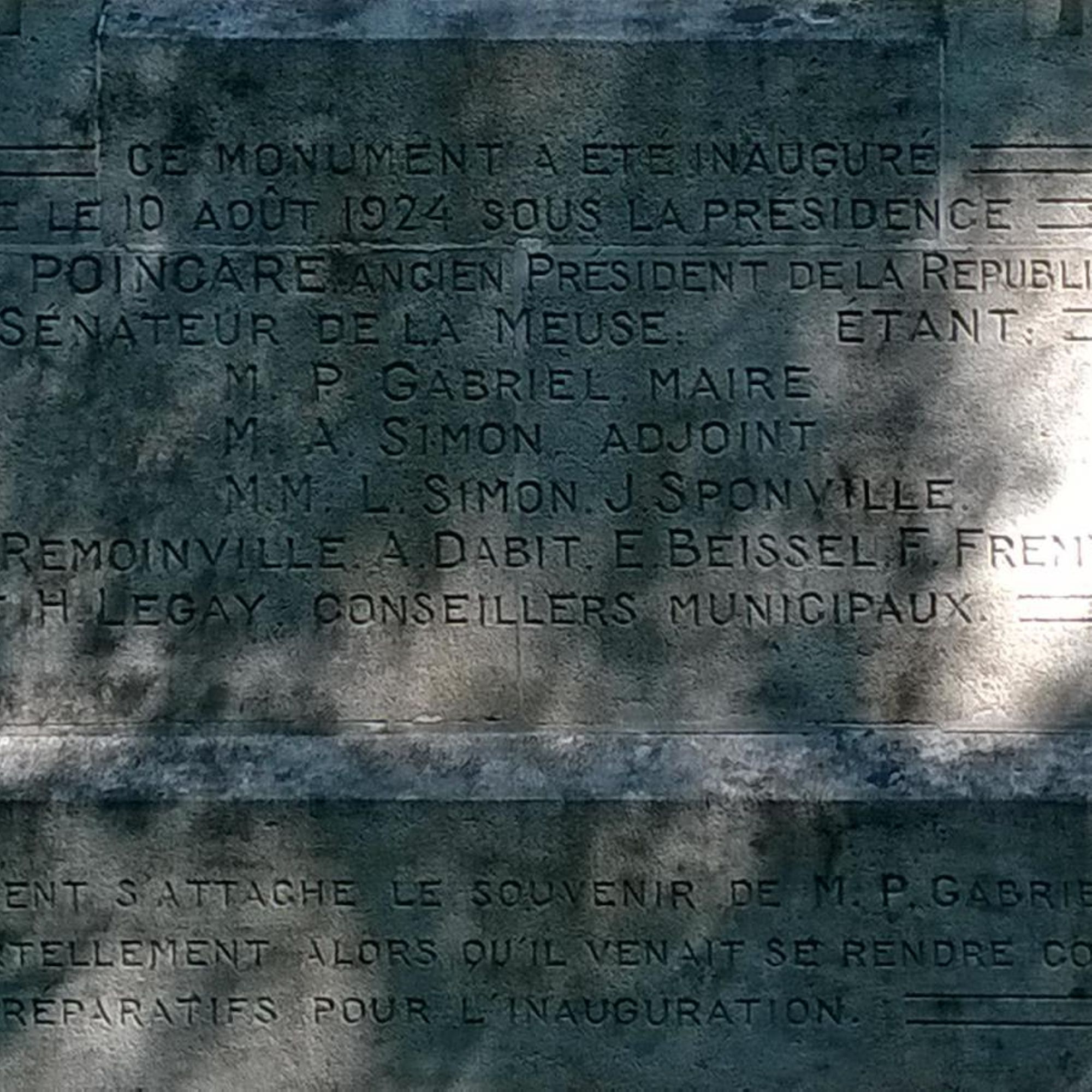 Ce monument a été inauguré le 10 août 1924 sous la présidence de M. POINCARE, ancien président de la République, sénateur de la Meuse. Etant : M. P. GABRIEL, maire, M. A. SIMON, adjoint, MM. L. SIMON, J. SPONVILLE, A. REMOINVILLE, A. DABIT, E. BEISSEL, F. FREMY et H. LEGAY, conseillers municipaux. A ce monument s'attache le souvenir de P. GABRIEL, maire, blessé mortellement alors qu'il venait se rendre compte des derniers préparatifs pour l'inauguration