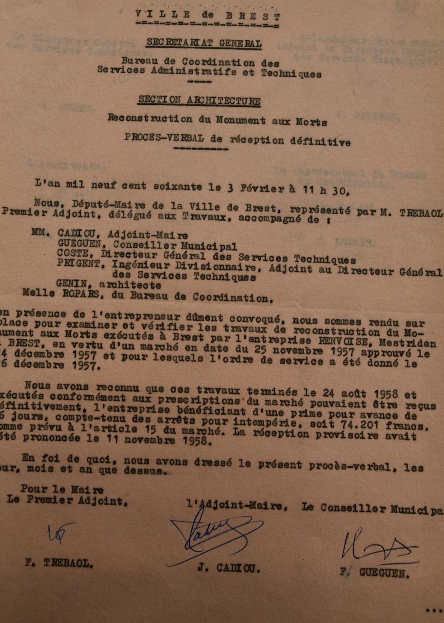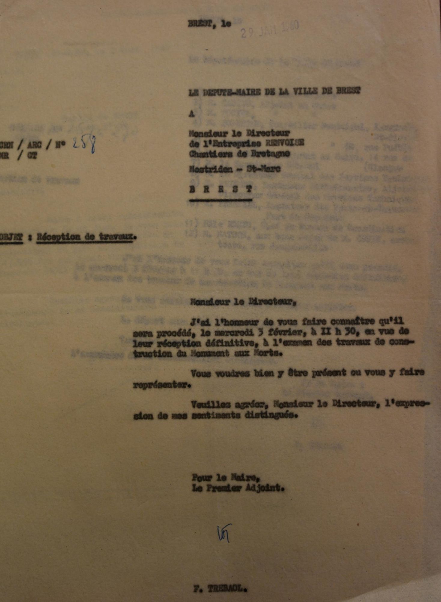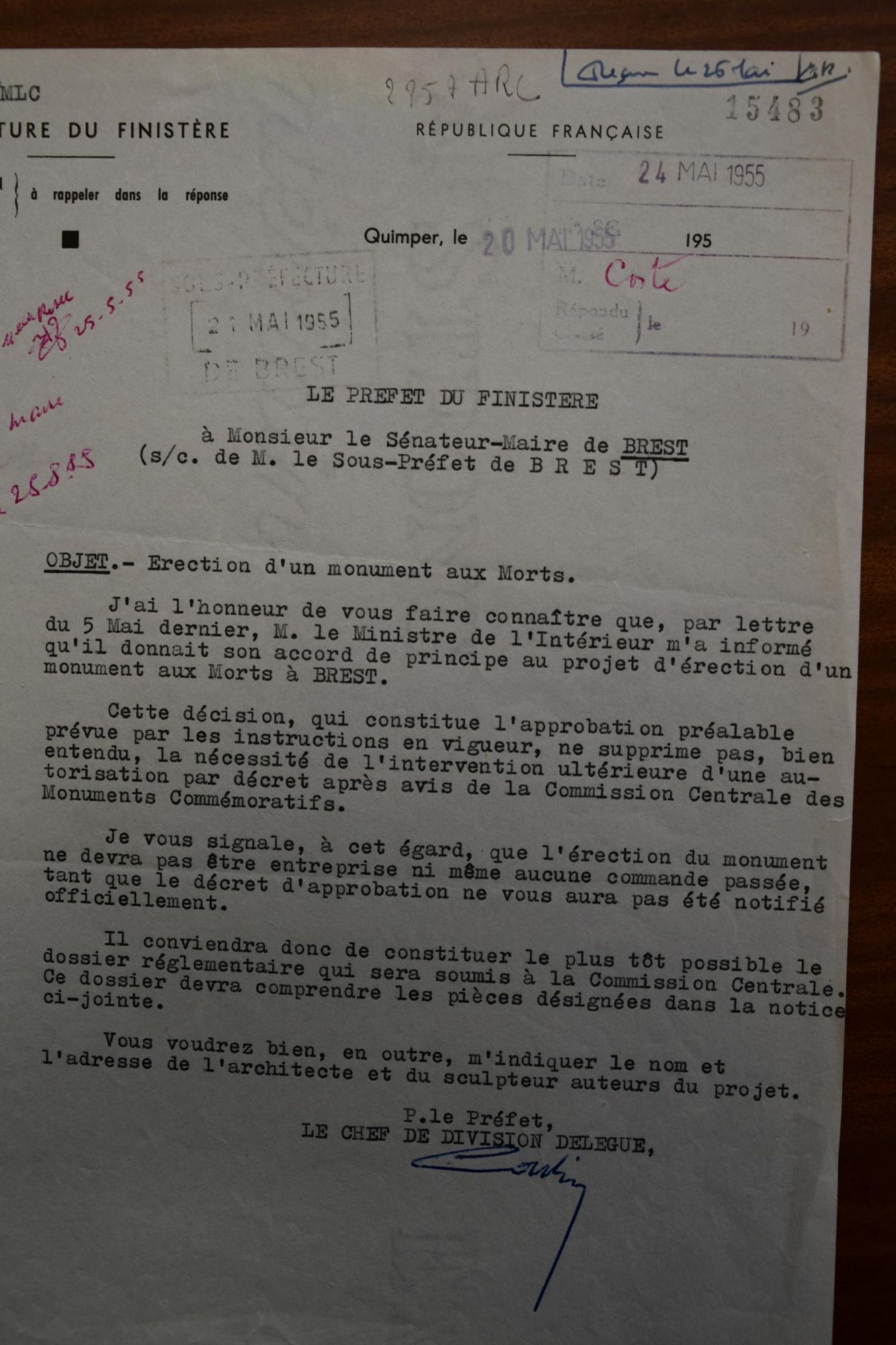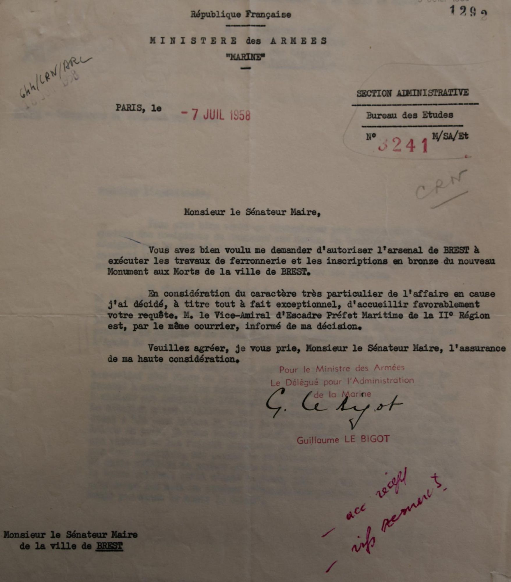 Autorisation du ministère des armées pour que l'arsenal exécute les travaux de ferronnerie et les inscriptions sur le monument aux morts