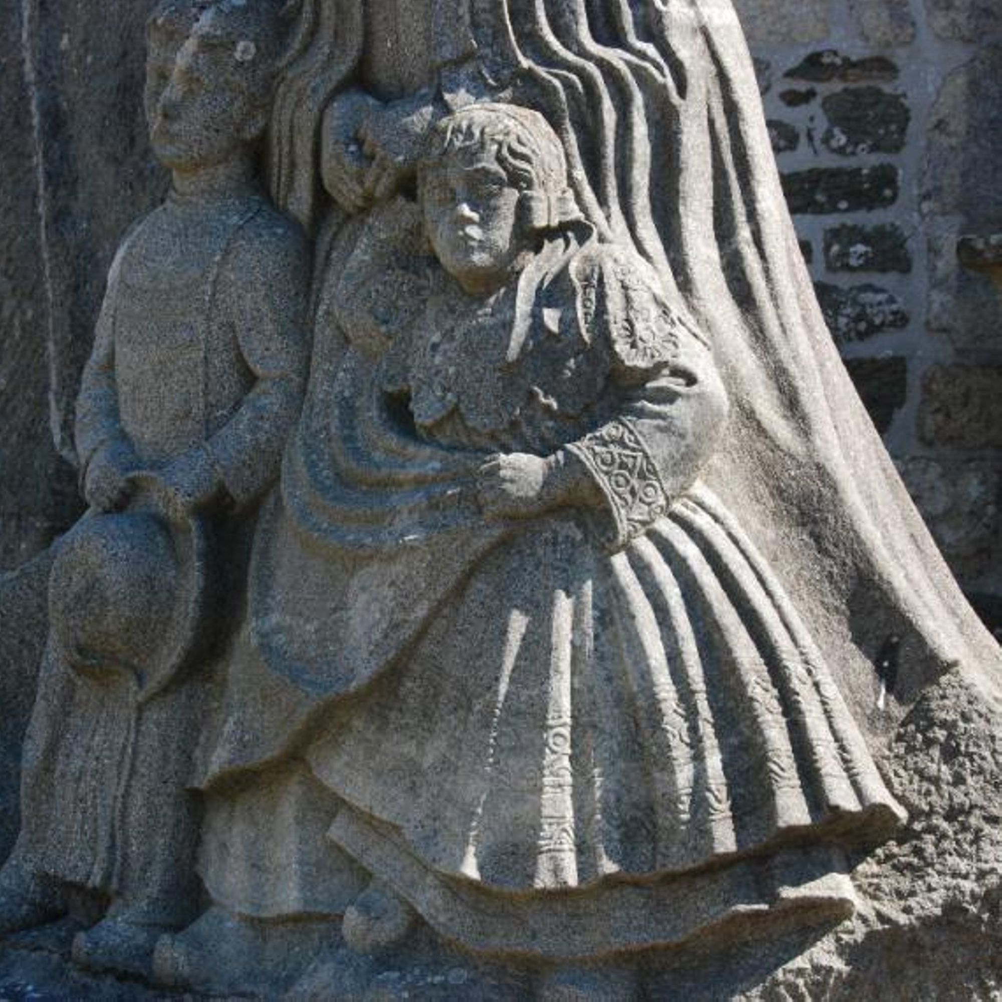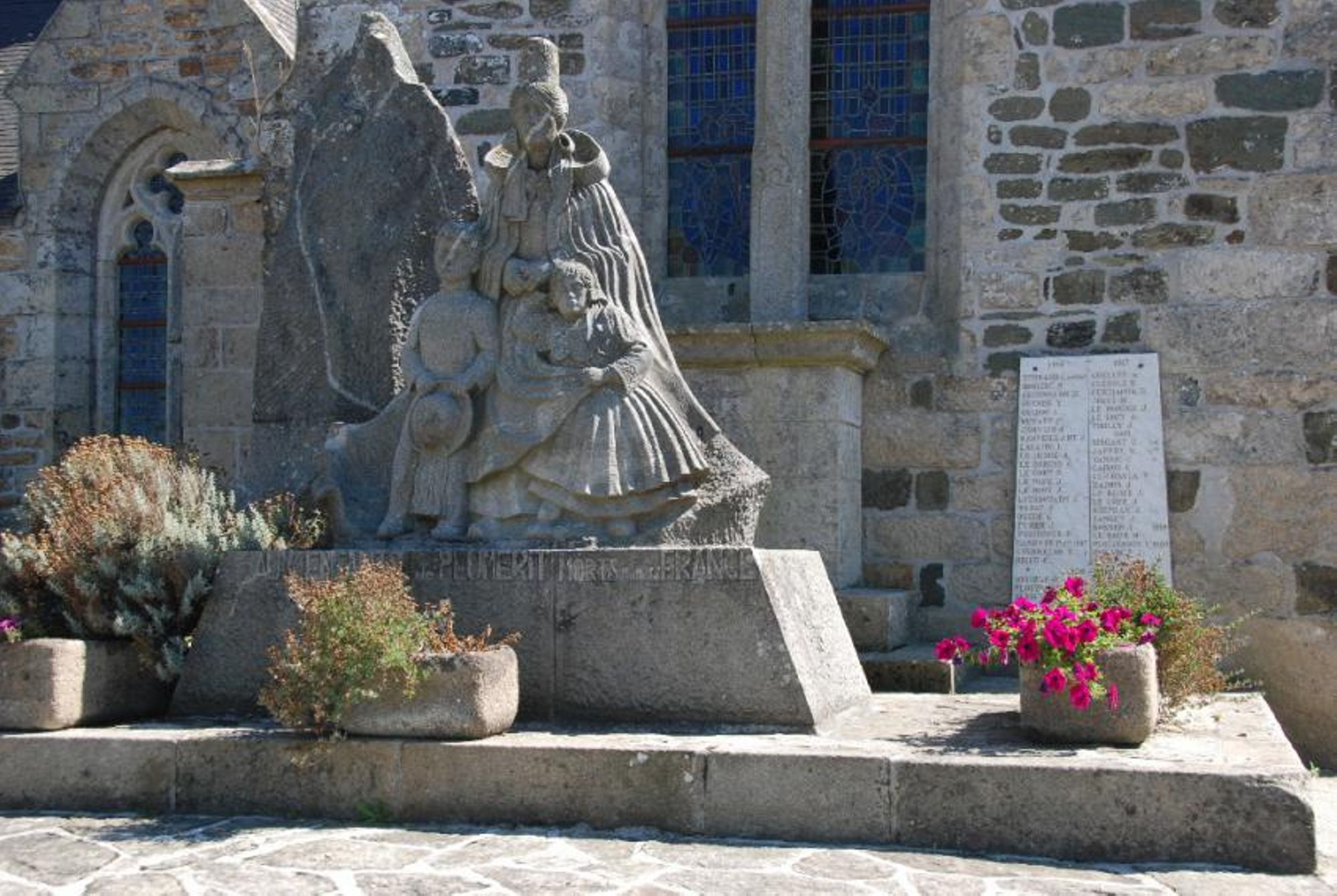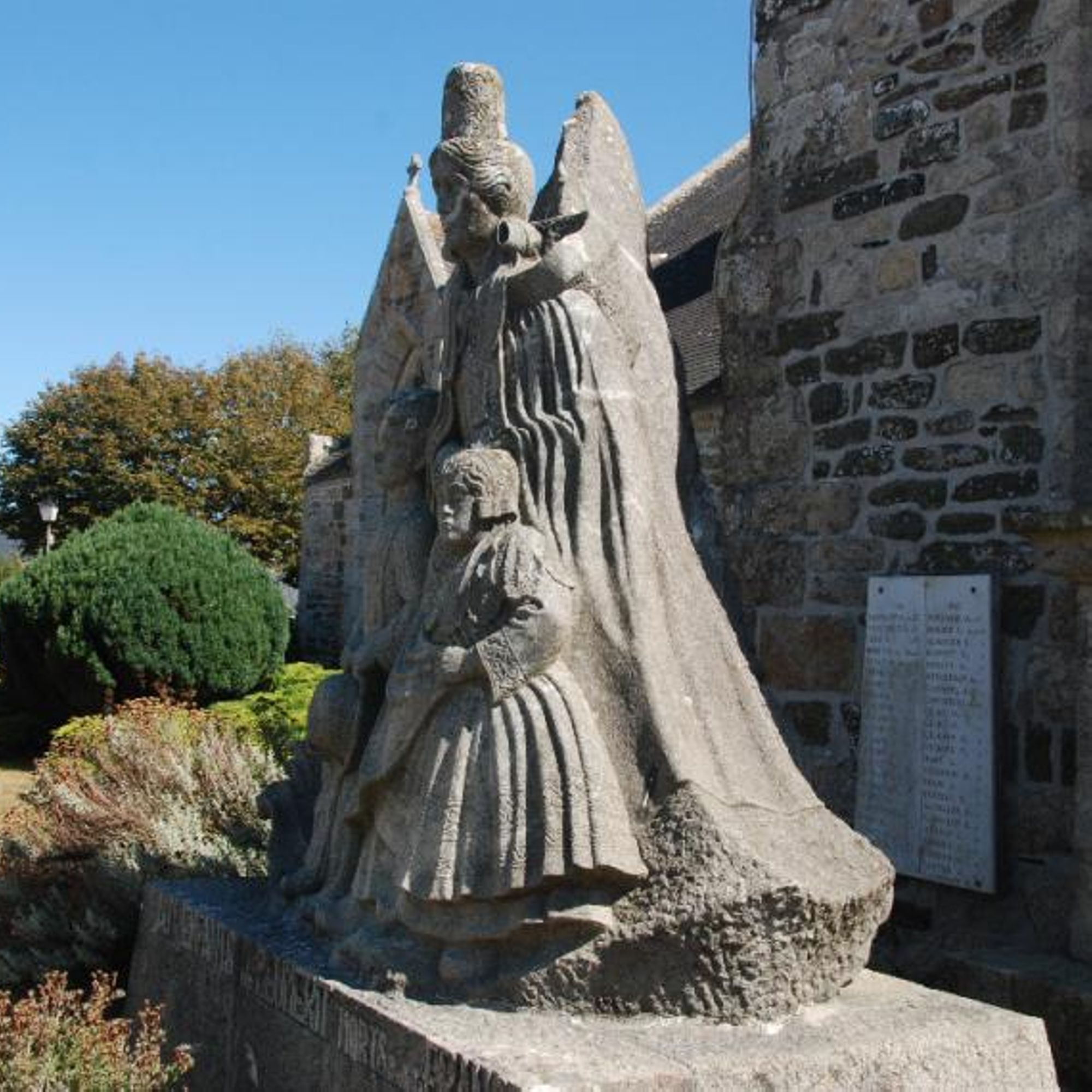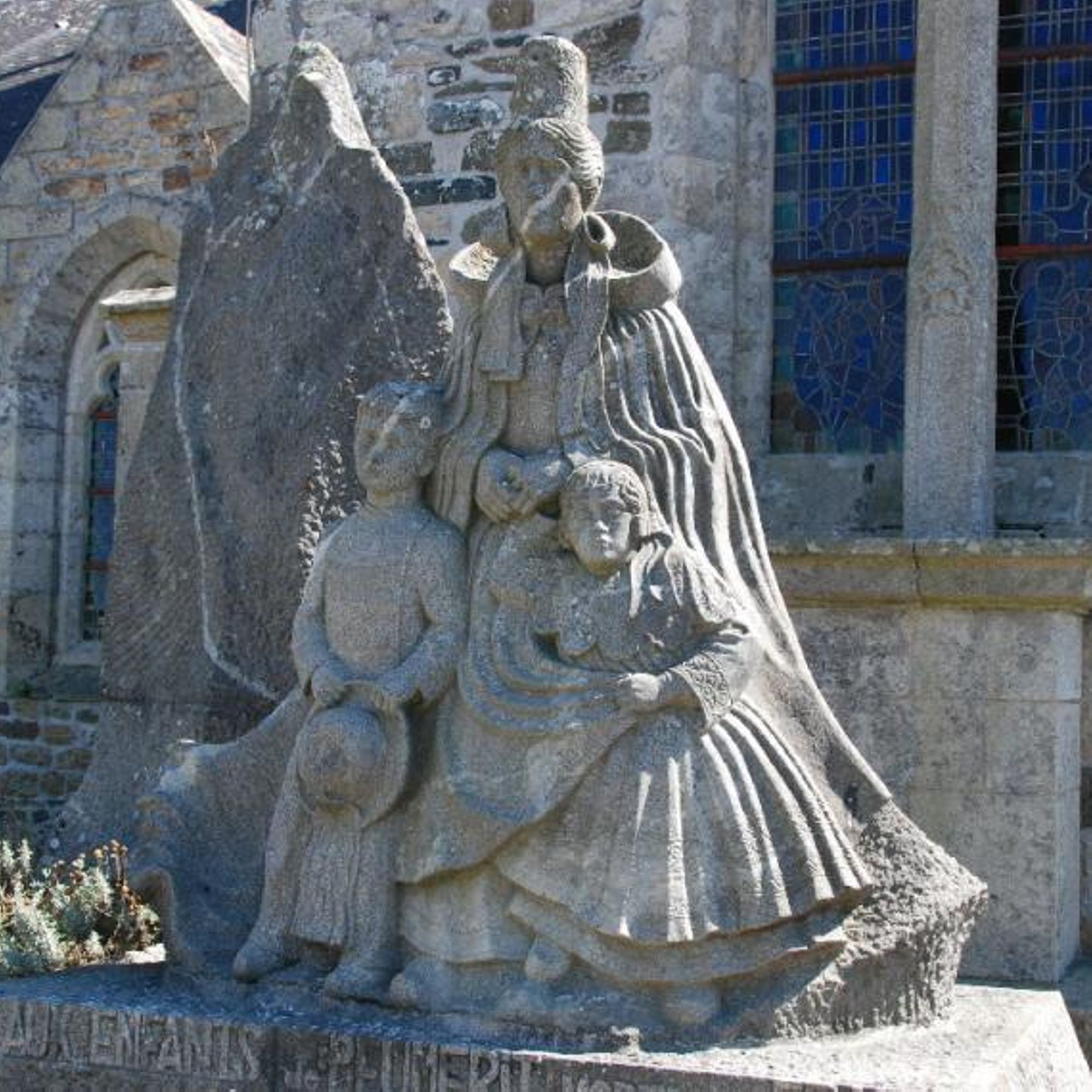 Stèle devant l'église : une bretonne et ses enfants en costume attendent le retour de leur père