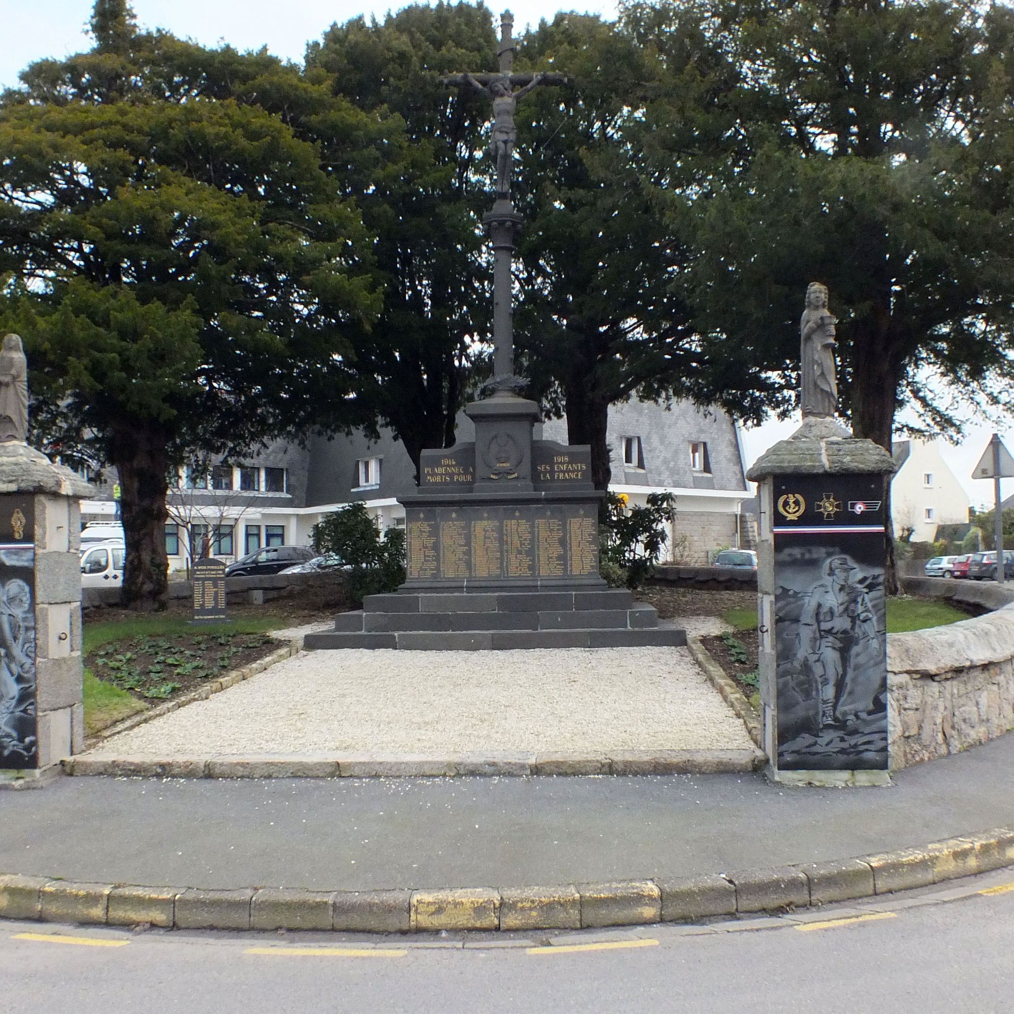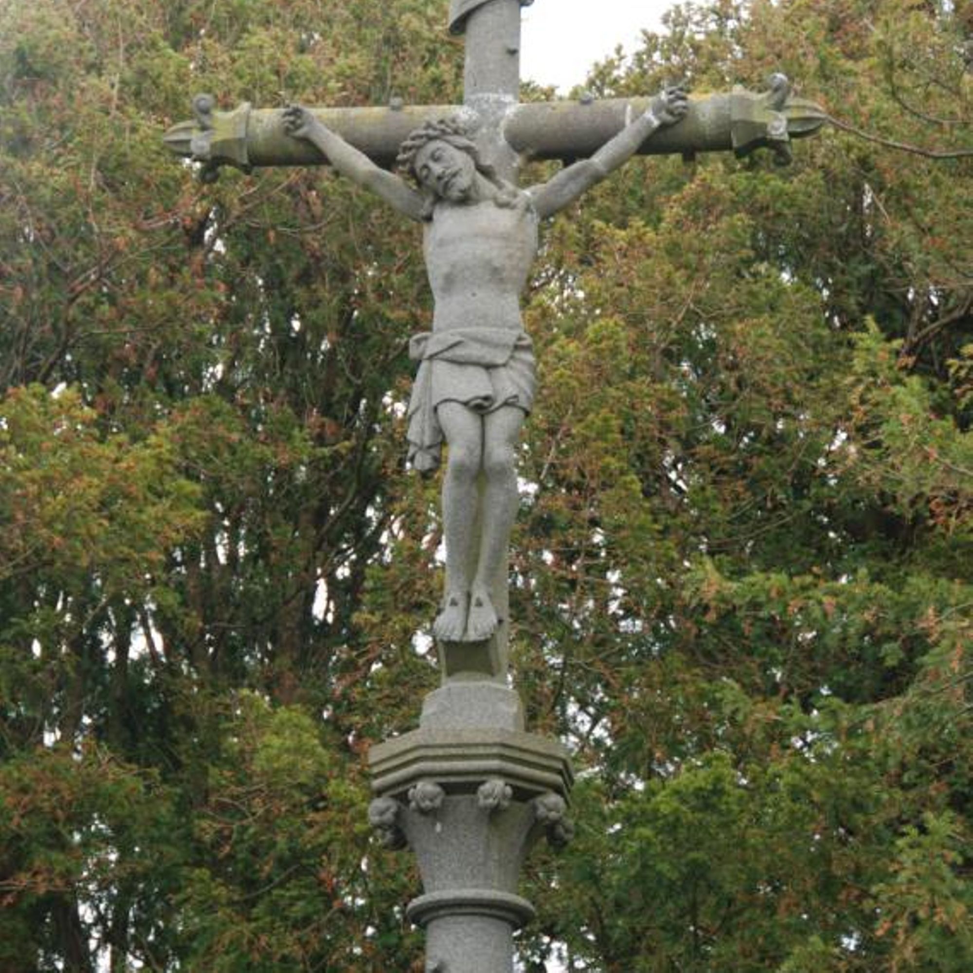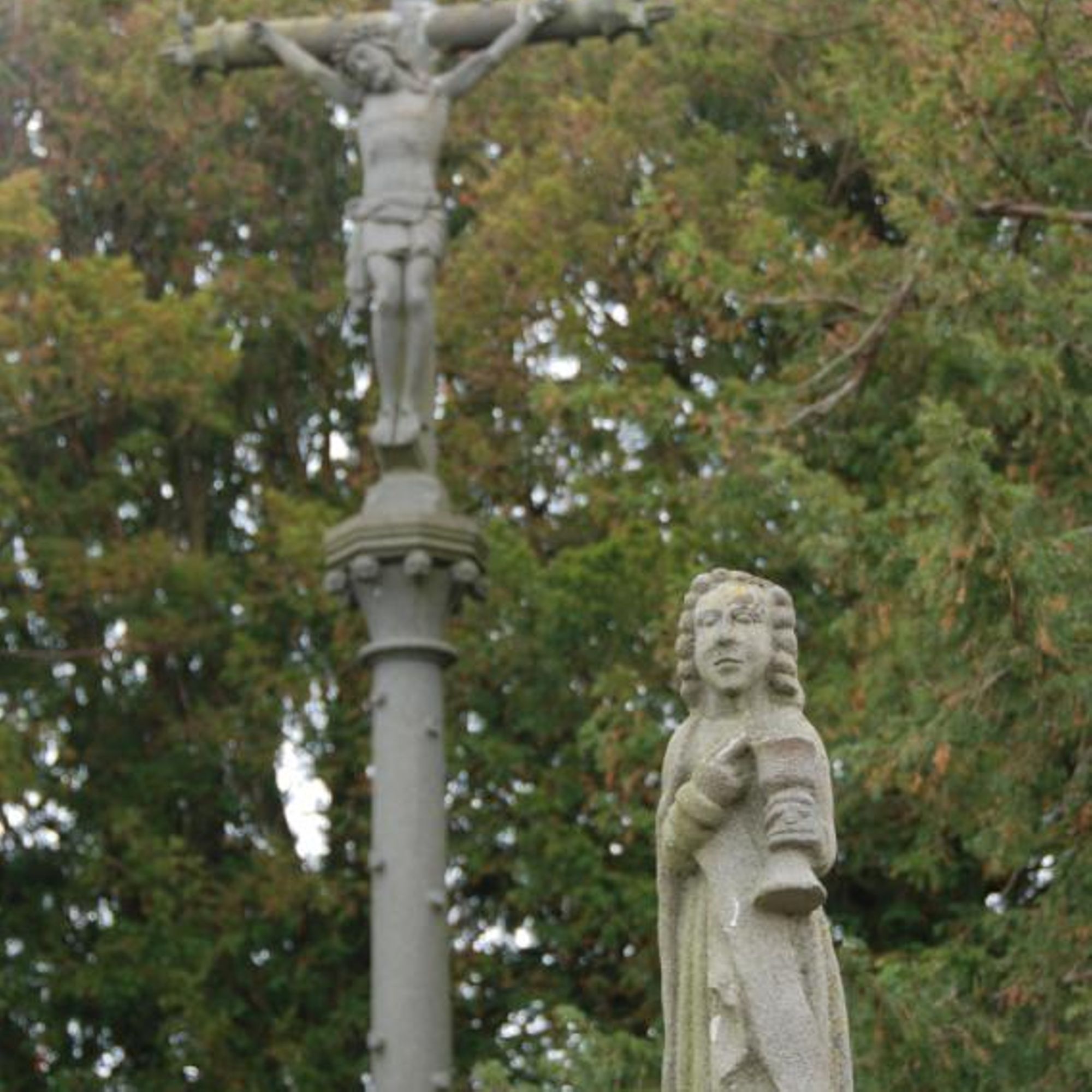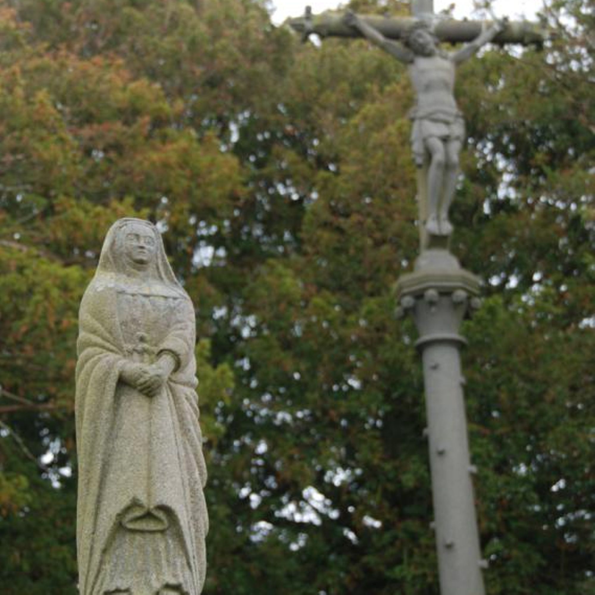 Calvaire en kersantite avec 2 statuettes à l'entrée