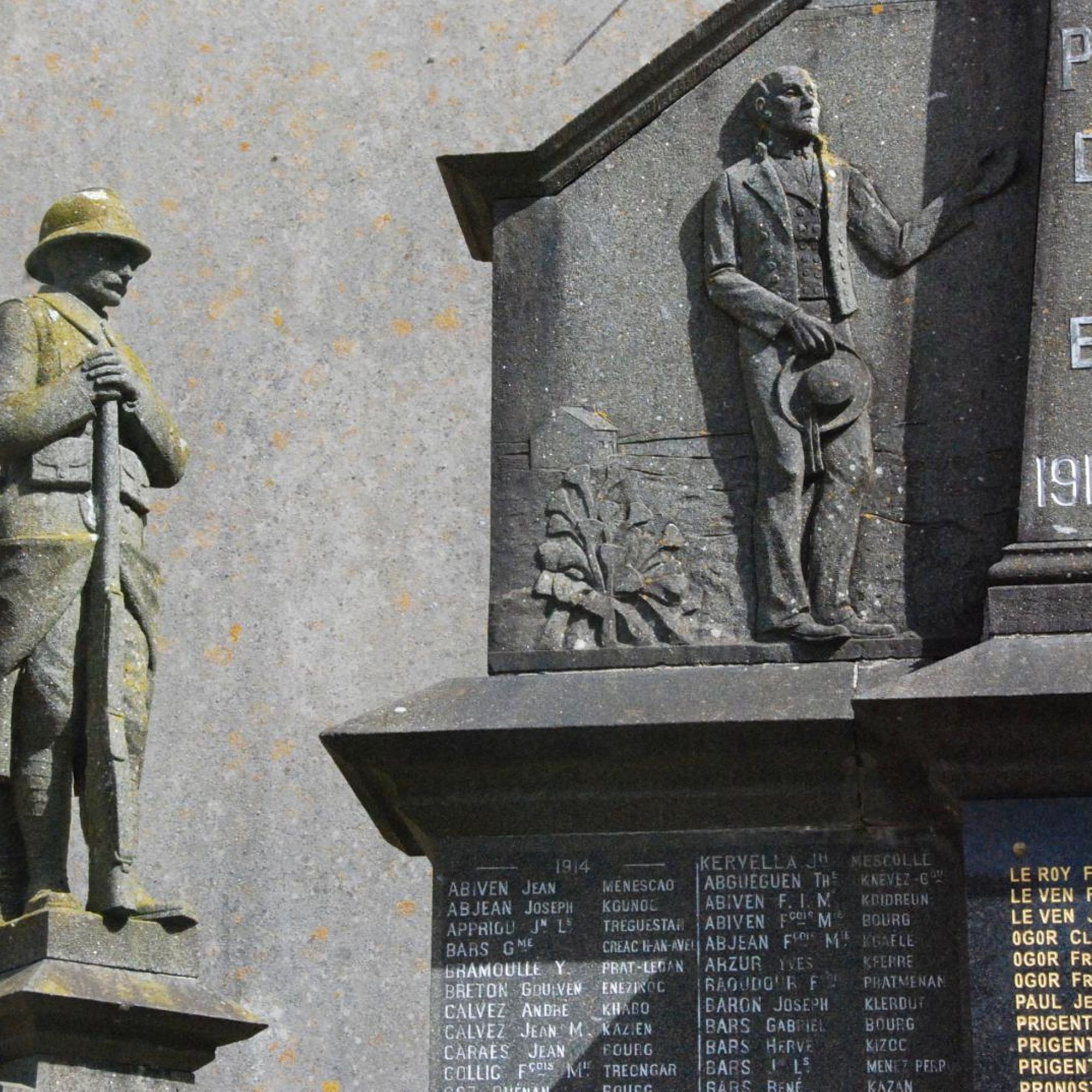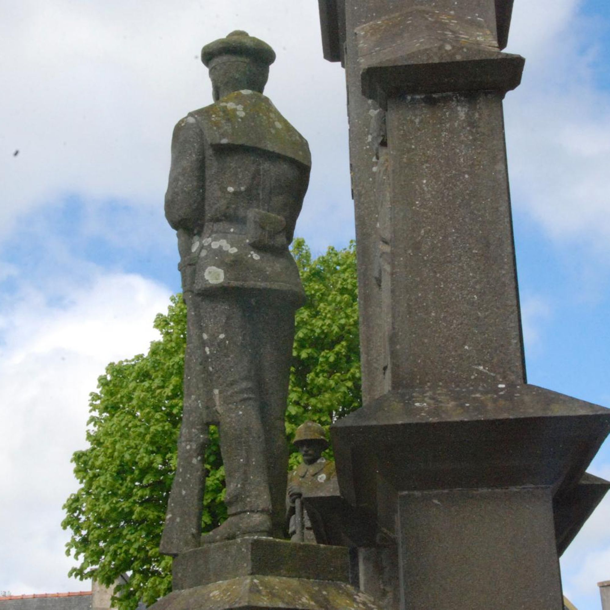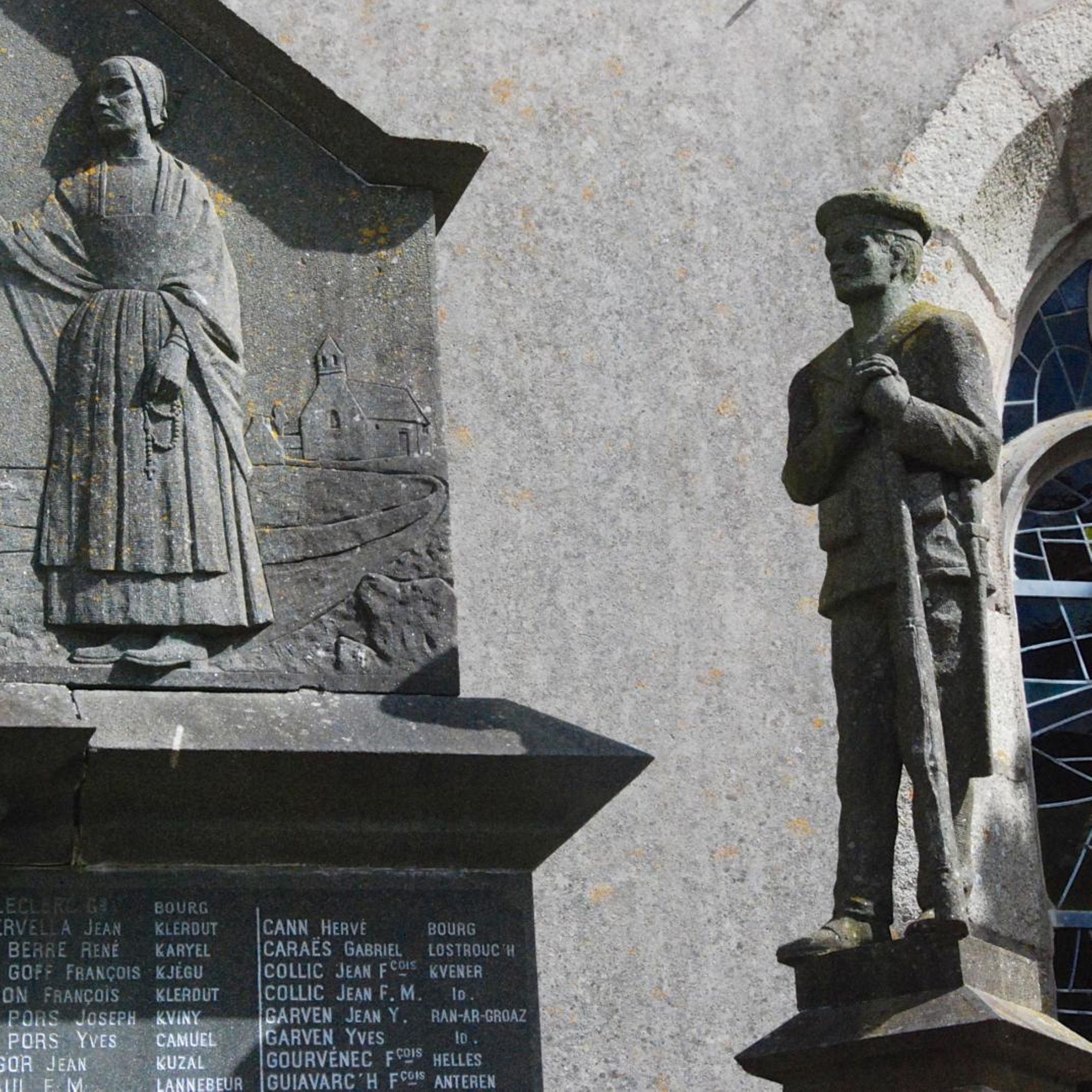 - Monument avec statues de marin et poilu, avec bas relief montrant une famille de paysans portant le deuil, le tout surmonté d'une statue de Jeanne d'Arc