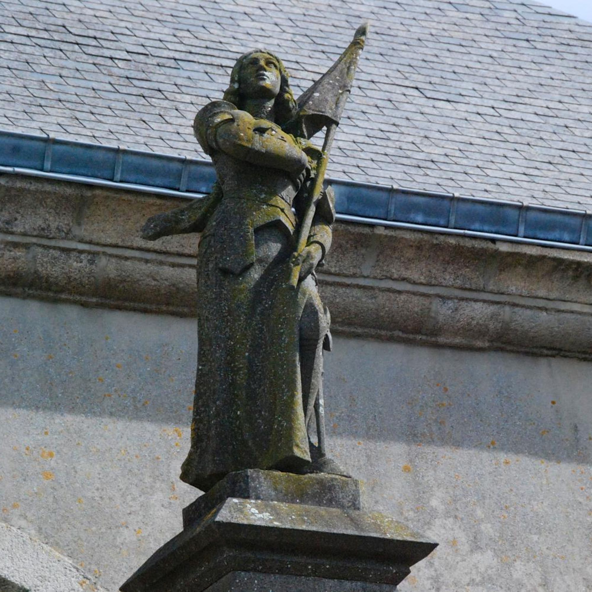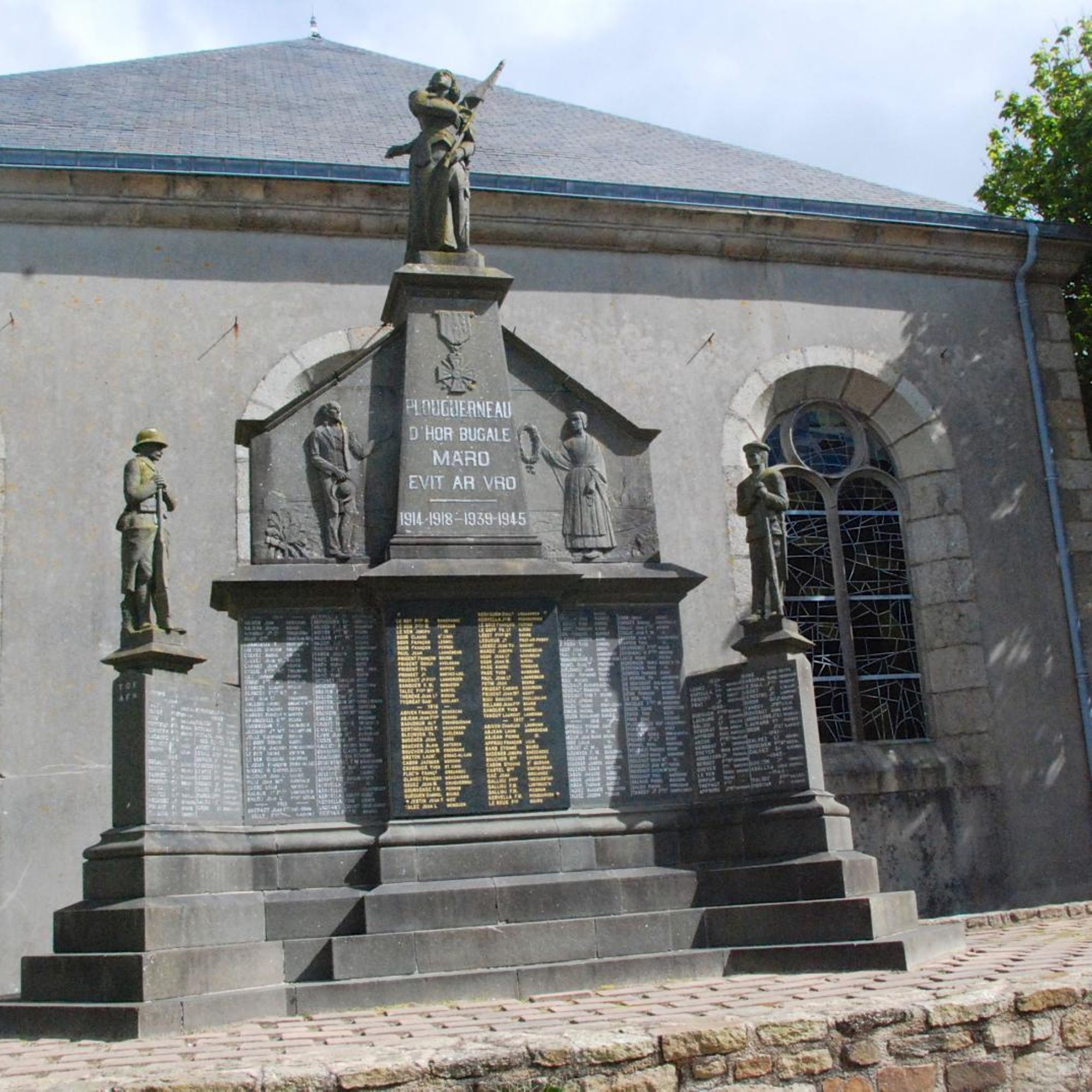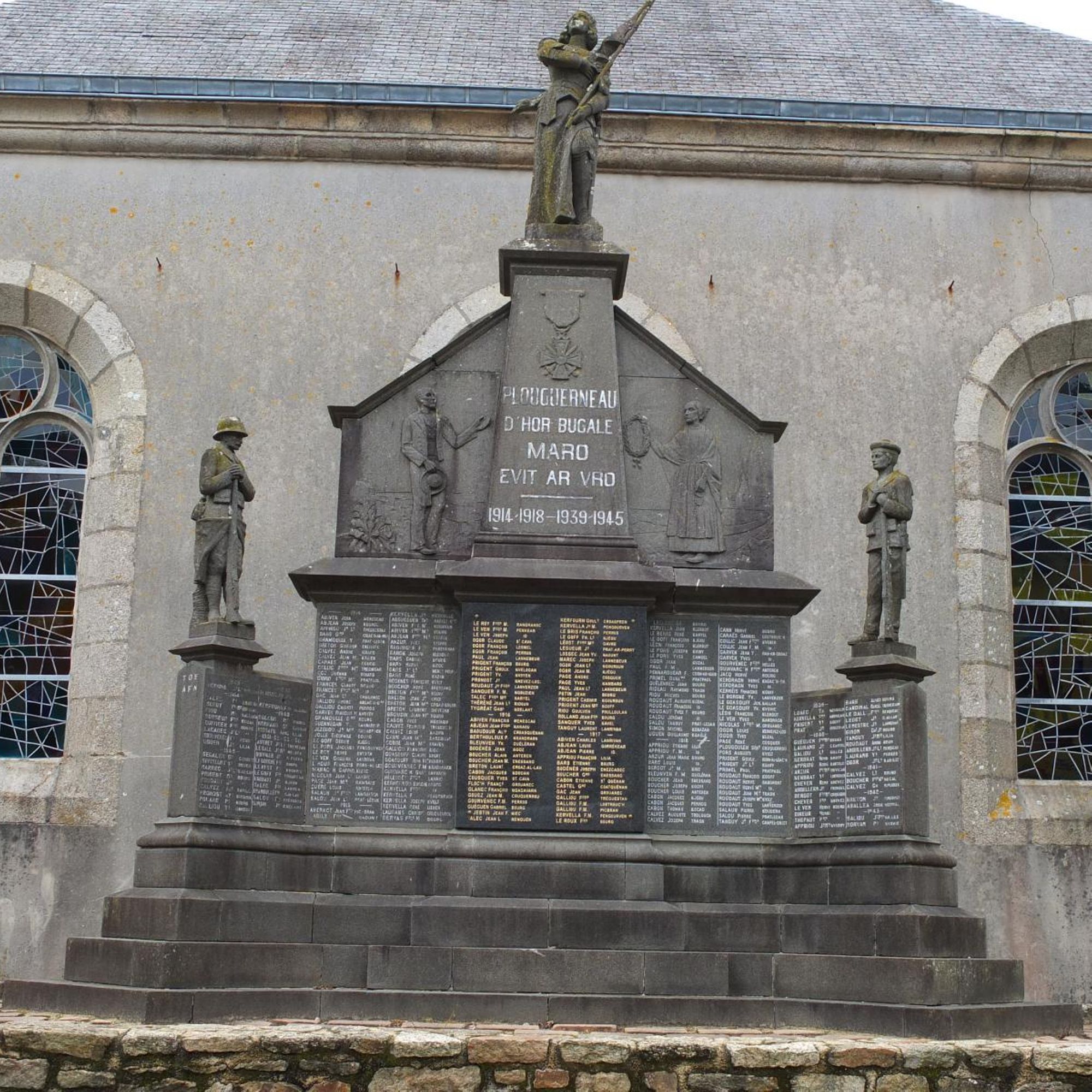 - Monument avec statues de marin et poilu, avec bas relief montrant une famille de paysans portant le deuil, le tout surmonté d'une statue de Jeanne d'Arc