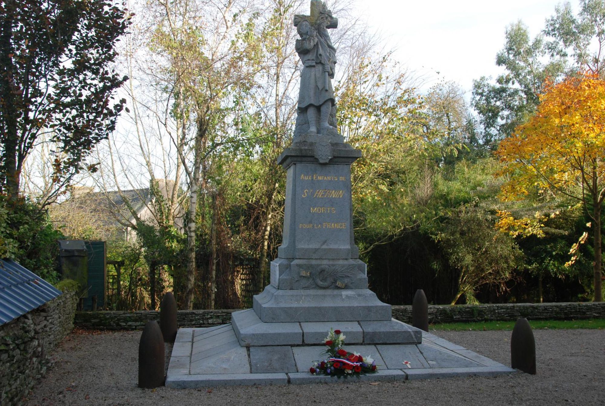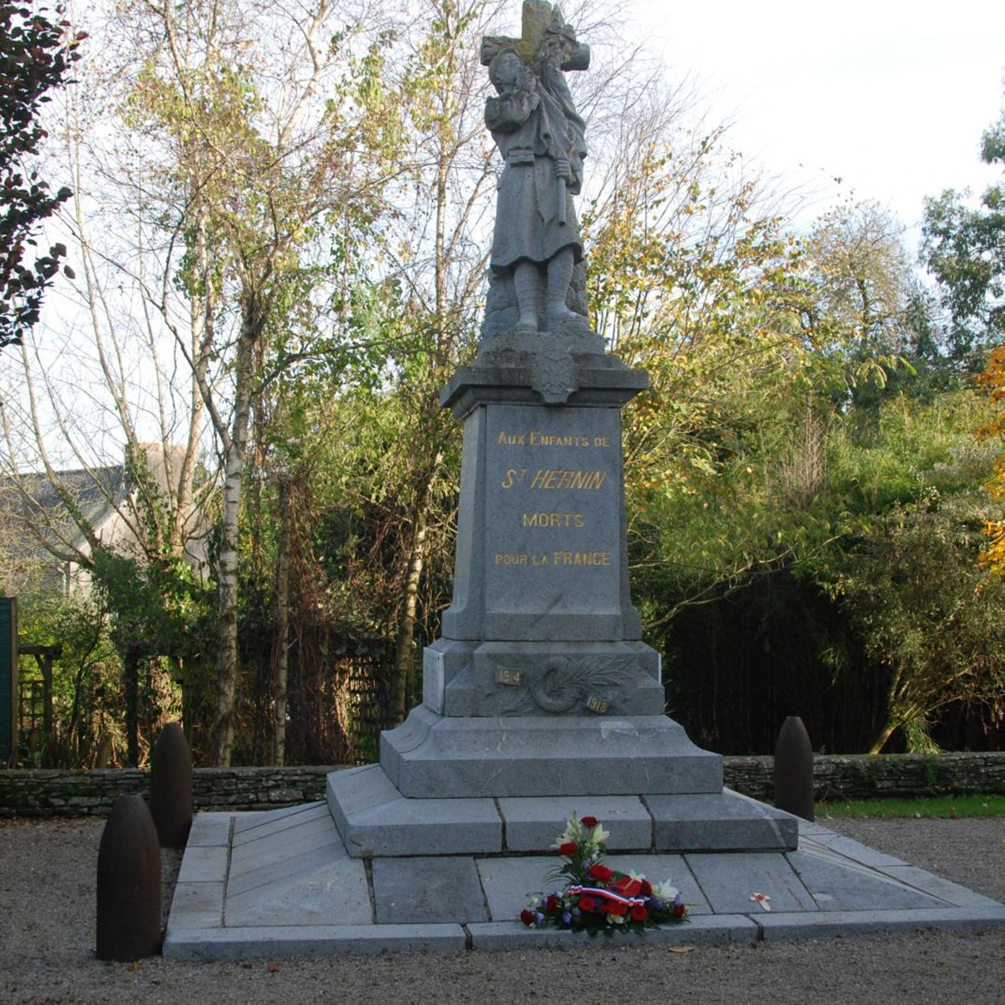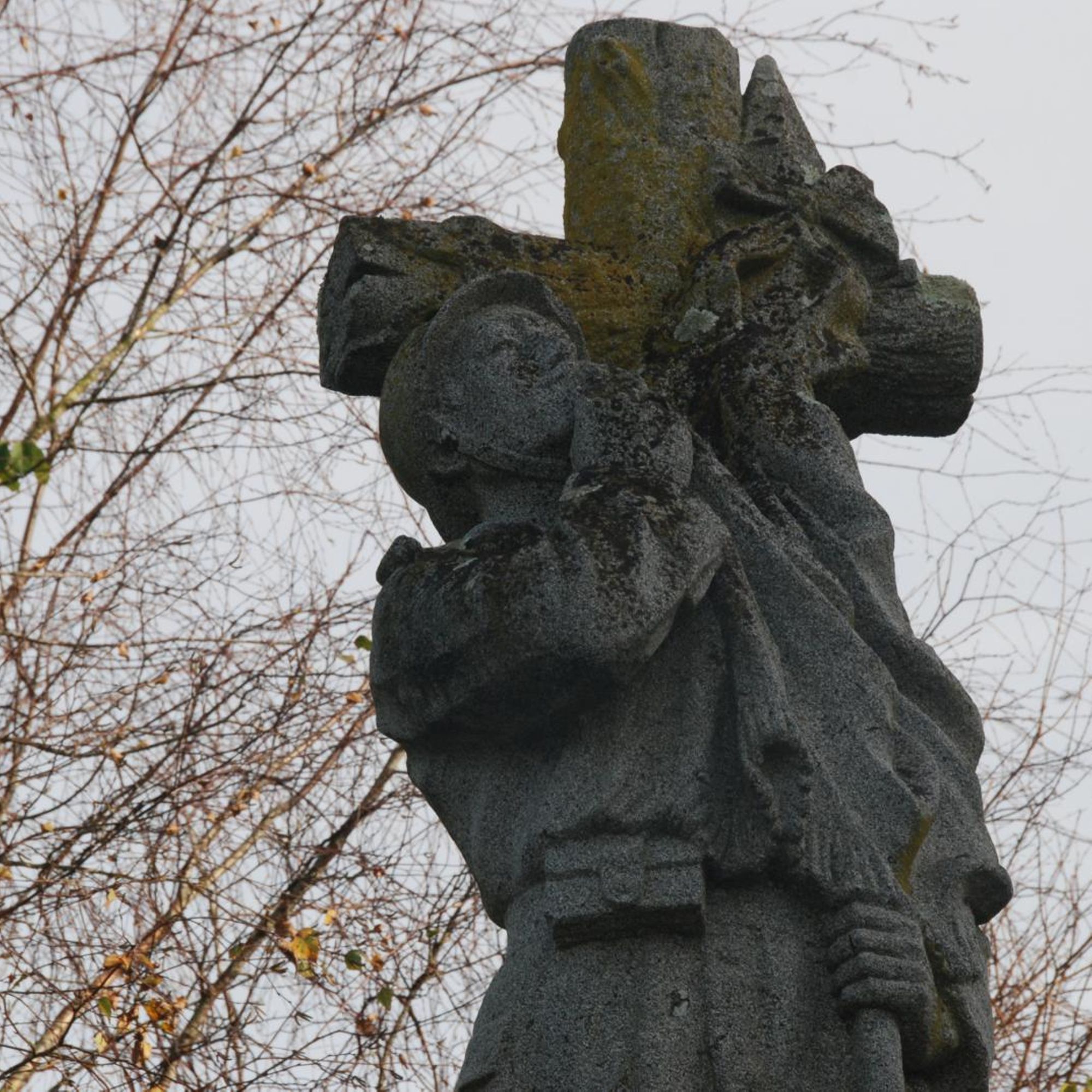 Soldat tenant un drapeau devant une croix latine sur un piédestal