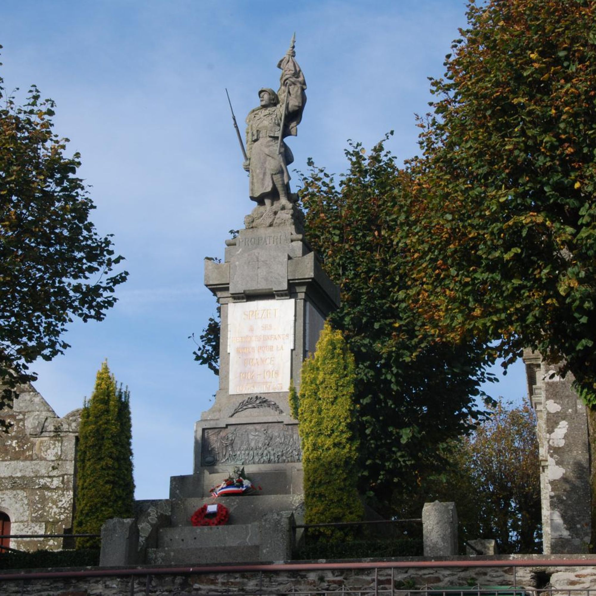 - Un poilu debout avec un fusil à baïonnette et drapeau sur un piédestal crénelé comportant 2 bas-reliefs en cuivre montrant une scène de guerre dans les tranchées et le défilé des vainqueurs.