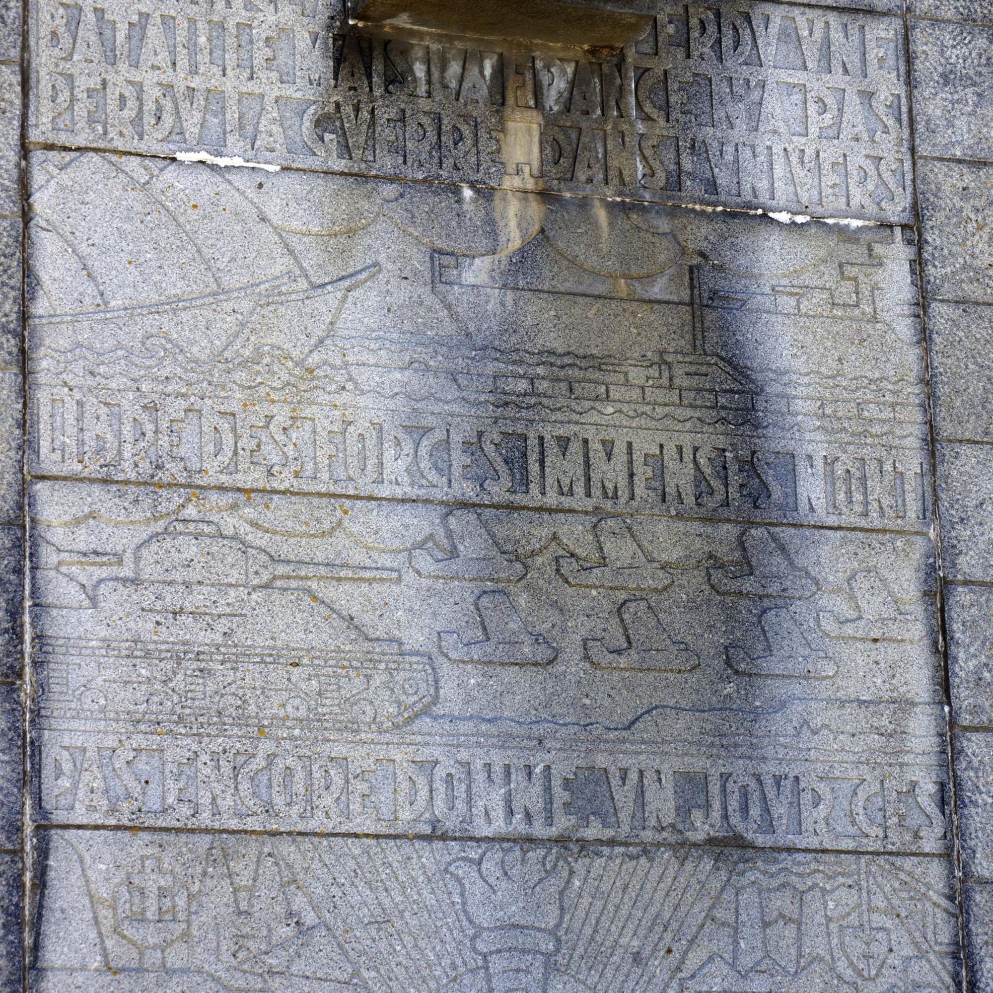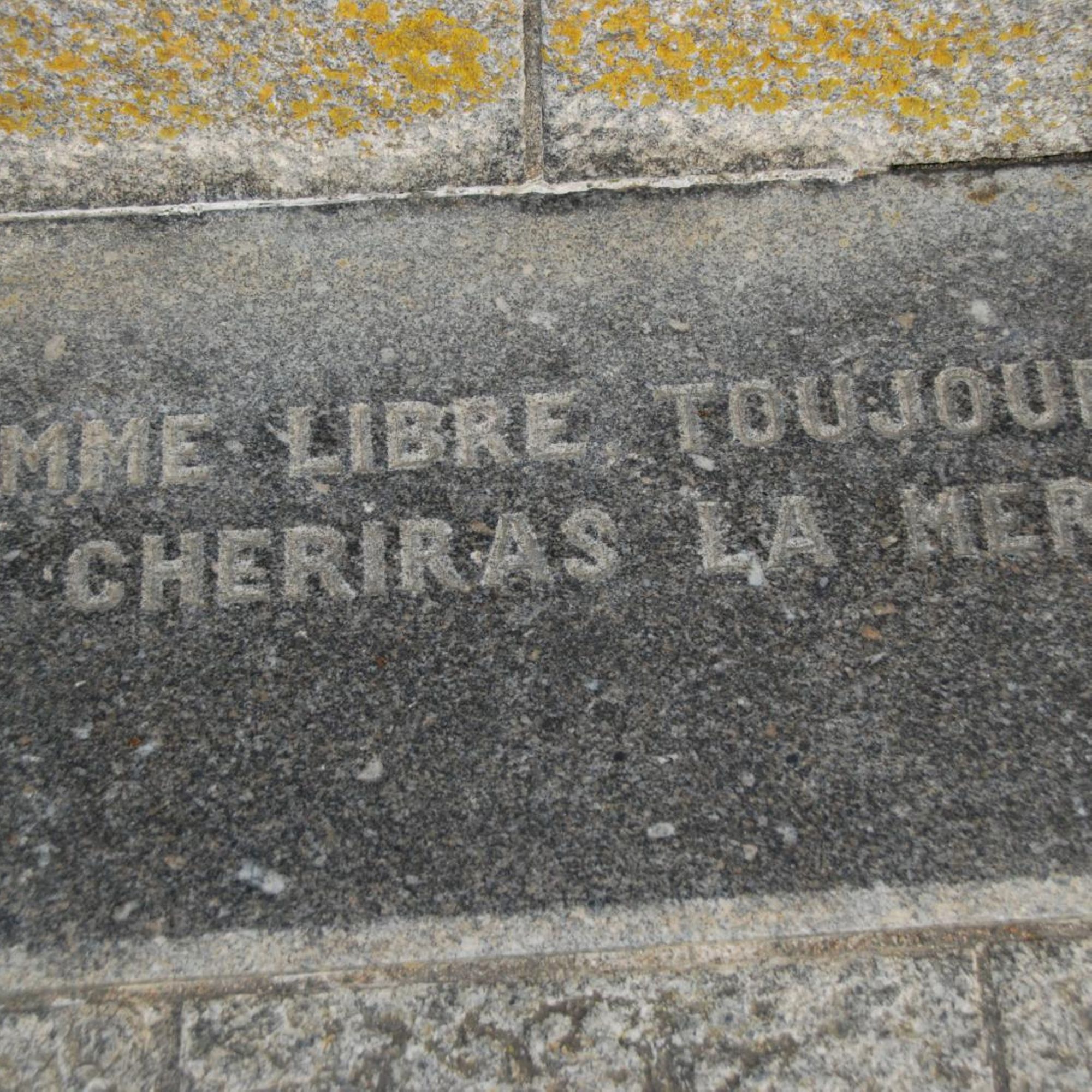 Sur le socle, une plaque de marbre reprend un vers de Baudelaire : « homme libre toujours tu chériras la mer ». Une petite croix de Lorraine est sculptée sur la face postérieure du monument.