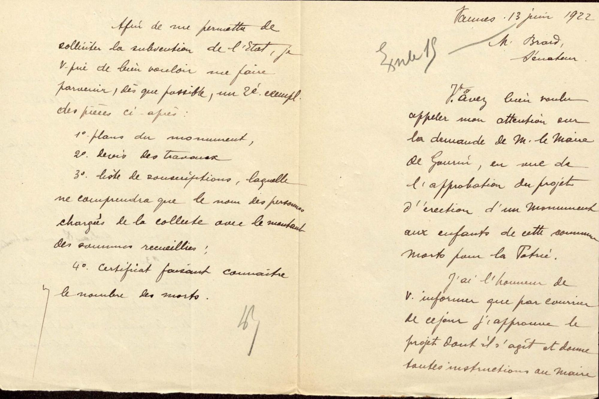 Approbation du projet d'érection du monument par le préfet pour recevoir son exécution du marché de gré à gré : arrêté préfectoral (13 juin 1922).