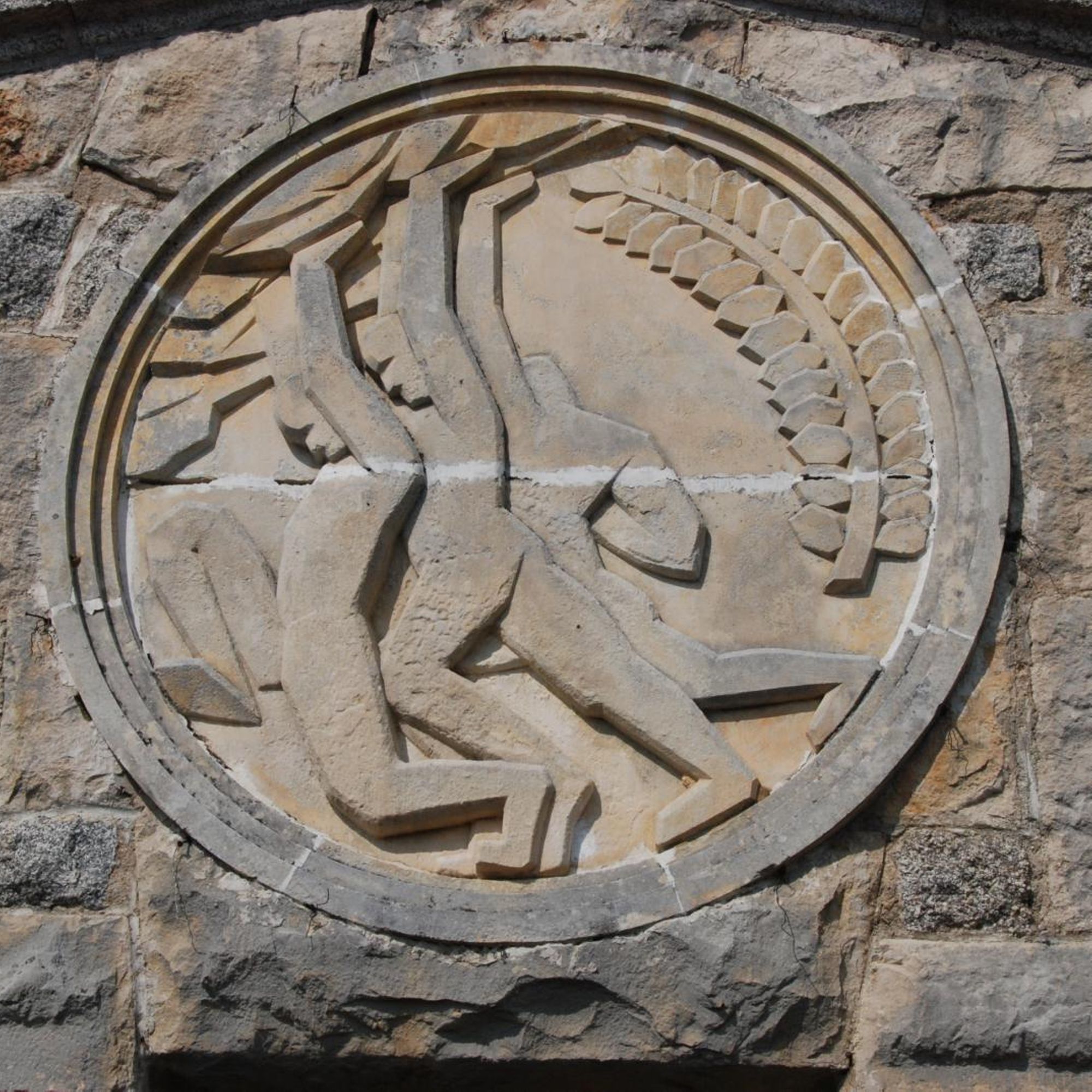 Mur épais en pierre percé de 3 trous avec un bas-relief représentant des hommes soutenant le monde