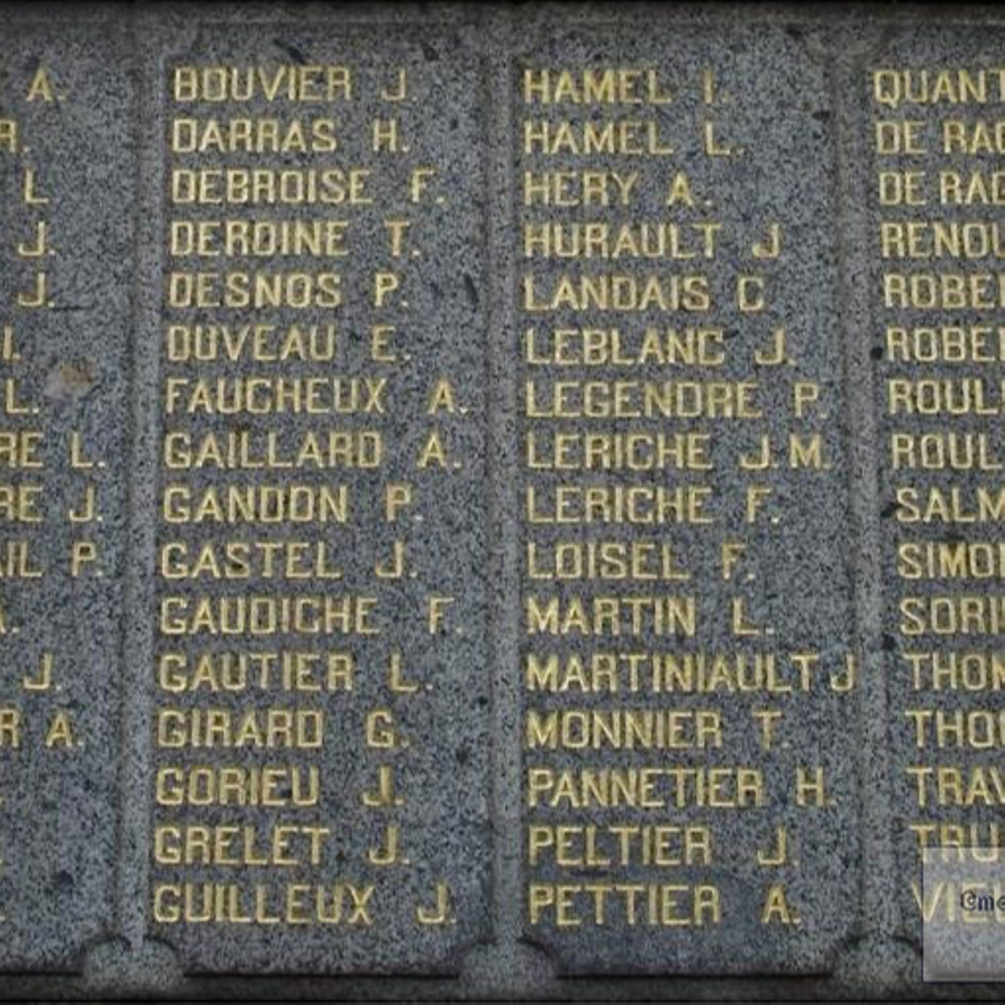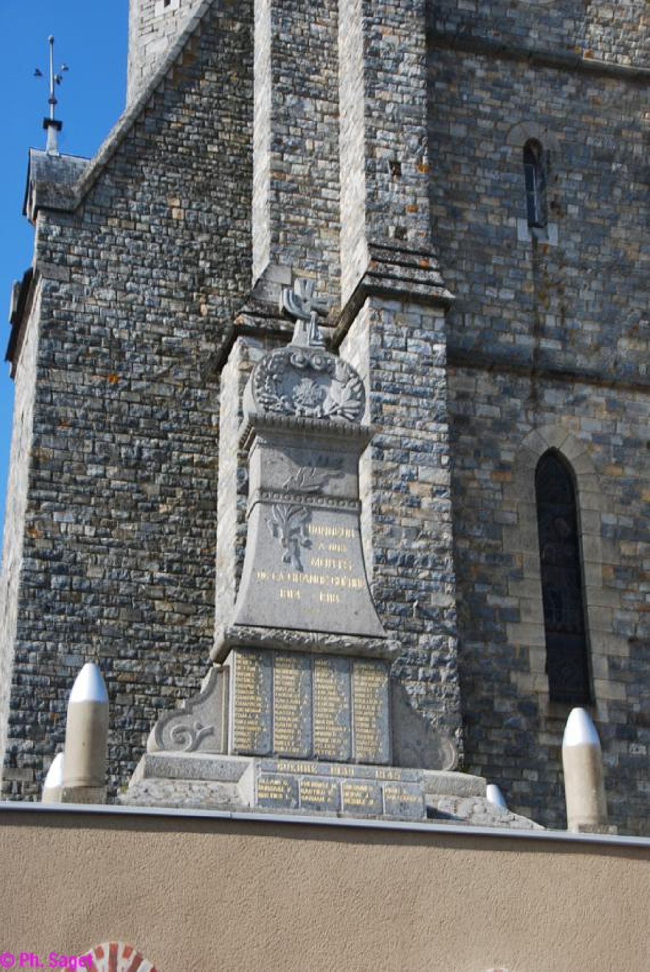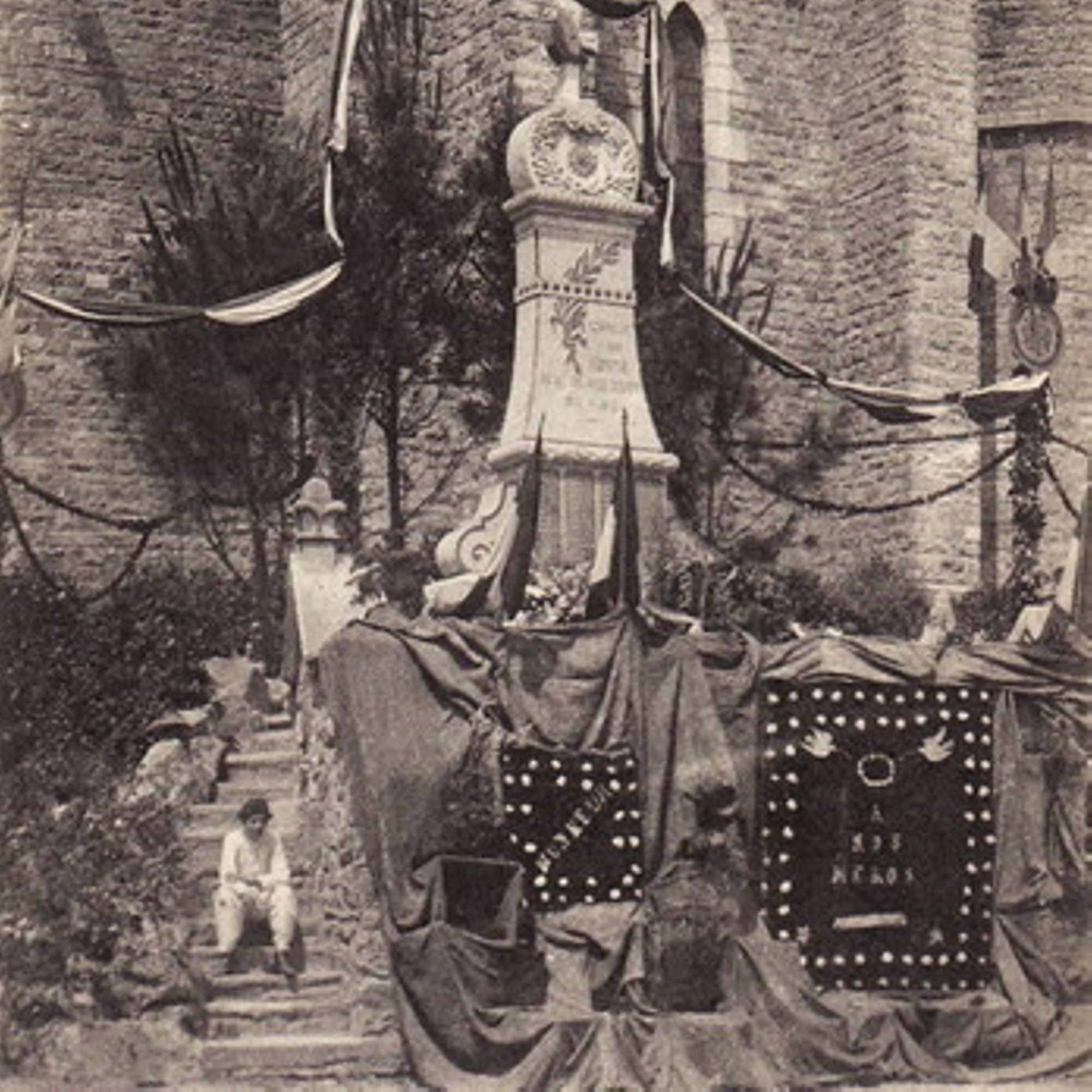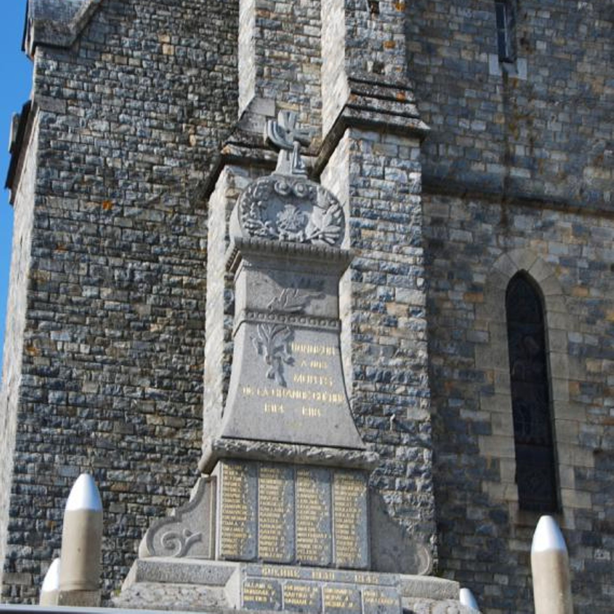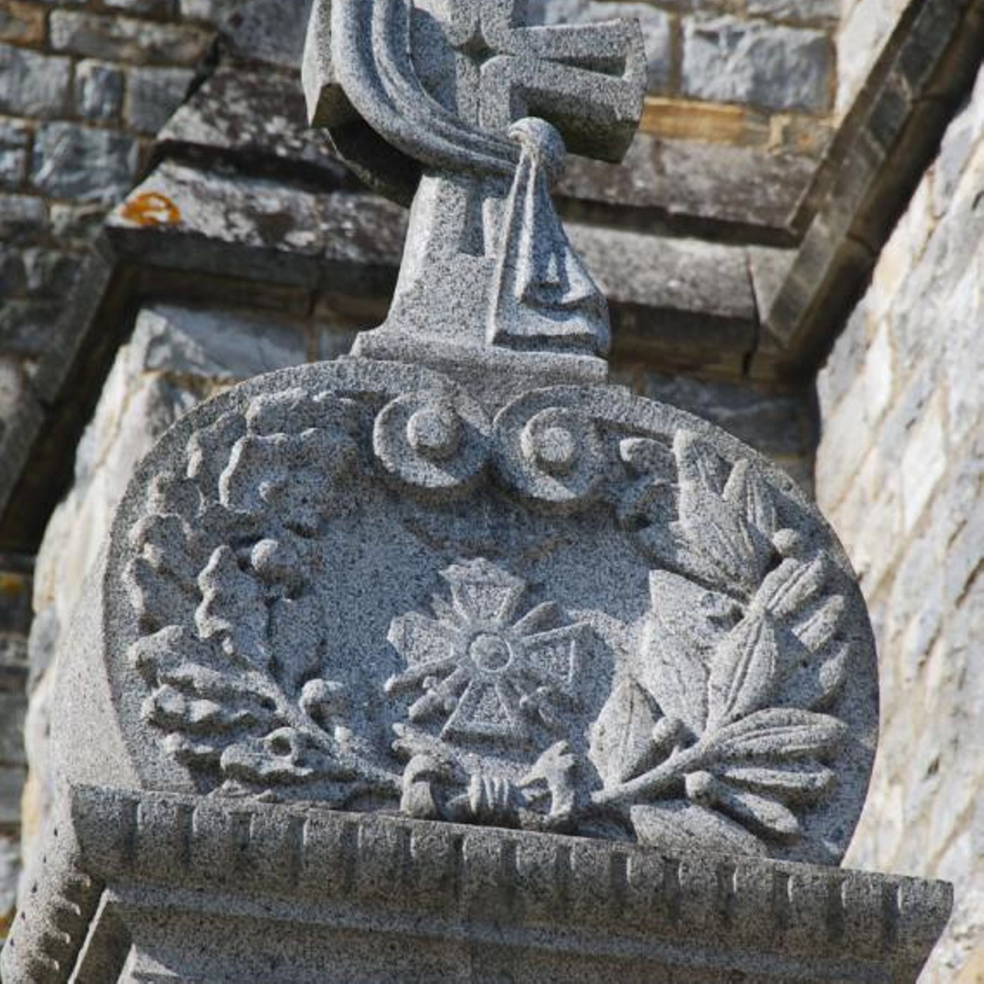 Colonne quadrangulaire avec couronne d'olivier et de chêne entourant la croix de guerre et une croix latine voilée au sommet