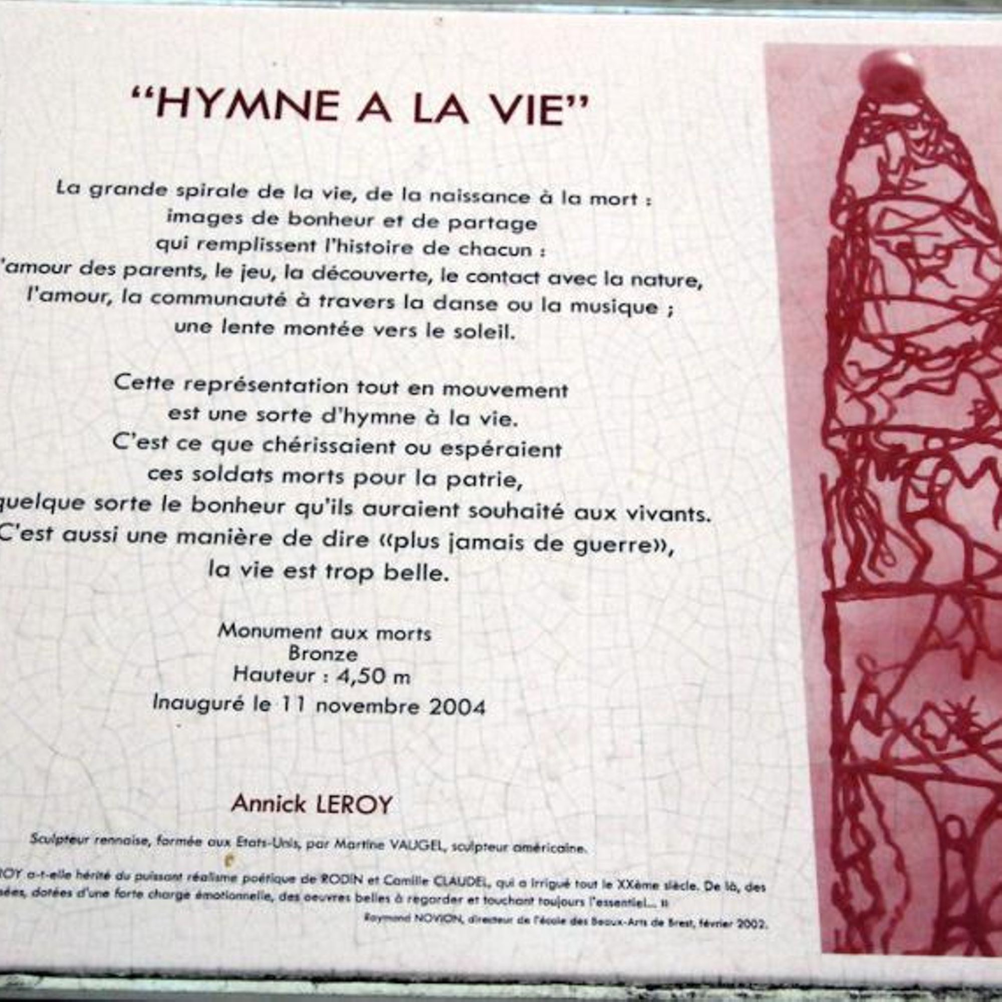 Monument inauguré le 11 novembre 2004 en remplacement de l'ancien. Les trois plaques de marbres de l'ancien monument sont disposées au pied du nouveau - "Hymne à la vie - La grande spirale de la vie, de la naissance à la mort : images de bonheur et de partage qui remplissent l'histoire de chacun - l'amour des parents, le jeu, la découverte, le contact avec la nature, l'amour, la communauté à travers la danse ou la musique, une lente montée vers le soleil. Cette représentation tout en mouvement est une sorte d'hymne à la vie. C'est ce que chérissaient ou espéraient ces soldats morts pour la patrie, en quelque sorte le bonheur qu'ils auraient souhaité aux vivants. C'est aussi une manière de dire "plus jamais de guerre", la vie est trop belle."