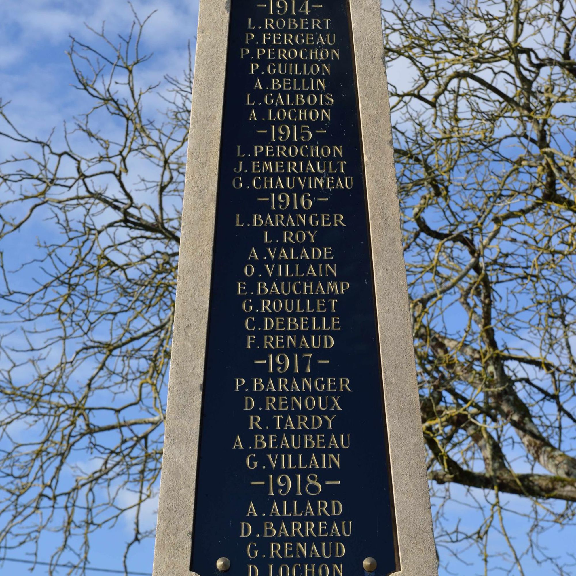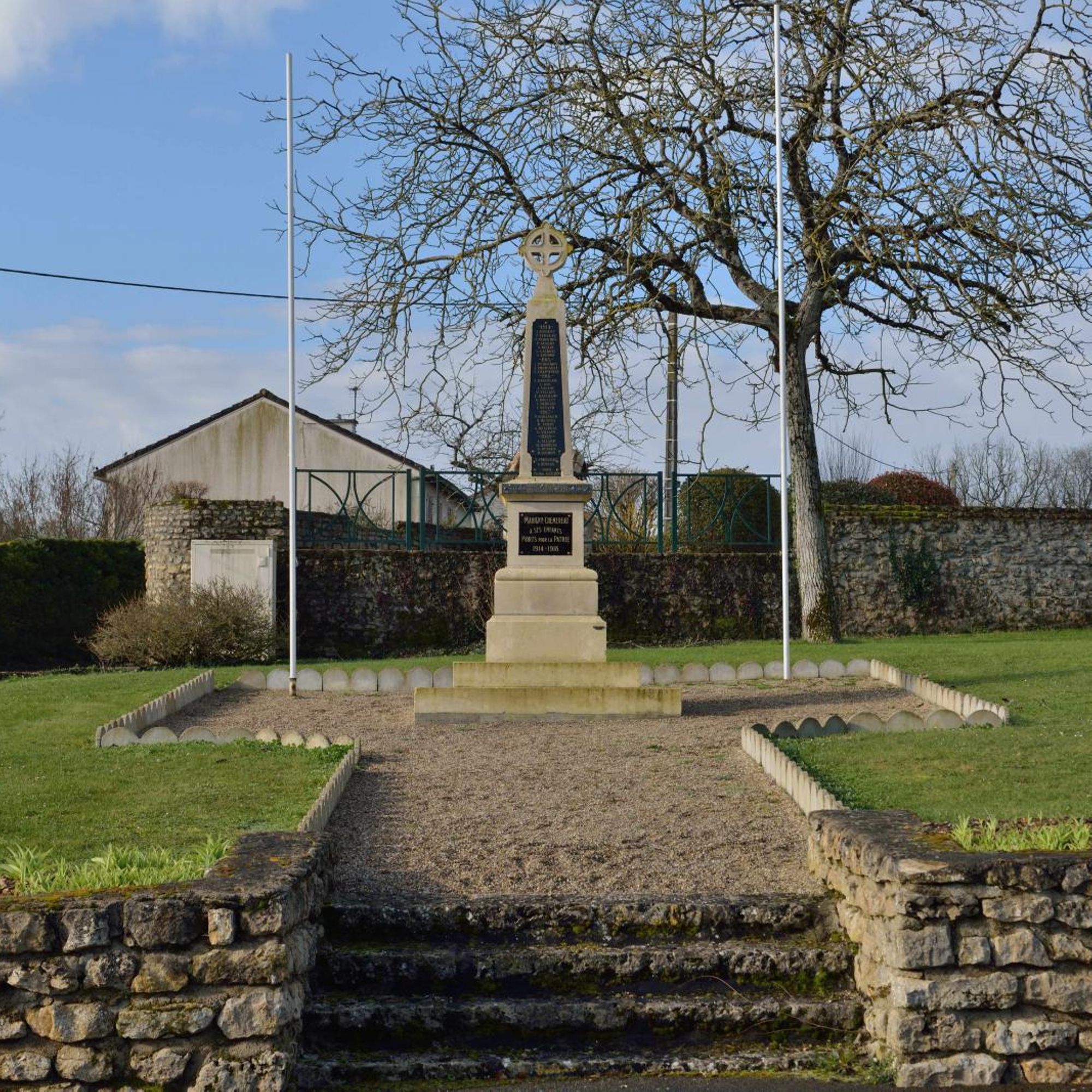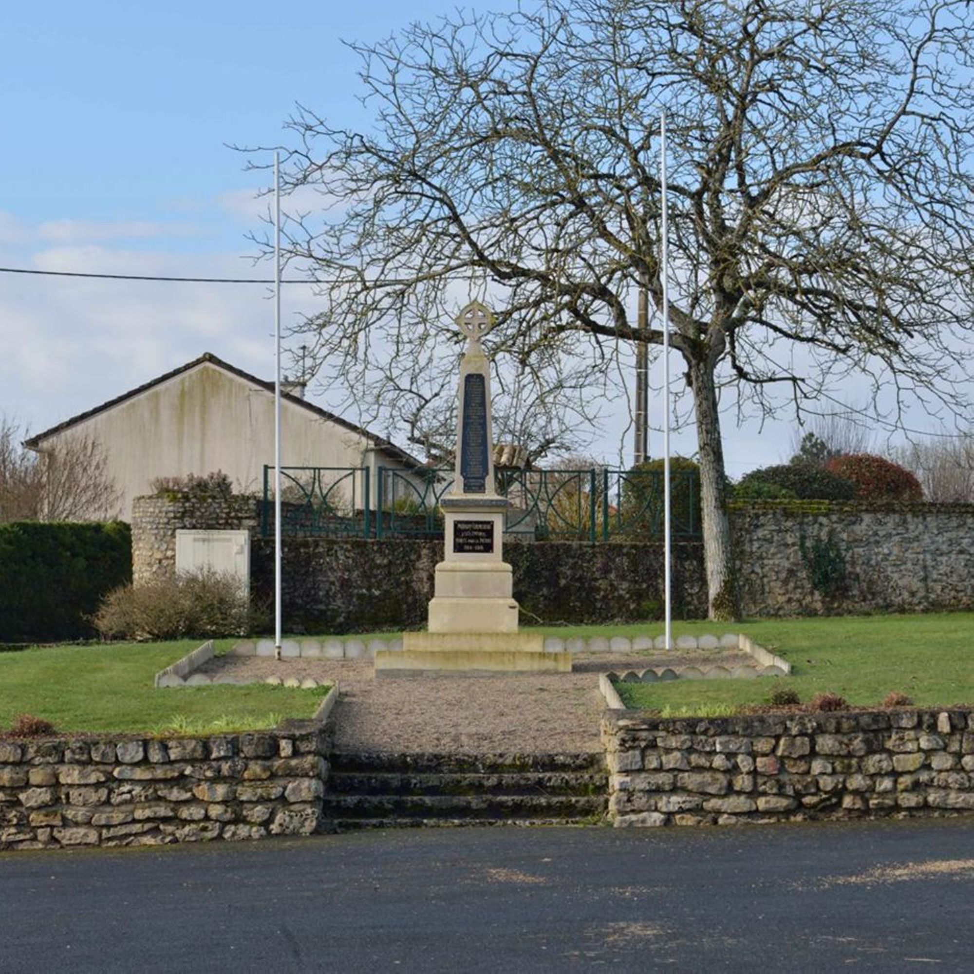 Monument stèle surmonté d'une croix avec la liste des morts de la guerre 14-18, un mort pour 39-45 et une plaque à la mémoire des français d'outre-mer morts pour la patrie (sans mention de noms)