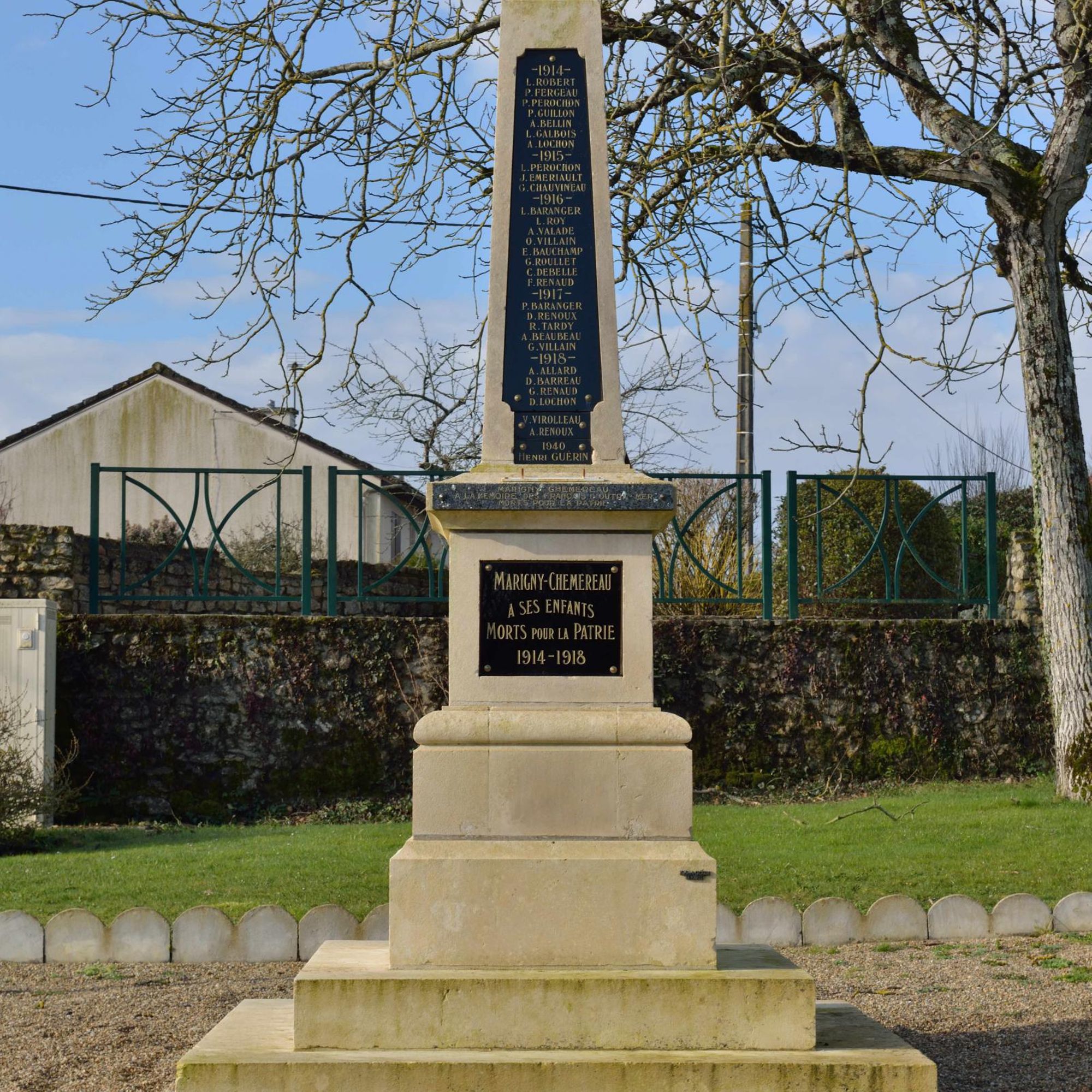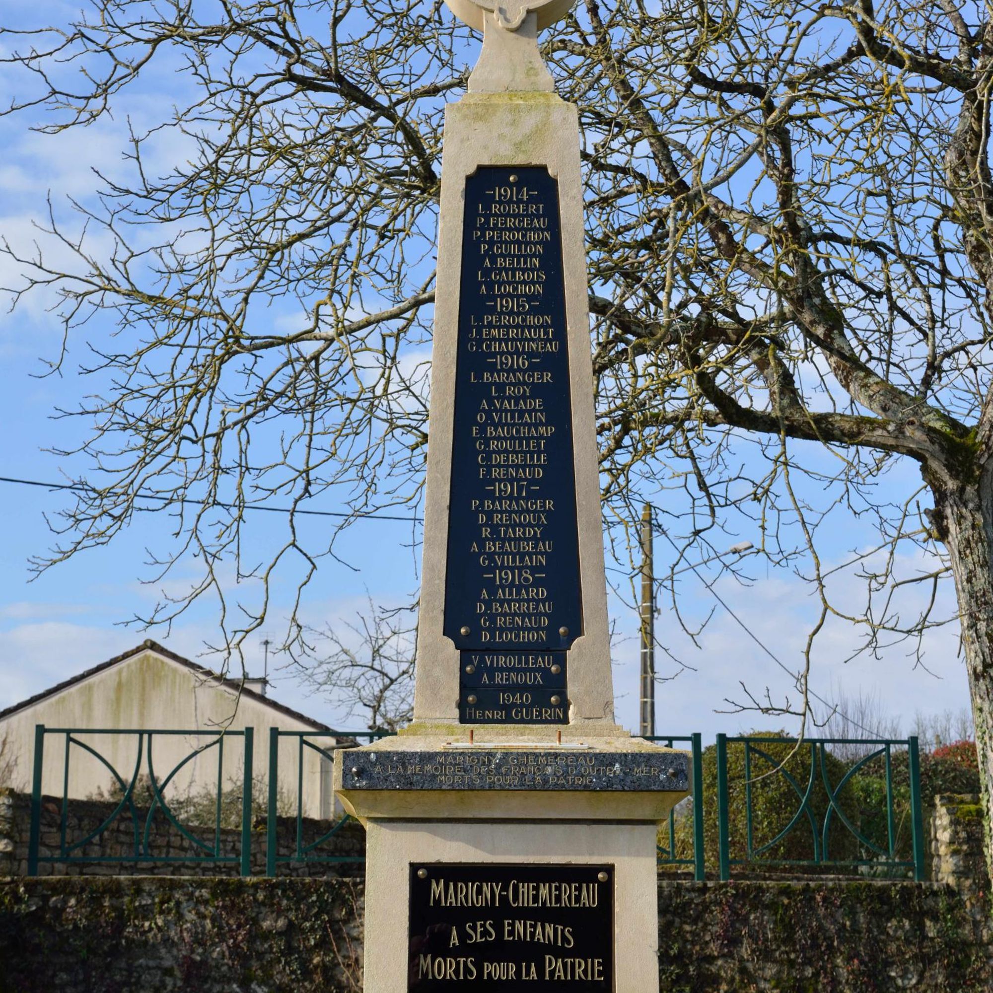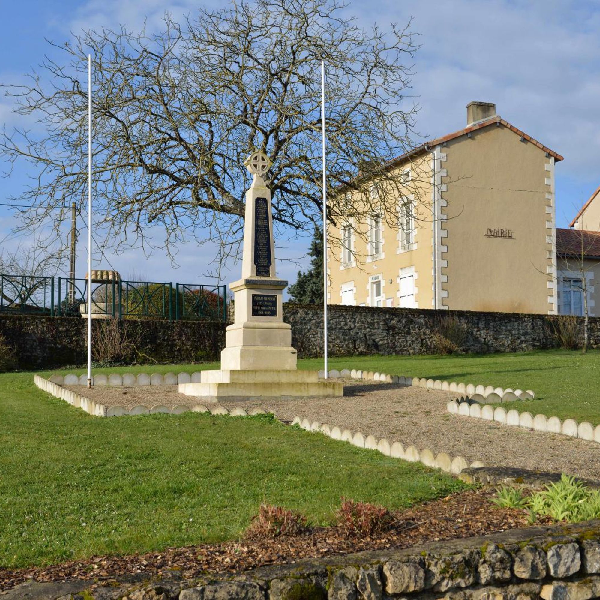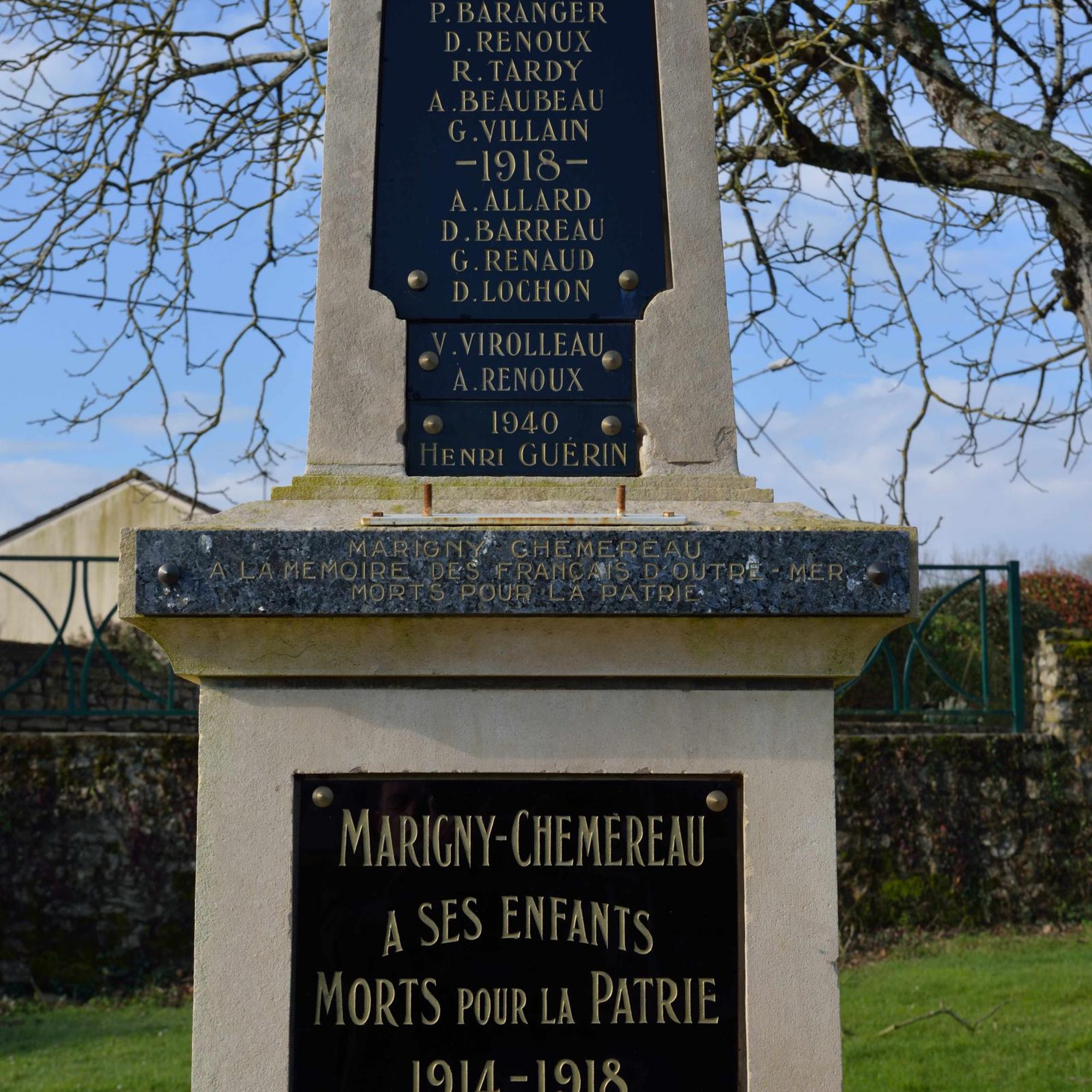 Monument stèle surmonté d'une croix avec la liste des morts de la guerre 14-18, un mort pour 39-45 et une plaque à la mémoire des français d'outre-mer morts pour la patrie (sans mention de noms)