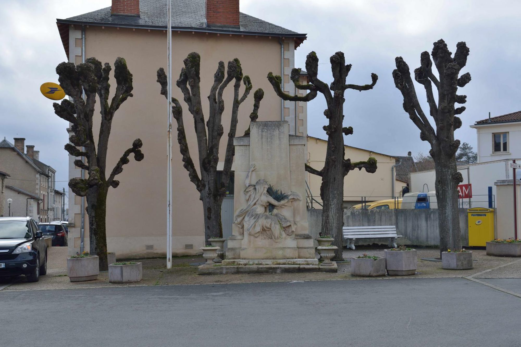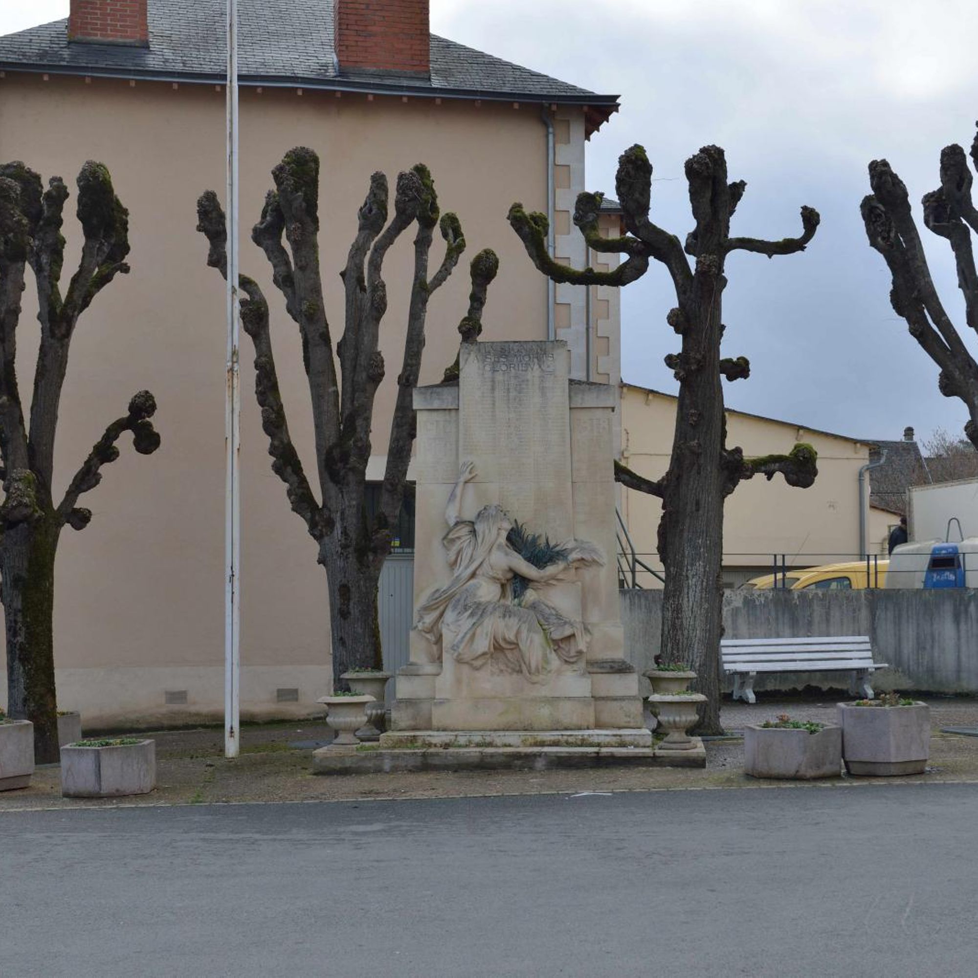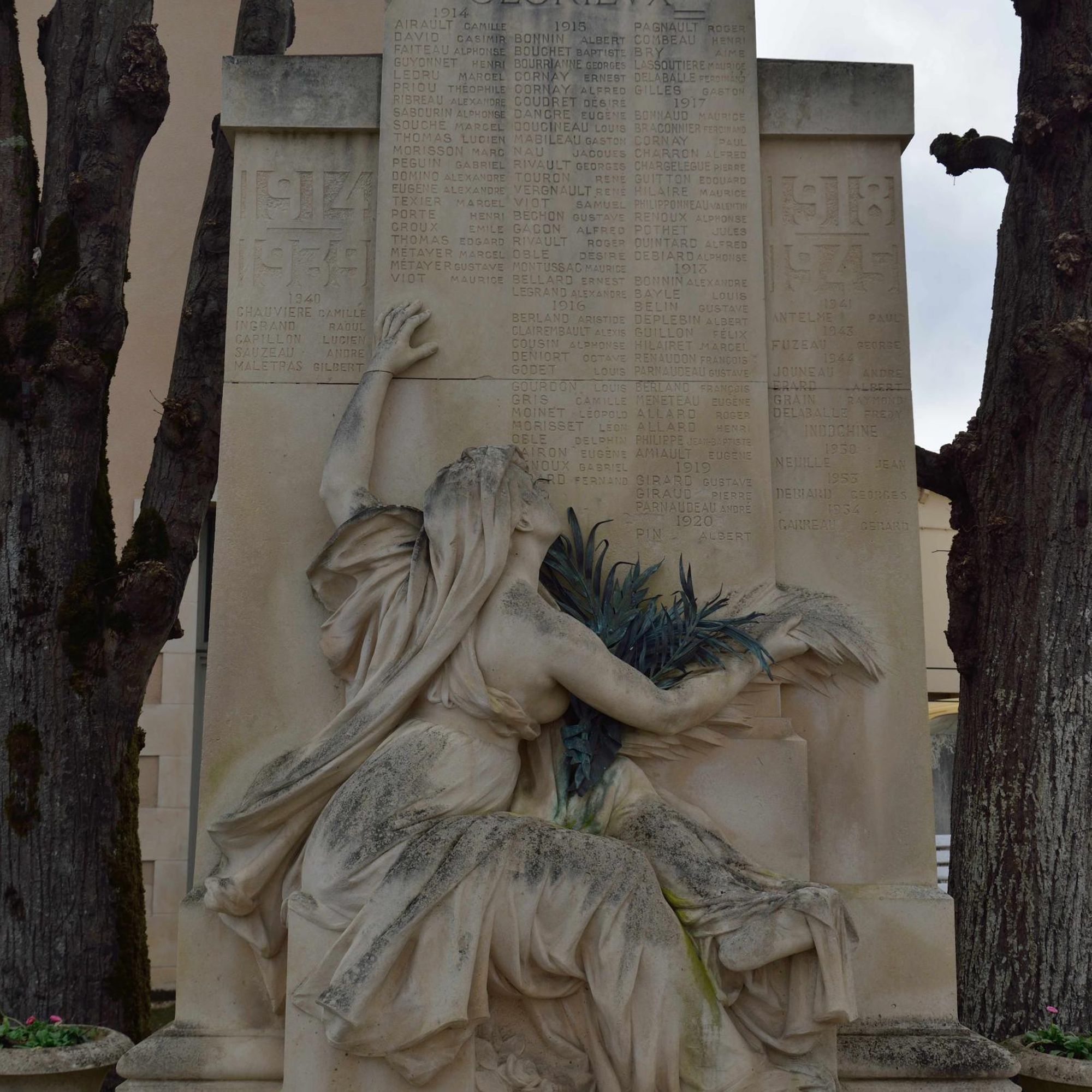Le monument aux morts se compose d'une stèle en calcaire portant la liste des victimes de la Première Guerre mondiale, complétée après la Seconde, et d'une figure féminine due au sculpteur Aimé Octobre. Bien qu'elle ait été décrite lors de l’inauguration comme « une femme, une mère, tend aux héros la palme du martyre » (Avenir de la Vienne, cité par Vouhé, 2014), elle a été classée d'après ses attributs parmi les allégories de la République. Sa tête est couverte d'un voile de veuve. Pieds nus, elle est assise sur un petit socle, de dos, légèrement de trois quarts, indiquant de la main gauche la liste des morts glorieux et tenant dans la main droite une palme en bronze ; l'épaule droite est dénudée, les seins nus.