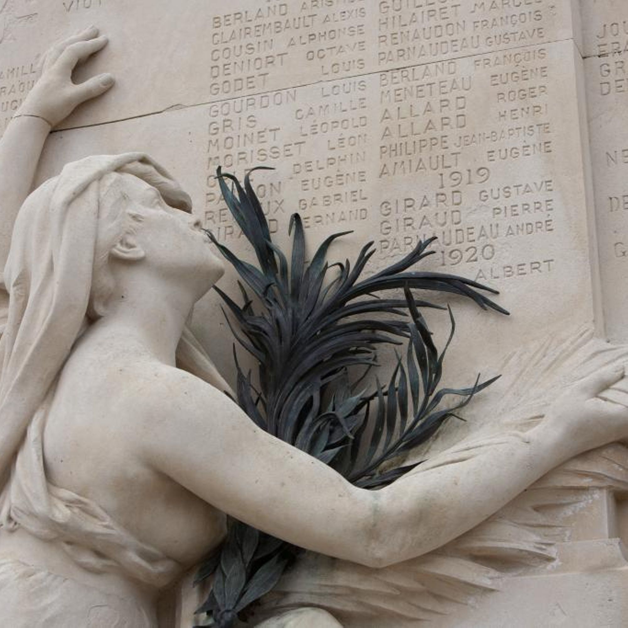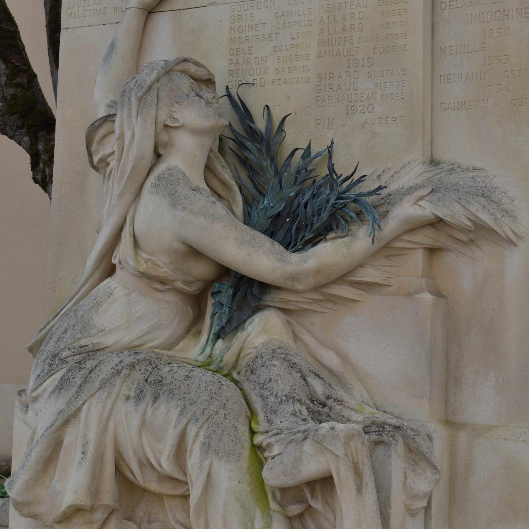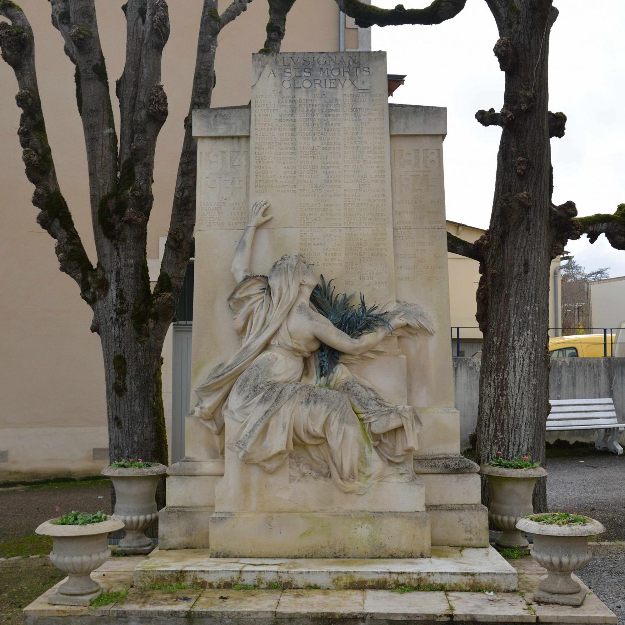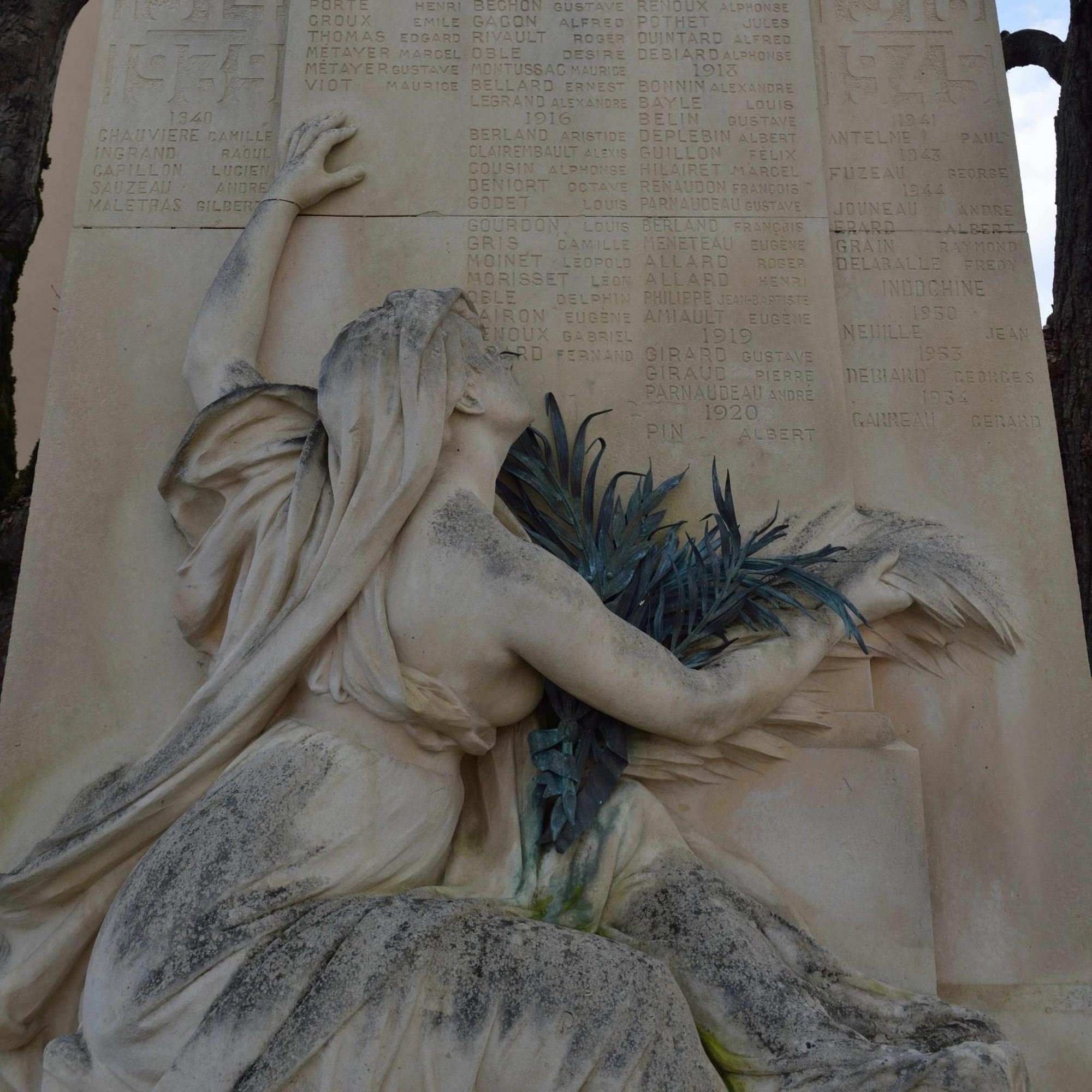 Le monument aux morts se compose d'une stèle en calcaire portant la liste des victimes de la Première Guerre mondiale, complétée après la Seconde, et d'une figure féminine due au sculpteur Aimé Octobre. Bien qu'elle ait été décrite lors de l’inauguration comme « une femme, une mère, tend aux héros la palme du martyre » (Avenir de la Vienne, cité par Vouhé, 2014), elle a été classée d'après ses attributs parmi les allégories de la République. Sa tête est couverte d'un voile de veuve. Pieds nus, elle est assise sur un petit socle, de dos, légèrement de trois quarts, indiquant de la main gauche la liste des morts glorieux et tenant dans la main droite une palme en bronze ; l'épaule droite est dénudée, les seins nus.