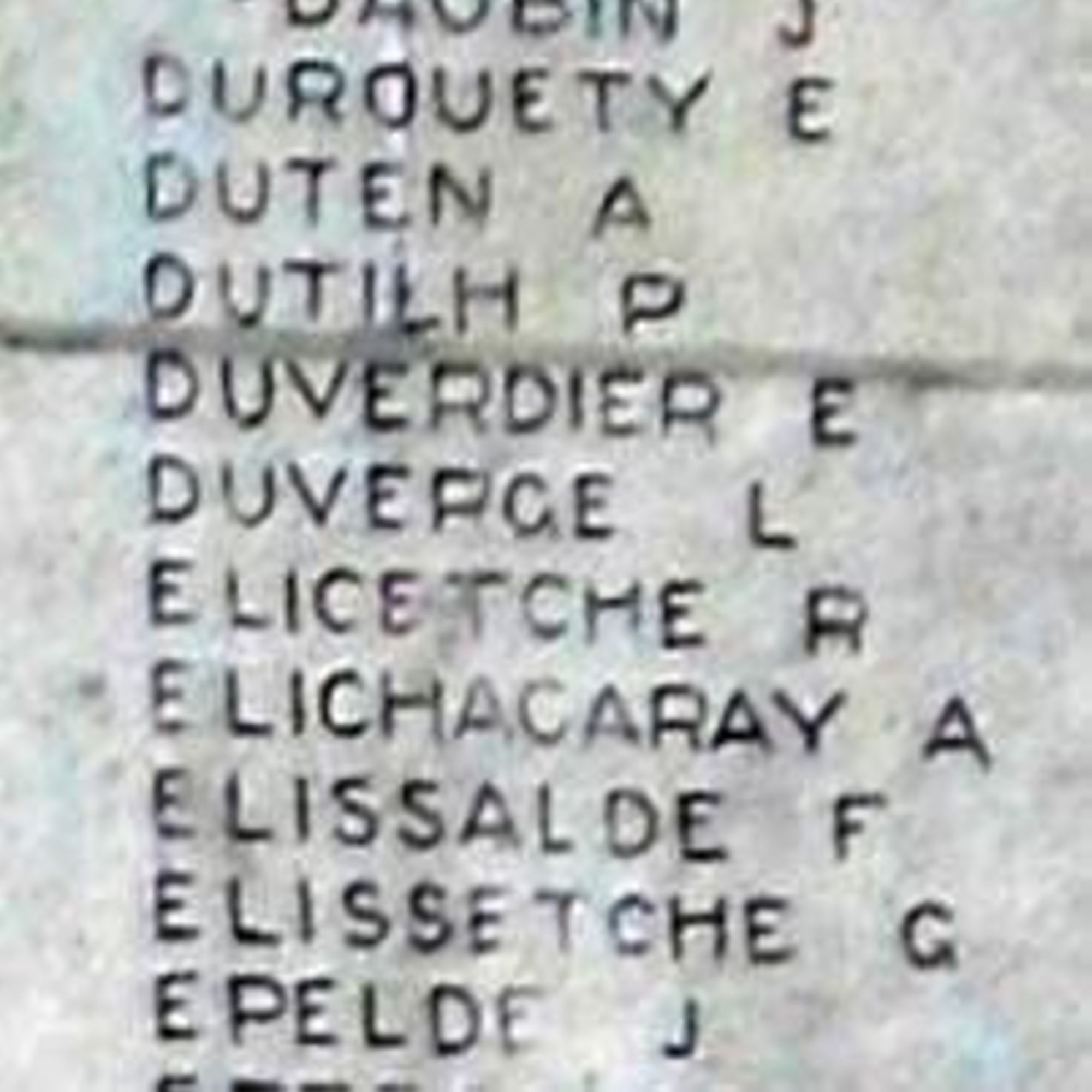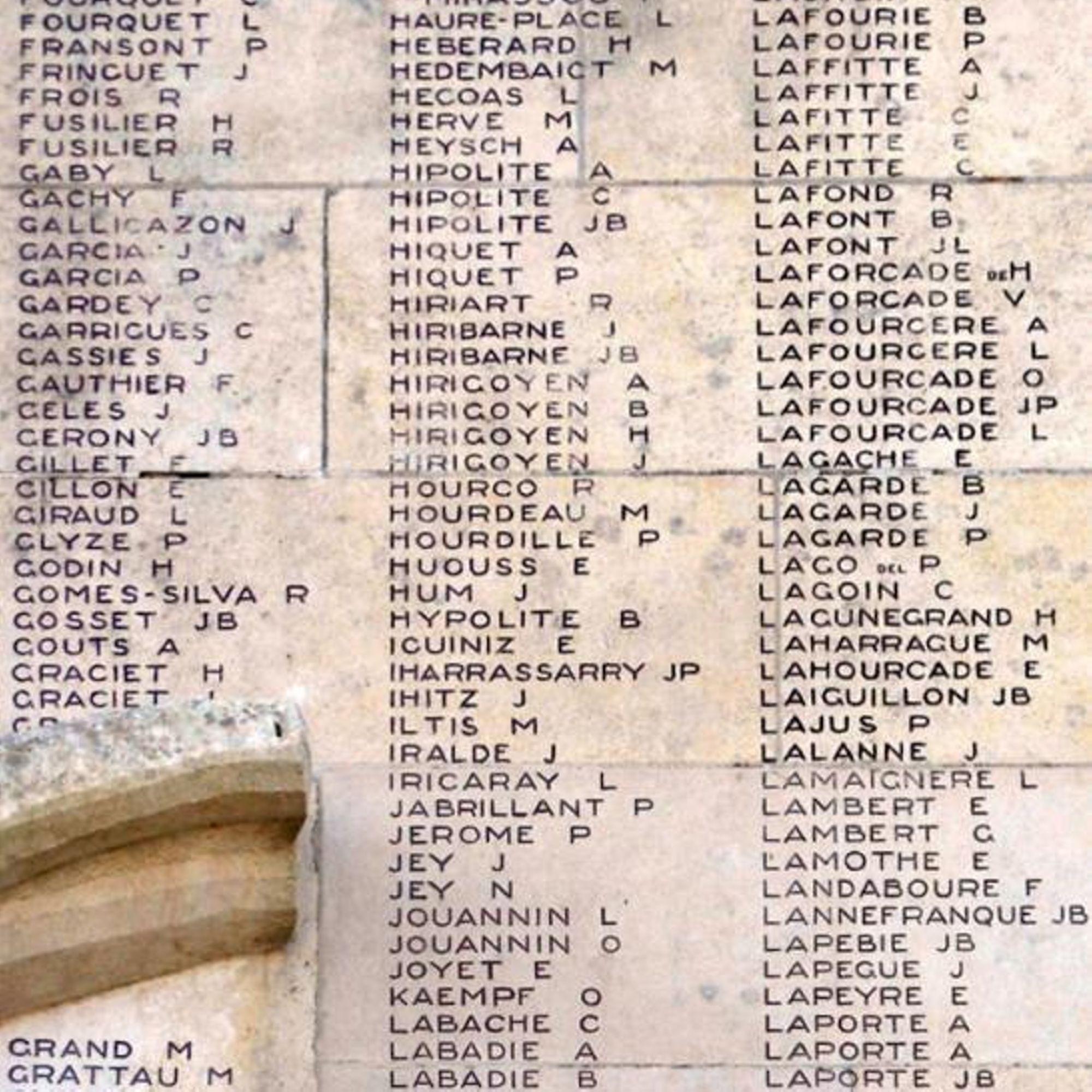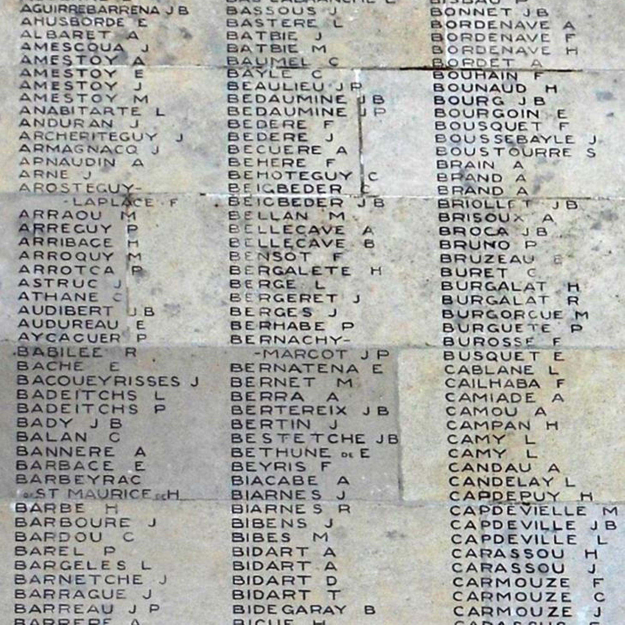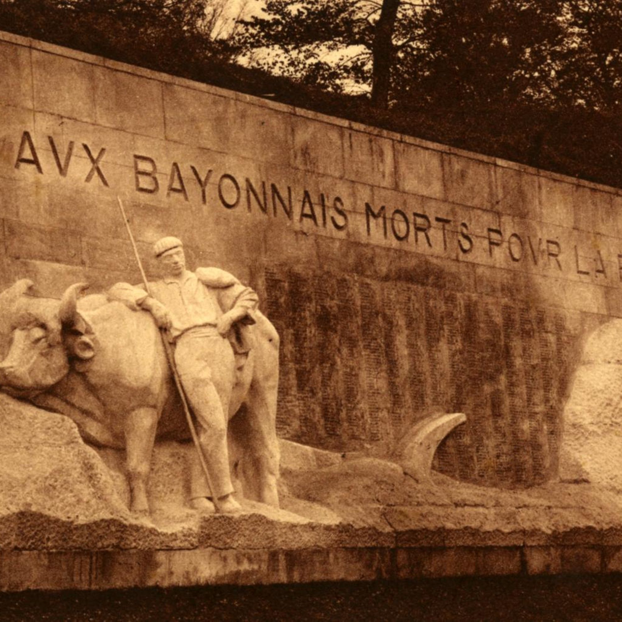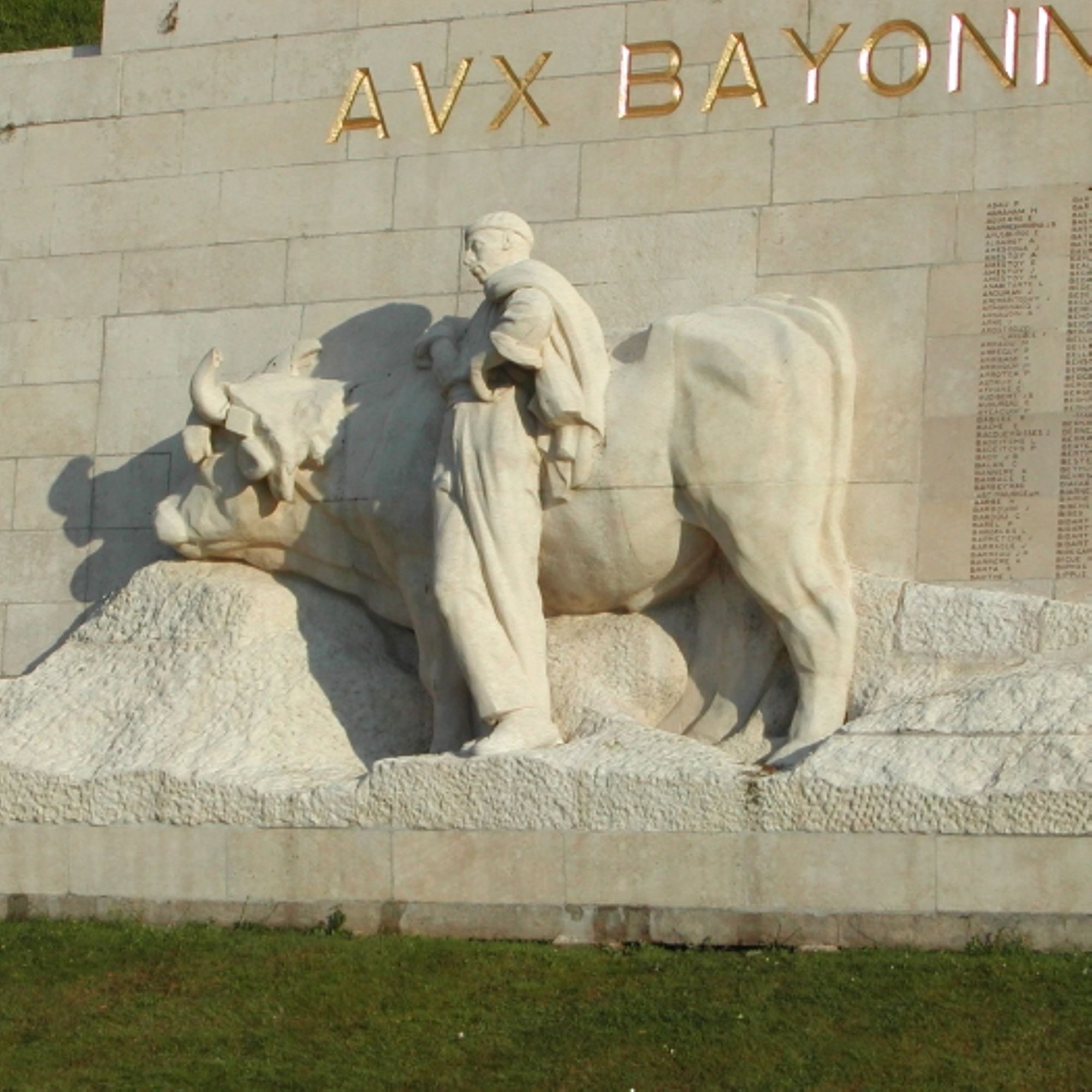 - Long mur sur lequel s’appuient deux statues encadrant la liste des morts : d’un côté, le paysan basque, accompagné de son bœuf, qui tire une charrue, et de l’autre, un Poilu de garde.