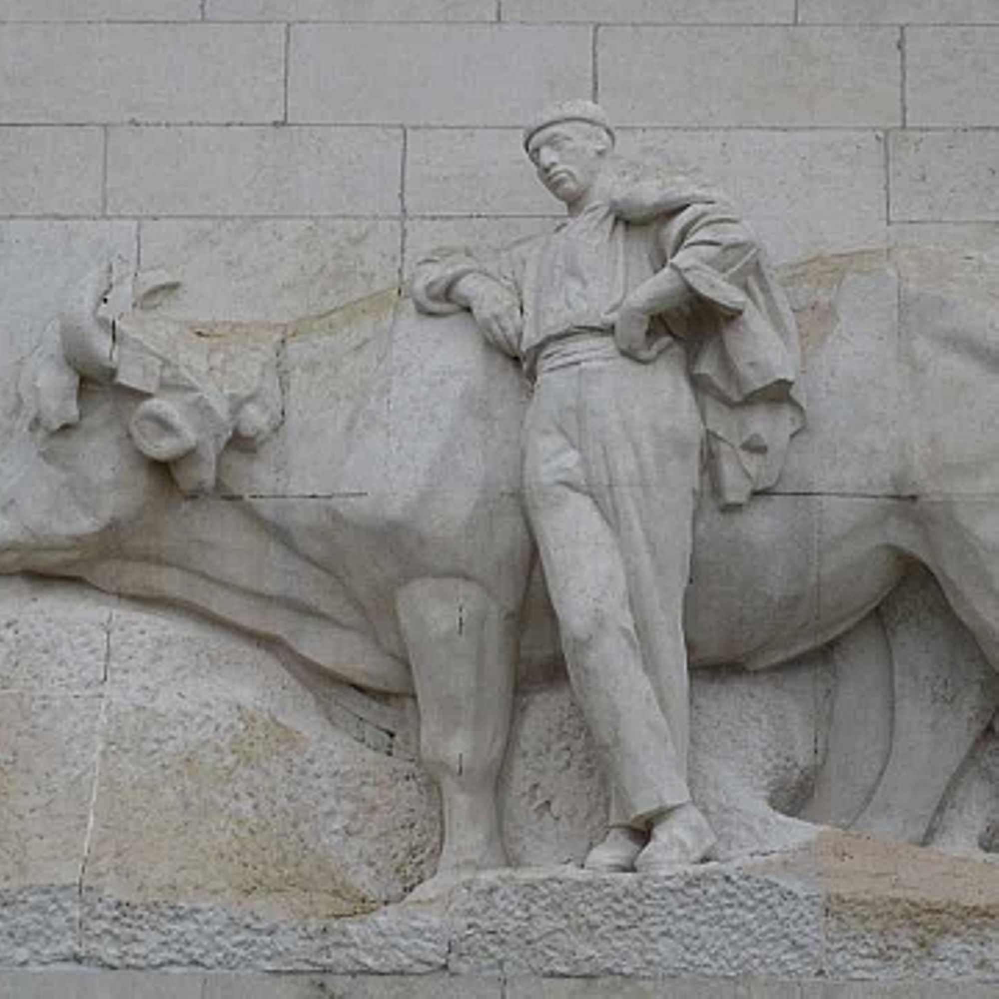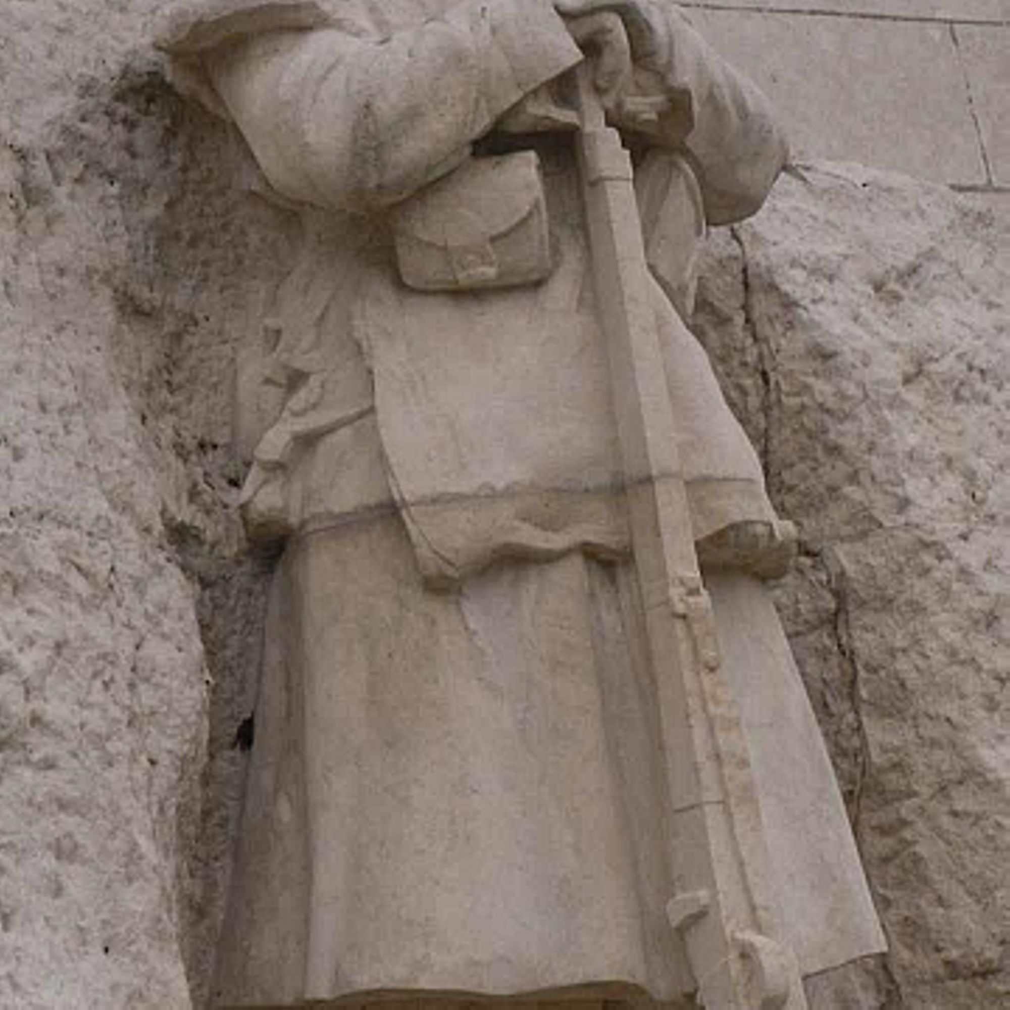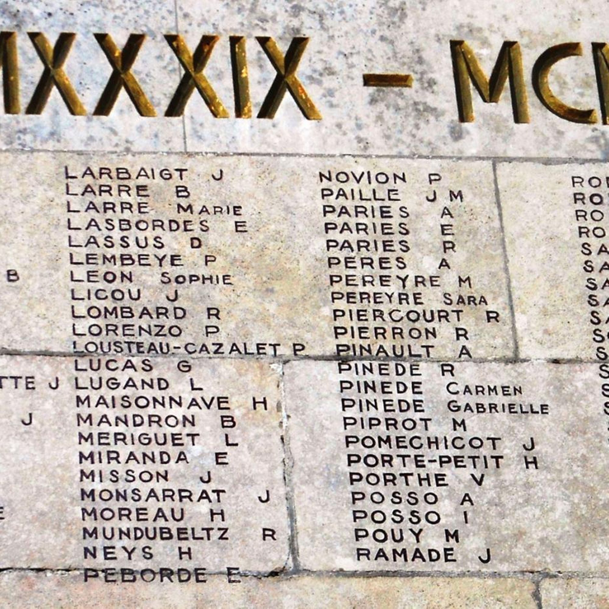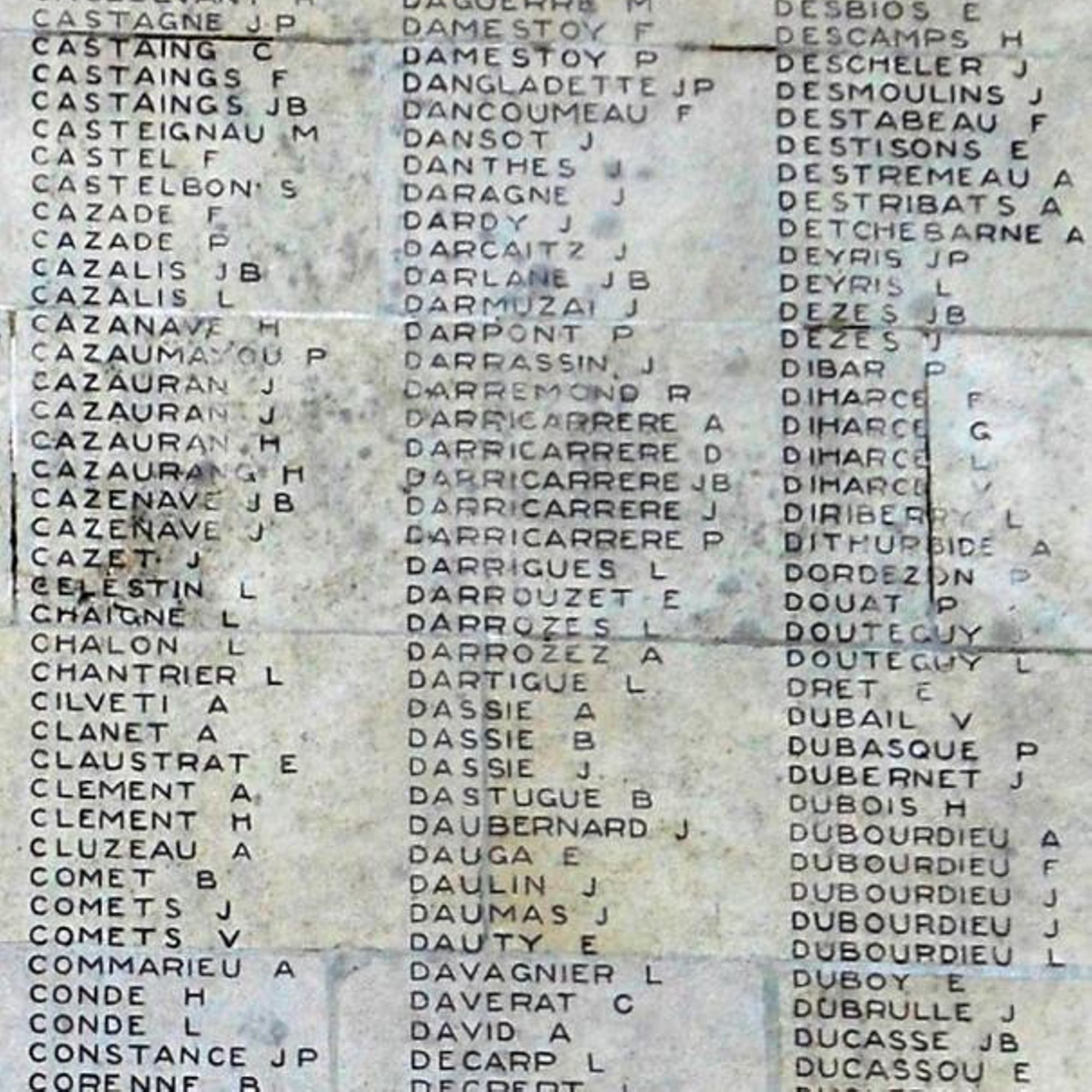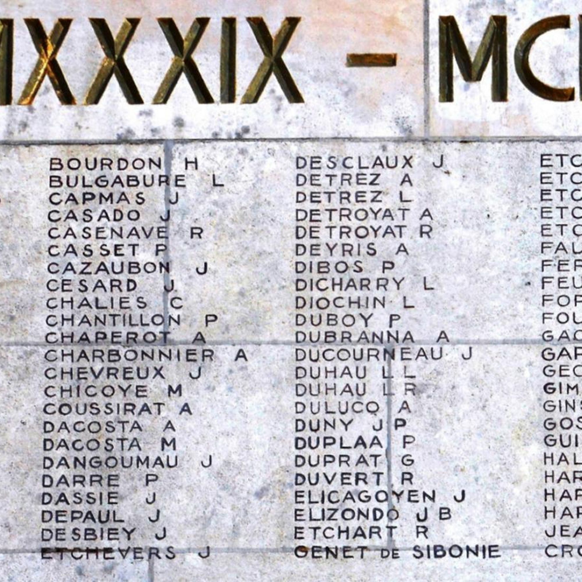 - Long mur sur lequel s’appuient deux statues encadrant la liste des morts : d’un côté, le paysan basque, accompagné de son bœuf, qui tire une charrue, et de l’autre, un Poilu de garde.